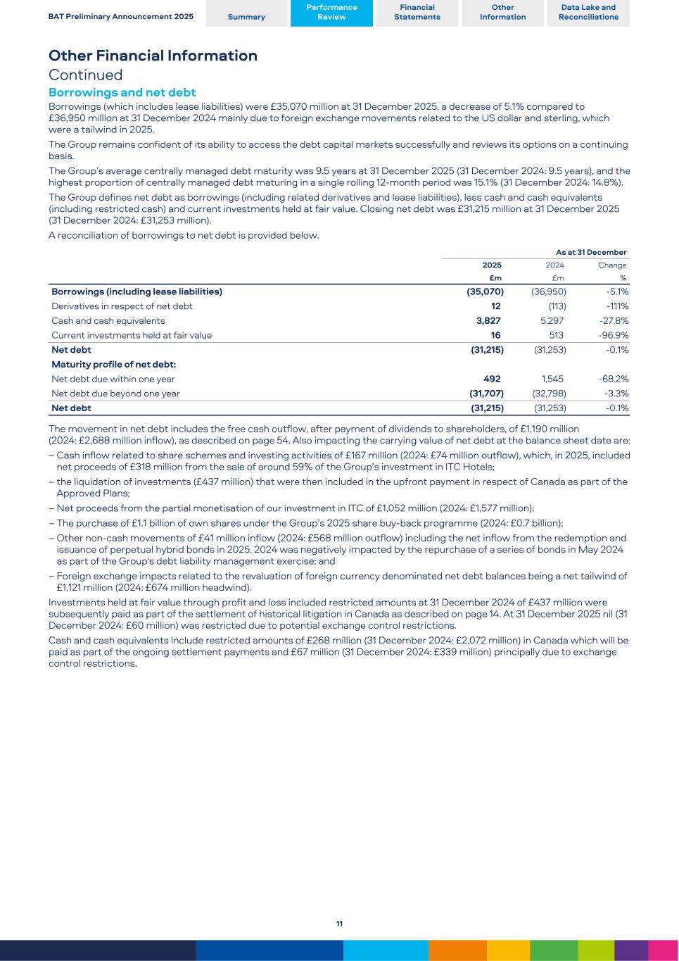 Other Financial Information Continued Borrowings and net debt Borrowings (which includes lease liabilities) were £35,070 million at 31 December 2025, a decrease of 5.1% compared to £36,950 million at 31 December 2024 mainly due to foreign exchange movements related to the US dollar and sterling, which were a tailwind in 2025. The Group remains confident of its ability to access the debt capital markets successfully and reviews its options on a continuing basis. The Group’s average centrally managed debt maturity was 9.5 years at 31 December 2025 (31 December 2024: 9.5 years), and the highest proportion of centrally managed debt maturing in a single rolling 12-month period was 15.1% (31 December 2024: 14.8%). The Group defines net debt as borrowings (including related derivatives and lease liabilities), less cash and cash equivalents (including restricted cash) and current investments held at fair value. Closing net debt was £31,215 million at 31 December 2025 (31 December 2024: £31,253 million). A reconciliation of borrowings to net debt is provided below. As at 31 December 2025 2024 Change £m £m % Borrowings (including lease liabilities) (35,070) (36,950) -5.1 % Derivatives in respect of net debt 12 (113) -111 % Cash and cash equivalents 3,827 5,297 -27.8 % Current investments held at fair value 16 513 -96.9 % Net debt (31,215) (31,253) -0.1 % Maturity profile of net debt: Net debt due within one year 492 1,545 -68.2 % Net debt due beyond one year (31,707) (32,798) -3.3 % Net debt (31,215) (31,253) -0.1 % The movement in net debt includes the free cash outflow, after payment of dividends to shareholders, of £1,190 million (2024: £2,688 million inflow), as described on page 54. Also impacting the carrying value of net debt at the balance sheet date are: – Cash inflow related to share schemes and investing activities of £167 million (2024: £74 million outflow), which, in 2025, included net proceeds of £318 million from the sale of around 59% of the Group’s investment in ITC Hotels; – the liquidation of investments (£437 million) that were then included in the upfront payment in respect of Canada as part of the Approved Plans; – Net proceeds from the partial monetisation of our investment in ITC of £1,052 million (2024: £1,577 million); – The purchase of £1.1 billion of own shares under the Group’s 2025 share buy-back programme (2024: £0.7 billion); – Other non-cash movements of £41 million inflow (2024: £568 million outflow) including the net inflow from the redemption and issuance of perpetual hybrid bonds in 2025. 2024 was negatively impacted by the repurchase of a series of bonds in May 2024 as part of the Group's debt liability management exercise; and – Foreign exchange impacts related to the revaluation of foreign currency denominated net debt balances being a net tailwind of £1,121 million (2024: £674 million headwind). Investments held at fair value through profit and loss included restricted amounts at 31 December 2024 of £437 million were subsequently paid as part of the settlement of historical litigation in Canada as described on page 14. At 31 December 2025 nil (31 December 2024: £60 million) was restricted due to potential exchange control restrictions. Cash and cash equivalents include restricted amounts of £268 million (31 December 2024: £2,072 million) in Canada which will be paid as part of the ongoing settlement payments and £67 million (31 December 2024: £339 million) principally due to exchange control restrictions. BAT Preliminary Announcement 2025 Summary Performance Review Financial Statements Other Information Data Lake and Reconciliations 11