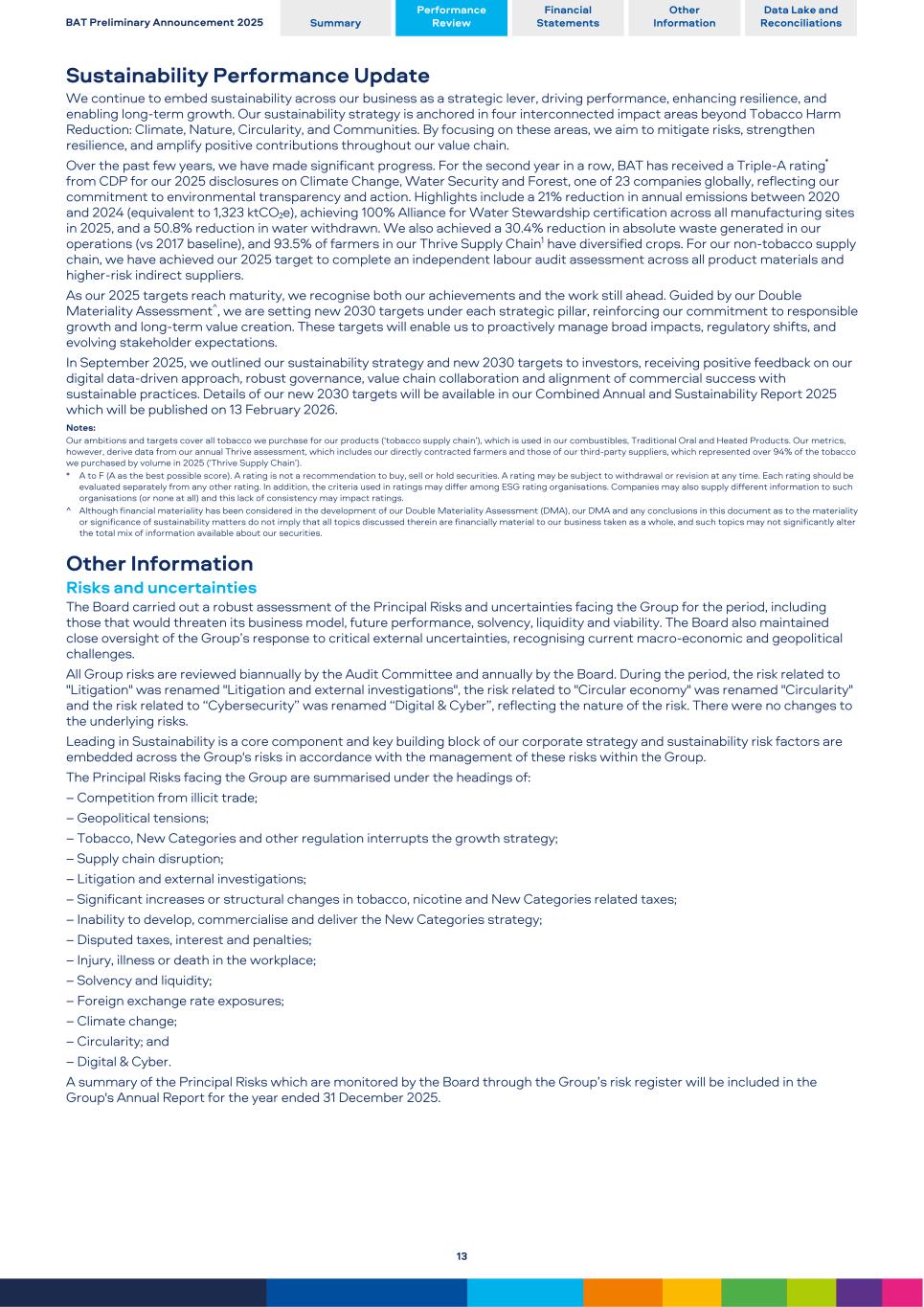 Sustainability Performance Update We continue to embed sustainability across our business as a strategic lever, driving performance, enhancing resilience, and enabling long-term growth. Our sustainability strategy is anchored in four interconnected impact areas beyond Tobacco Harm Reduction: Climate, Nature, Circularity, and Communities. By focusing on these areas, we aim to mitigate risks, strengthen resilience, and amplify positive contributions throughout our value chain. Over the past few years, we have made significant progress. For the second year in a row, BAT has received a Triple-A rating* from CDP for our 2025 disclosures on Climate Change, Water Security and Forest, one of 23 companies globally, reflecting our commitment to environmental transparency and action. Highlights include a 21% reduction in annual emissions between 2020 and 2024 (equivalent to 1,323 ktCO₂e), achieving 100% Alliance for Water Stewardship certification across all manufacturing sites in 2025, and a 50.8% reduction in water withdrawn. We also achieved a 30.4% reduction in absolute waste generated in our operations (vs 2017 baseline), and 93.5% of farmers in our Thrive Supply Chain1 have diversified crops. For our non-tobacco supply chain, we have achieved our 2025 target to complete an independent labour audit assessment across all product materials and higher-risk indirect suppliers. As our 2025 targets reach maturity, we recognise both our achievements and the work still ahead. Guided by our Double Materiality Assessment^, we are setting new 2030 targets under each strategic pillar, reinforcing our commitment to responsible growth and long-term value creation. These targets will enable us to proactively manage broad impacts, regulatory shifts, and evolving stakeholder expectations. In September 2025, we outlined our sustainability strategy and new 2030 targets to investors, receiving positive feedback on our digital data-driven approach, robust governance, value chain collaboration and alignment of commercial success with sustainable practices. Details of our new 2030 targets will be available in our Combined Annual and Sustainability Report 2025 which will be published on 13 February 2026. Notes: Our ambitions and targets cover all tobacco we purchase for our products (‘tobacco supply chain’), which is used in our combustibles, Traditional Oral and Heated Products. Our metrics, however, derive data from our annual Thrive assessment, which includes our directly contracted farmers and those of our third-party suppliers, which represented over 94% of the tobacco we purchased by volume in 2025 (‘Thrive Supply Chain’). * A to F (A as the best possible score). A rating is not a recommendation to buy, sell or hold securities. A rating may be subject to withdrawal or revision at any time. Each rating should be evaluated separately from any other rating. In addition, the criteria used in ratings may differ among ESG rating organisations. Companies may also supply different information to such organisations (or none at all) and this lack of consistency may impact ratings. ^ Although financial materiality has been considered in the development of our Double Materiality Assessment (DMA), our DMA and any conclusions in this document as to the materiality or significance of sustainability matters do not imply that all topics discussed therein are financially material to our business taken as a whole, and such topics may not significantly alter the total mix of information available about our securities. Other Information Risks and uncertainties The Board carried out a robust assessment of the Principal Risks and uncertainties facing the Group for the period, including those that would threaten its business model, future performance, solvency, liquidity and viability. The Board also maintained close oversight of the Group’s response to critical external uncertainties, recognising current macro-economic and geopolitical challenges. All Group risks are reviewed biannually by the Audit Committee and annually by the Board. During the period, the risk related to "Litigation" was renamed "Litigation and external investigations", the risk related to "Circular economy" was renamed "Circularity" and the risk related to “Cybersecurity” was renamed “Digital & Cyber”, reflecting the nature of the risk. There were no changes to the underlying risks. Leading in Sustainability is a core component and key building block of our corporate strategy and sustainability risk factors are embedded across the Group's risks in accordance with the management of these risks within the Group. The Principal Risks facing the Group are summarised under the headings of: – Competition from illicit trade; – Geopolitical tensions; – Tobacco, New Categories and other regulation interrupts the growth strategy; – Supply chain disruption; – Litigation and external investigations; – Significant increases or structural changes in tobacco, nicotine and New Categories related taxes; – Inability to develop, commercialise and deliver the New Categories strategy; – Disputed taxes, interest and penalties; – Injury, illness or death in the workplace; – Solvency and liquidity; – Foreign exchange rate exposures; – Climate change; – Circularity; and – Digital & Cyber. A summary of the Principal Risks which are monitored by the Board through the Group’s risk register will be included in the Group's Annual Report for the year ended 31 December 2025. BAT Preliminary Announcement 2025 Summary Performance Review Financial Statements Other Information Data Lake and Reconciliations 13
