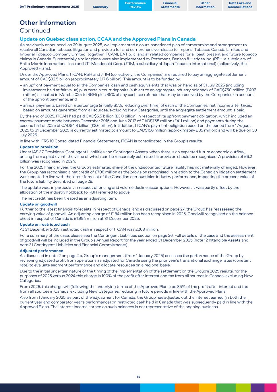 Other Information Continued Update on Quebec class action, CCAA and the Approved Plans in Canada As previously announced, on 29 August 2025, we implemented a court-sanctioned plan of compromise and arrangement to resolve all Canadian tobacco litigation and provide a full and comprehensive release to Imperial Tobacco Canada Limited and Imperial Tobacco Company Limited (together ITCAN), BAT p.l.c. and all related companies for all past, present and future tobacco claims in Canada. Substantially similar plans were also implemented by Rothmans, Benson & Hedges Inc. (RBH, a subsidiary of Philip Morris International Inc.) and JTI-Macdonald Corp. (JTIM, a subsidiary of Japan Tobacco International) (collectively, the Approved Plans). Under the Approved Plans, ITCAN, RBH and JTIM (collectively, the Companies) are required to pay an aggregate settlement amount of CAD$32.5 billion (approximately £17.6 billion). This amount is to be funded by: – an upfront payment equal to all the Companies’ cash and cash equivalents that was on hand as of 31 July 2025 (including investments held at fair value) plus certain court deposits (subject to an aggregate industry holdback of CAD$750 million (£407 million) allocated in March 2025 to RBH) plus 85% of any cash tax refunds that may be received by the Companies on account of the upfront payments; and – annual payments based on a percentage (initially 85%, reducing over time) of each of the Companies’ net income after taxes, based on amounts generated from all sources, excluding New Categories, until the aggregate settlement amount is paid. By the end of 2025, ITCAN had paid CAD$5.5 billion (£3.0 billion) in respect of its upfront payment obligation, which included an escrow payment made between December 2015 and June 2017 of CAD$758 million (£411 million) and payments during the second half of 2025 of CAD$4.8 billion (£2.6 billion). In addition, ITCAN’s payment obligation based on the period from 1 August 2025 to 31 December 2025 is currently estimated to amount to CAD$156 million (approximately £85 million) and will be due on 30 July 2026. In line with IFRS 10 Consolidated Financial Statements, ITCAN is consolidated in the Group’s results. Update on provision Under IAS 37 Provisions, Contingent Liabilities and Contingent Assets, when there is an expected future economic outflow, arising from a past event, the value of which can be reasonably estimated, a provision should be recognised. A provision of £6.2 billion was recognised in 2024. For the 2025 financial year, the Group's estimated share of the undiscounted future liability has not materially changed. However, the Group has recognised a net credit of £708 million as the provision recognised in relation to the Canadian litigation settlement was updated in line with the latest forecast of the Canadian combustibles industry performance, impacting the present value of the future liability described on page 28. The update was, in particular, in respect of pricing and volume decline assumptions. However, it was partly offset by the allocation of the industry holdback to RBH referred to above. The net credit has been treated as an adjusting item. Update on goodwill Further to the latest financial forecasts in respect of Canada, and as discussed on page 27, the Group has reassessed the carrying value of goodwill. An adjusting charge of £184 million has been recognised in 2025. Goodwill recognised on the balance sheet in respect of Canada is £1,994 million at 31 December 2025. Update on restricted cash At 31 December 2025, restricted cash in respect of ITCAN was £268 million. For a summary of the case, please see the Contingent Liabilities section on page 36. Full details of the case and the assessment of goodwill will be included in the Group's Annual Report for the year ended 31 December 2025 (note 12 Intangible Assets and note 31 Contingent Liabilities and Financial Commitments). Adjusted performance As discussed in note 2 on page 24, Group's management (from 1 January 2025) assesses the performance of the Group by reviewing adjusted profit from operations as adjusted for Canada using the prior year's translational exchange rates (constant rate) to evaluate segment performance and allocate resources on a regional basis. Due to the initial uncertain nature of the timing of the implementation of the settlement on the Group’s 2025 results, for the purposes of 2025 versus 2024 this charge is 100% of the profit after interest and tax from all sources in Canada, excluding New Categories. From 2026, this charge will (following the underlying terms of the Approved Plans) be 85% of the profit after interest and tax from all sources in Canada, excluding New Categories, reducing in future periods in line with the Approved Plans. Also from 1 January 2025, as part of the adjustment for Canada, the Group has adjusted out the interest earned (in both the current year and comparator year's performance) on restricted cash held in Canada that was subsequently paid in line with the Approved Plans. The interest income earned on such balances is not representative of the ongoing business. BAT Preliminary Announcement 2025 Summary Performance Review Financial Statements Other Information Data Lake and Reconciliations 14