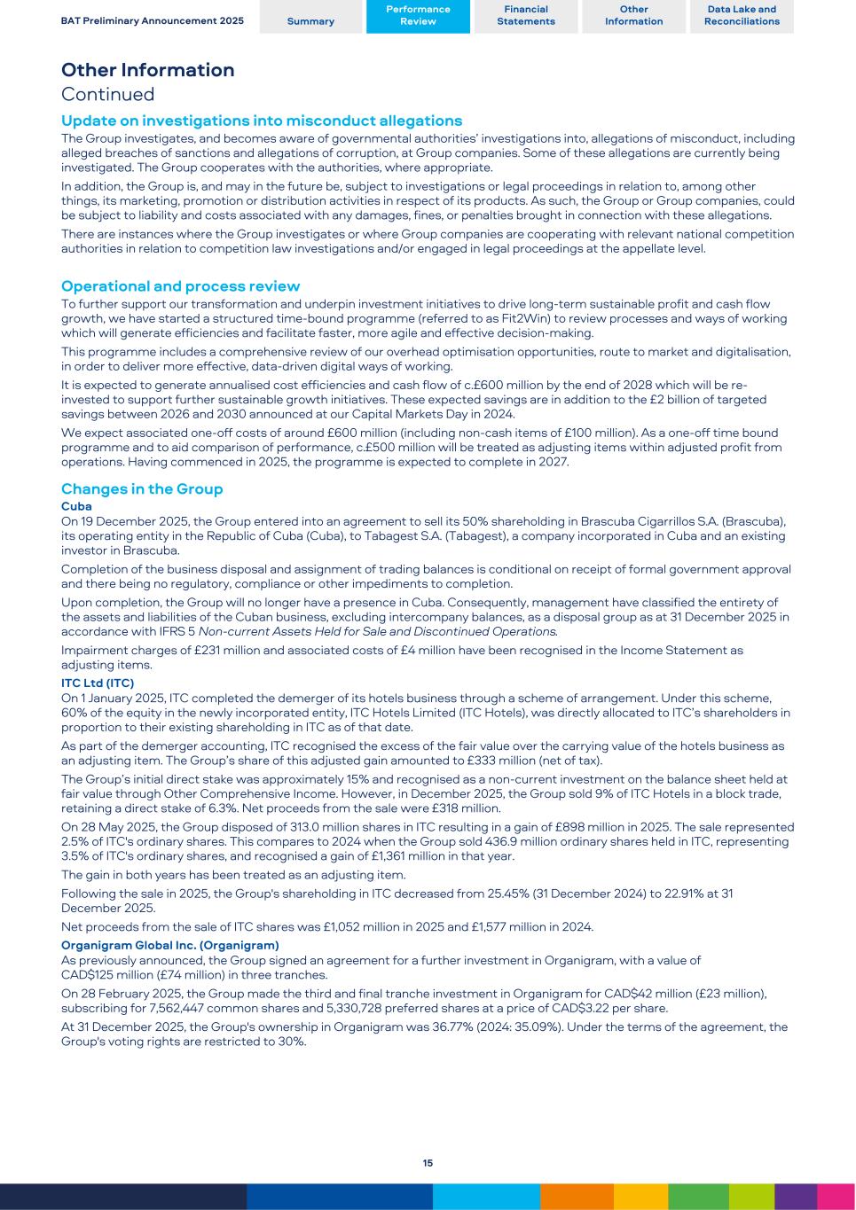 Other Information Continued Update on investigations into misconduct allegations The Group investigates, and becomes aware of governmental authorities’ investigations into, allegations of misconduct, including alleged breaches of sanctions and allegations of corruption, at Group companies. Some of these allegations are currently being investigated. The Group cooperates with the authorities, where appropriate. In addition, the Group is, and may in the future be, subject to investigations or legal proceedings in relation to, among other things, its marketing, promotion or distribution activities in respect of its products. As such, the Group or Group companies, could be subject to liability and costs associated with any damages, fines, or penalties brought in connection with these allegations. There are instances where the Group investigates or where Group companies are cooperating with relevant national competition authorities in relation to competition law investigations and/or engaged in legal proceedings at the appellate level. Operational and process review To further support our transformation and underpin investment initiatives to drive long-term sustainable profit and cash flow growth, we have started a structured time-bound programme (referred to as Fit2Win) to review processes and ways of working which will generate efficiencies and facilitate faster, more agile and effective decision-making. This programme includes a comprehensive review of our overhead optimisation opportunities, route to market and digitalisation, in order to deliver more effective, data-driven digital ways of working. It is expected to generate annualised cost efficiencies and cash flow of c.£600 million by the end of 2028 which will be re- invested to support further sustainable growth initiatives. These expected savings are in addition to the £2 billion of targeted savings between 2026 and 2030 announced at our Capital Markets Day in 2024. We expect associated one-off costs of around £600 million (including non-cash items of £100 million). As a one-off time bound programme and to aid comparison of performance, c.£500 million will be treated as adjusting items within adjusted profit from operations. Having commenced in 2025, the programme is expected to complete in 2027. Changes in the Group Cuba On 19 December 2025, the Group entered into an agreement to sell its 50% shareholding in Brascuba Cigarrillos S.A. (Brascuba), its operating entity in the Republic of Cuba (Cuba), to Tabagest S.A. (Tabagest), a company incorporated in Cuba and an existing investor in Brascuba. Completion of the business disposal and assignment of trading balances is conditional on receipt of formal government approval and there being no regulatory, compliance or other impediments to completion. Upon completion, the Group will no longer have a presence in Cuba. Consequently, management have classified the entirety of the assets and liabilities of the Cuban business, excluding intercompany balances, as a disposal group as at 31 December 2025 in accordance with IFRS 5 Non-current Assets Held for Sale and Discontinued Operations. Impairment charges of £231 million and associated costs of £4 million have been recognised in the Income Statement as adjusting items. ITC Ltd (ITC) On 1 January 2025, ITC completed the demerger of its hotels business through a scheme of arrangement. Under this scheme, 60% of the equity in the newly incorporated entity, ITC Hotels Limited (ITC Hotels), was directly allocated to ITC’s shareholders in proportion to their existing shareholding in ITC as of that date. As part of the demerger accounting, ITC recognised the excess of the fair value over the carrying value of the hotels business as an adjusting item. The Group’s share of this adjusted gain amounted to £333 million (net of tax). The Group’s initial direct stake was approximately 15% and recognised as a non-current investment on the balance sheet held at fair value through Other Comprehensive Income. However, in December 2025, the Group sold 9% of ITC Hotels in a block trade, retaining a direct stake of 6.3%. Net proceeds from the sale were £318 million. On 28 May 2025, the Group disposed of 313.0 million shares in ITC resulting in a gain of £898 million in 2025. The sale represented 2.5% of ITC's ordinary shares. This compares to 2024 when the Group sold 436.9 million ordinary shares held in ITC, representing 3.5% of ITC's ordinary shares, and recognised a gain of £1,361 million in that year. The gain in both years has been treated as an adjusting item. Following the sale in 2025, the Group's shareholding in ITC decreased from 25.45% (31 December 2024) to 22.91% at 31 December 2025. Net proceeds from the sale of ITC shares was £1,052 million in 2025 and £1,577 million in 2024. Organigram Global Inc. (Organigram) As previously announced, the Group signed an agreement for a further investment in Organigram, with a value of CAD$125 million (£74 million) in three tranches. On 28 February 2025, the Group made the third and final tranche investment in Organigram for CAD$42 million (£23 million), subscribing for 7,562,447 common shares and 5,330,728 preferred shares at a price of CAD$3.22 per share. At 31 December 2025, the Group's ownership in Organigram was 36.77% (2024: 35.09%). Under the terms of the agreement, the Group's voting rights are restricted to 30%. BAT Preliminary Announcement 2025 Summary Performance Review Financial Statements Other Information Data Lake and Reconciliations 15