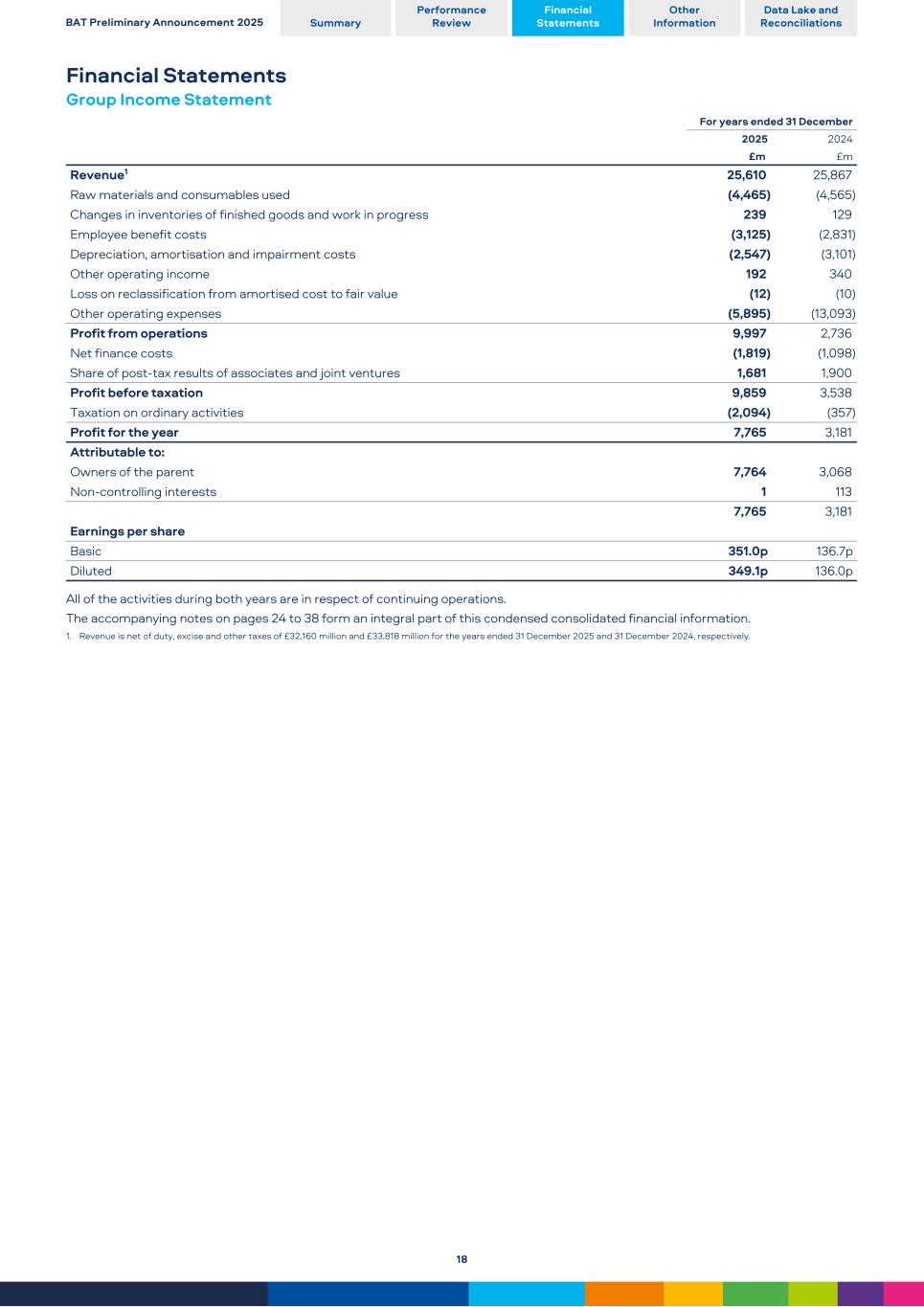 Financial Statements Group Income Statement For years ended 31 December 2025 2024 £m £m Revenue1 25,610 25,867 Raw materials and consumables used (4,465) (4,565) Changes in inventories of finished goods and work in progress 239 129 Employee benefit costs (3,125) (2,831) Depreciation, amortisation and impairment costs (2,547) (3,101) Other operating income 192 340 Loss on reclassification from amortised cost to fair value (12) (10) Other operating expenses (5,895) (13,093) Profit from operations 9,997 2,736 Net finance costs (1,819) (1,098) Share of post-tax results of associates and joint ventures 1,681 1,900 Profit before taxation 9,859 3,538 Taxation on ordinary activities (2,094) (357) Profit for the year 7,765 3,181 Attributable to: Owners of the parent 7,764 3,068 Non-controlling interests 1 113 7,765 3,181 Earnings per share Basic 351.0p 136.7p Diluted 349.1p 136.0p All of the activities during both years are in respect of continuing operations. The accompanying notes on pages 24 to 38 form an integral part of this condensed consolidated financial information. 1. Revenue is net of duty, excise and other taxes of £32,160 million and £33,818 million for the years ended 31 December 2025 and 31 December 2024, respectively. BAT Preliminary Announcement 2025 Summary Performance Review Financial Statements Other Information Data Lake and Reconciliations 18