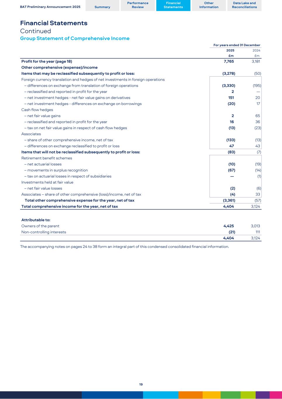 Financial Statements Continued Group Statement of Comprehensive Income For years ended 31 December 2025 2024 £m £m Profit for the year (page 18) 7,765 3,181 Other comprehensive (expense)/income Items that may be reclassified subsequently to profit or loss: (3,278) (50) Foreign currency translation and hedges of net investments in foreign operations – differences on exchange from translation of foreign operations (3,330) (195) – reclassified and reported in profit for the year 2 — – net investment hedges - net fair value gains on derivatives 151 20 – net investment hedges - differences on exchange on borrowings (20) 17 Cash flow hedges – net fair value gains 2 65 – reclassified and reported in profit for the year 16 36 – tax on net fair value gains in respect of cash flow hedges (13) (23) Associates – share of other comprehensive income, net of tax (133) (13) – differences on exchange reclassified to profit or loss 47 43 Items that will not be reclassified subsequently to profit or loss: (83) (7) Retirement benefit schemes – net actuarial losses (10) (19) – movements in surplus recognition (67) (14) – tax on actuarial losses in respect of subsidiaries — (1) Investments held at fair value – net fair value losses (2) (6) Associates – share of other comprehensive (loss)/income, net of tax (4) 33 Total other comprehensive expense for the year, net of tax (3,361) (57) Total comprehensive income for the year, net of tax 4,404 3,124 Attributable to: Owners of the parent 4,425 3,013 Non-controlling interests (21) 111 4,404 3,124 The accompanying notes on pages 24 to 38 form an integral part of this condensed consolidated financial information. BAT Preliminary Announcement 2025 Summary Performance Review Financial Statements Other Information Data Lake and Reconciliations 19