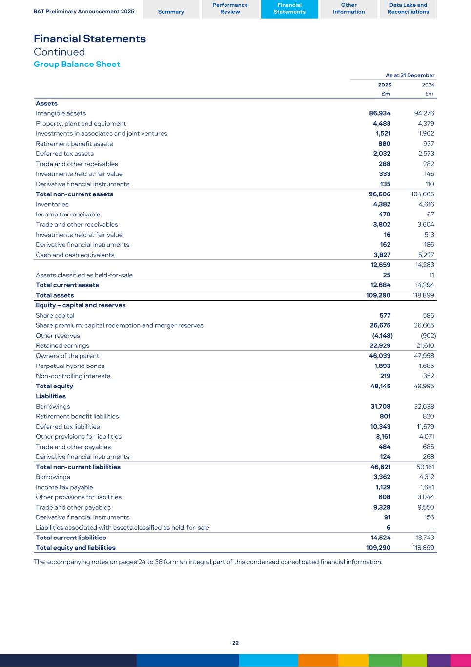 Financial Statements Continued Group Balance Sheet As at 31 December 2025 2024 £m £m Assets Intangible assets 86,934 94,276 Property, plant and equipment 4,483 4,379 Investments in associates and joint ventures 1,521 1,902 Retirement benefit assets 880 937 Deferred tax assets 2,032 2,573 Trade and other receivables 288 282 Investments held at fair value 333 146 Derivative financial instruments 135 110 Total non-current assets 96,606 104,605 Inventories 4,382 4,616 Income tax receivable 470 67 Trade and other receivables 3,802 3,604 Investments held at fair value 16 513 Derivative financial instruments 162 186 Cash and cash equivalents 3,827 5,297 12,659 14,283 Assets classified as held-for-sale 25 11 Total current assets 12,684 14,294 Total assets 109,290 118,899 Equity – capital and reserves Share capital 577 585 Share premium, capital redemption and merger reserves 26,675 26,665 Other reserves (4,148) (902) Retained earnings 22,929 21,610 Owners of the parent 46,033 47,958 Perpetual hybrid bonds 1,893 1,685 Non-controlling interests 219 352 Total equity 48,145 49,995 Liabilities Borrowings 31,708 32,638 Retirement benefit liabilities 801 820 Deferred tax liabilities 10,343 11,679 Other provisions for liabilities 3,161 4,071 Trade and other payables 484 685 Derivative financial instruments 124 268 Total non-current liabilities 46,621 50,161 Borrowings 3,362 4,312 Income tax payable 1,129 1,681 Other provisions for liabilities 608 3,044 Trade and other payables 9,328 9,550 Derivative financial instruments 91 156 Liabilities associated with assets classified as held-for-sale 6 — Total current liabilities 14,524 18,743 Total equity and liabilities 109,290 118,899 The accompanying notes on pages 24 to 38 form an integral part of this condensed consolidated financial information. BAT Preliminary Announcement 2025 Summary Performance Review Financial Statements Other Information Data Lake and Reconciliations 22