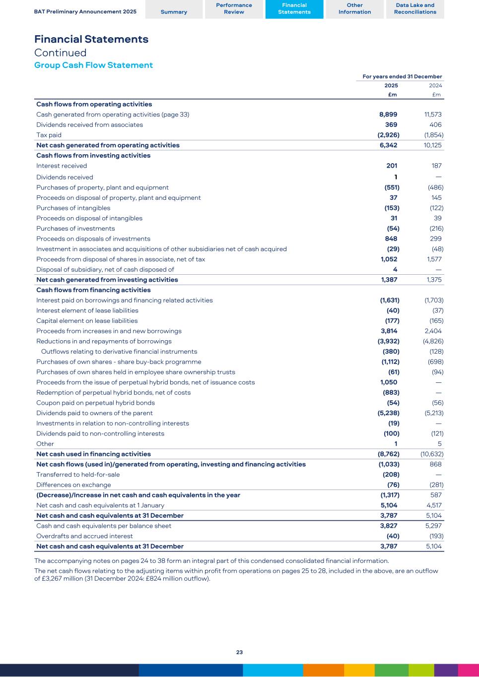 Financial Statements Continued Group Cash Flow Statement For years ended 31 December 2025 2024 £m £m Cash flows from operating activities Cash generated from operating activities (page 33) 8,899 11,573 Dividends received from associates 369 406 Tax paid (2,926) (1,854) Net cash generated from operating activities 6,342 10,125 Cash flows from investing activities Interest received 201 187 Dividends received 1 — Purchases of property, plant and equipment (551) (486) Proceeds on disposal of property, plant and equipment 37 145 Purchases of intangibles (153) (122) Proceeds on disposal of intangibles 31 39 Purchases of investments (54) (216) Proceeds on disposals of investments 848 299 Investment in associates and acquisitions of other subsidiaries net of cash acquired (29) (48) Proceeds from disposal of shares in associate, net of tax 1,052 1,577 Disposal of subsidiary, net of cash disposed of 4 — Net cash generated from investing activities 1,387 1,375 Cash flows from financing activities Interest paid on borrowings and financing related activities (1,631) (1,703) Interest element of lease liabilities (40) (37) Capital element on lease liabilities (177) (165) Proceeds from increases in and new borrowings 3,814 2,404 Reductions in and repayments of borrowings (3,932) (4,826) Outflows relating to derivative financial instruments (380) (128) Purchases of own shares - share buy-back programme (1,112) (698) Purchases of own shares held in employee share ownership trusts (61) (94) Proceeds from the issue of perpetual hybrid bonds, net of issuance costs 1,050 — Redemption of perpetual hybrid bonds, net of costs (883) — Coupon paid on perpetual hybrid bonds (54) (56) Dividends paid to owners of the parent (5,238) (5,213) Investments in relation to non-controlling interests (19) — Dividends paid to non-controlling interests (100) (121) Other 1 5 Net cash used in financing activities (8,762) (10,632) Net cash flows (used in)/generated from operating, investing and financing activities (1,033) 868 Transferred to held-for-sale (208) — Differences on exchange (76) (281) (Decrease)/Increase in net cash and cash equivalents in the year (1,317) 587 Net cash and cash equivalents at 1 January 5,104 4,517 Net cash and cash equivalents at 31 December 3,787 5,104 Cash and cash equivalents per balance sheet 3,827 5,297 Overdrafts and accrued interest (40) (193) Net cash and cash equivalents at 31 December 3,787 5,104 The accompanying notes on pages 24 to 38 form an integral part of this condensed consolidated financial information. The net cash flows relating to the adjusting items within profit from operations on pages 25 to 28, included in the above, are an outflow of £3,267 million (31 December 2024: £824 million outflow). BAT Preliminary Announcement 2025 Summary Performance Review Financial Statements Other Information Data Lake and Reconciliations 23