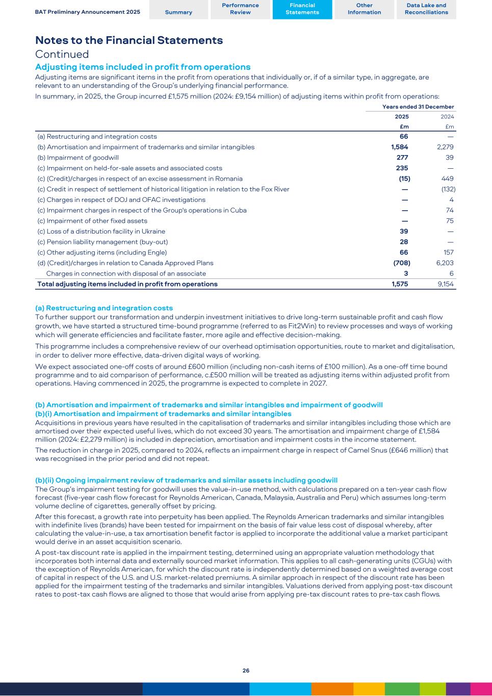 Notes to the Financial Statements Continued Adjusting items included in profit from operations Adjusting items are significant items in the profit from operations that individually or, if of a similar type, in aggregate, are relevant to an understanding of the Group’s underlying financial performance. In summary, in 2025, the Group incurred £1,575 million (2024: £9,154 million) of adjusting items within profit from operations: Years ended 31 December 2025 2024 £m £m (a) Restructuring and integration costs 66 — (b) Amortisation and impairment of trademarks and similar intangibles 1,584 2,279 (b) Impairment of goodwill 277 39 (c) Impairment on held-for-sale assets and associated costs 235 — (c) (Credit)/charges in respect of an excise assessment in Romania (15) 449 (c) Credit in respect of settlement of historical litigation in relation to the Fox River — (132) (c) Charges in respect of DOJ and OFAC investigations — 4 (c) Impairment charges in respect of the Group's operations in Cuba — 74 (c) Impairment of other fixed assets — 75 (c) Loss of a distribution facility in Ukraine 39 — (c) Pension liability management (buy-out) 28 — (c) Other adjusting items (including Engle) 66 157 (d) (Credit)/charges in relation to Canada Approved Plans (708) 6,203 Charges in connection with disposal of an associate 3 6 Total adjusting items included in profit from operations 1,575 9,154 (a) Restructuring and integration costs To further support our transformation and underpin investment initiatives to drive long-term sustainable profit and cash flow growth, we have started a structured time-bound programme (referred to as Fit2Win) to review processes and ways of working which will generate efficiencies and facilitate faster, more agile and effective decision-making. This programme includes a comprehensive review of our overhead optimisation opportunities, route to market and digitalisation, in order to deliver more effective, data-driven digital ways of working. We expect associated one-off costs of around £600 million (including non-cash items of £100 million). As a one-off time bound programme and to aid comparison of performance, c.£500 million will be treated as adjusting items within adjusted profit from operations. Having commenced in 2025, the programme is expected to complete in 2027. (b) Amortisation and impairment of trademarks and similar intangibles and impairment of goodwill (b)(i) Amortisation and impairment of trademarks and similar intangibles Acquisitions in previous years have resulted in the capitalisation of trademarks and similar intangibles including those which are amortised over their expected useful lives, which do not exceed 30 years. The amortisation and impairment charge of £1,584 million (2024: £2,279 million) is included in depreciation, amortisation and impairment costs in the income statement. The reduction in charge in 2025, compared to 2024, reflects an impairment charge in respect of Camel Snus (£646 million) that was recognised in the prior period and did not repeat. (b)(ii) Ongoing impairment review of trademarks and similar assets including goodwill The Group’s impairment testing for goodwill uses the value-in-use method, with calculations prepared on a ten-year cash flow forecast (five-year cash flow forecast for Reynolds American, Canada, Malaysia, Australia and Peru) which assumes long-term volume decline of cigarettes, generally offset by pricing. After this forecast, a growth rate into perpetuity has been applied. The Reynolds American trademarks and similar intangibles with indefinite lives (brands) have been tested for impairment on the basis of fair value less cost of disposal whereby, after calculating the value-in-use, a tax amortisation benefit factor is applied to incorporate the additional value a market participant would derive in an asset acquisition scenario. A post-tax discount rate is applied in the impairment testing, determined using an appropriate valuation methodology that incorporates both internal data and externally sourced market information. This applies to all cash-generating units (CGUs) with the exception of Reynolds American, for which the discount rate is independently determined based on a weighted average cost of capital in respect of the U.S. and U.S. market-related premiums. A similar approach in respect of the discount rate has been applied for the impairment testing of the trademarks and similar intangibles. Valuations derived from applying post-tax discount rates to post-tax cash flows are aligned to those that would arise from applying pre-tax discount rates to pre-tax cash flows. BAT Preliminary Announcement 2025 Summary Performance Review Financial Statements Other Information Data Lake and Reconciliations 26
