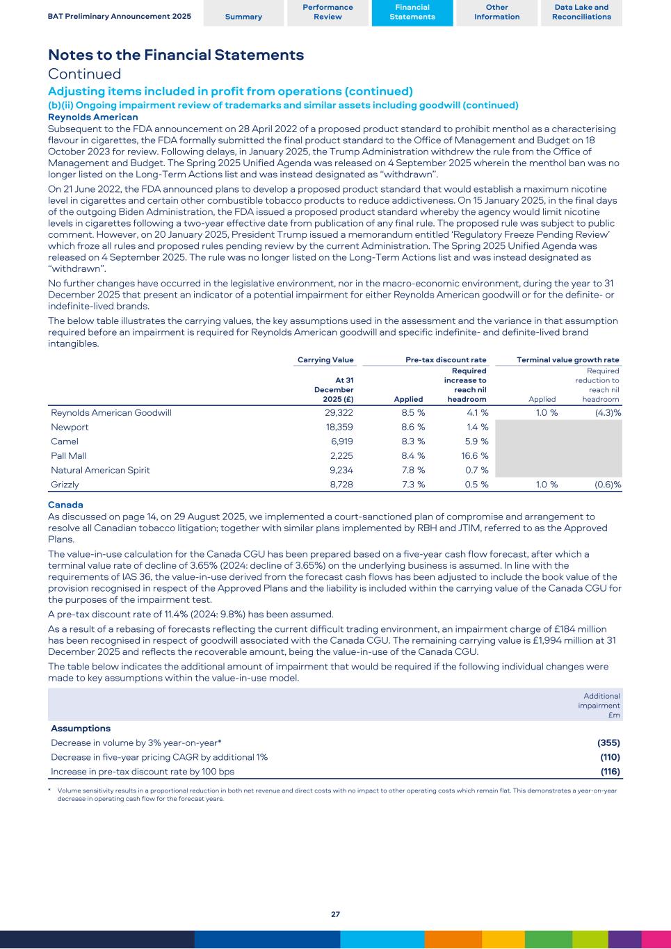 Notes to the Financial Statements Continued Adjusting items included in profit from operations (continued) (b)(ii) Ongoing impairment review of trademarks and similar assets including goodwill (continued) Reynolds American Subsequent to the FDA announcement on 28 April 2022 of a proposed product standard to prohibit menthol as a characterising flavour in cigarettes, the FDA formally submitted the final product standard to the Office of Management and Budget on 18 October 2023 for review. Following delays, in January 2025, the Trump Administration withdrew the rule from the Office of Management and Budget. The Spring 2025 Unified Agenda was released on 4 September 2025 wherein the menthol ban was no longer listed on the Long-Term Actions list and was instead designated as “withdrawn”. On 21 June 2022, the FDA announced plans to develop a proposed product standard that would establish a maximum nicotine level in cigarettes and certain other combustible tobacco products to reduce addictiveness. On 15 January 2025, in the final days of the outgoing Biden Administration, the FDA issued a proposed product standard whereby the agency would limit nicotine levels in cigarettes following a two-year effective date from publication of any final rule. The proposed rule was subject to public comment. However, on 20 January 2025, President Trump issued a memorandum entitled ‘Regulatory Freeze Pending Review’ which froze all rules and proposed rules pending review by the current Administration. The Spring 2025 Unified Agenda was released on 4 September 2025. The rule was no longer listed on the Long-Term Actions list and was instead designated as “withdrawn”. No further changes have occurred in the legislative environment, nor in the macro-economic environment, during the year to 31 December 2025 that present an indicator of a potential impairment for either Reynolds American goodwill or for the definite- or indefinite-lived brands. The below table illustrates the carrying values, the key assumptions used in the assessment and the variance in that assumption required before an impairment is required for Reynolds American goodwill and specific indefinite- and definite-lived brand intangibles. Carrying Value Pre-tax discount rate Terminal value growth rate At 31 December 2025 (£) Applied Required increase to reach nil headroom Applied Required reduction to reach nil headroom Reynolds American Goodwill 29,322 8.5 % 4.1 % 1.0 % (4.3) % Newport 18,359 8.6 % 1.4 % Camel 6,919 8.3 % 5.9 % Pall Mall 2,225 8.4 % 16.6 % Natural American Spirit 9,234 7.8 % 0.7 % Grizzly 8,728 7.3 % 0.5 % 1.0 % (0.6) % Canada As discussed on page 14, on 29 August 2025, we implemented a court-sanctioned plan of compromise and arrangement to resolve all Canadian tobacco litigation; together with similar plans implemented by RBH and JTIM, referred to as the Approved Plans. The value-in-use calculation for the Canada CGU has been prepared based on a five-year cash flow forecast, after which a terminal value rate of decline of 3.65% (2024: decline of 3.65%) on the underlying business is assumed. In line with the requirements of IAS 36, the value-in-use derived from the forecast cash flows has been adjusted to include the book value of the provision recognised in respect of the Approved Plans and the liability is included within the carrying value of the Canada CGU for the purposes of the impairment test. A pre-tax discount rate of 11.4% (2024: 9.8%) has been assumed. As a result of a rebasing of forecasts reflecting the current difficult trading environment, an impairment charge of £184 million has been recognised in respect of goodwill associated with the Canada CGU. The remaining carrying value is £1,994 million at 31 December 2025 and reflects the recoverable amount, being the value-in-use of the Canada CGU. The table below indicates the additional amount of impairment that would be required if the following individual changes were made to key assumptions within the value-in-use model. Additional impairment £m Assumptions Decrease in volume by 3% year-on-year* (355) Decrease in five-year pricing CAGR by additional 1% (110) Increase in pre-tax discount rate by 100 bps (116) * Volume sensitivity results in a proportional reduction in both net revenue and direct costs with no impact to other operating costs which remain flat. This demonstrates a year-on-year decrease in operating cash flow for the forecast years. BAT Preliminary Announcement 2025 Summary Performance Review Financial Statements Other Information Data Lake and Reconciliations 27