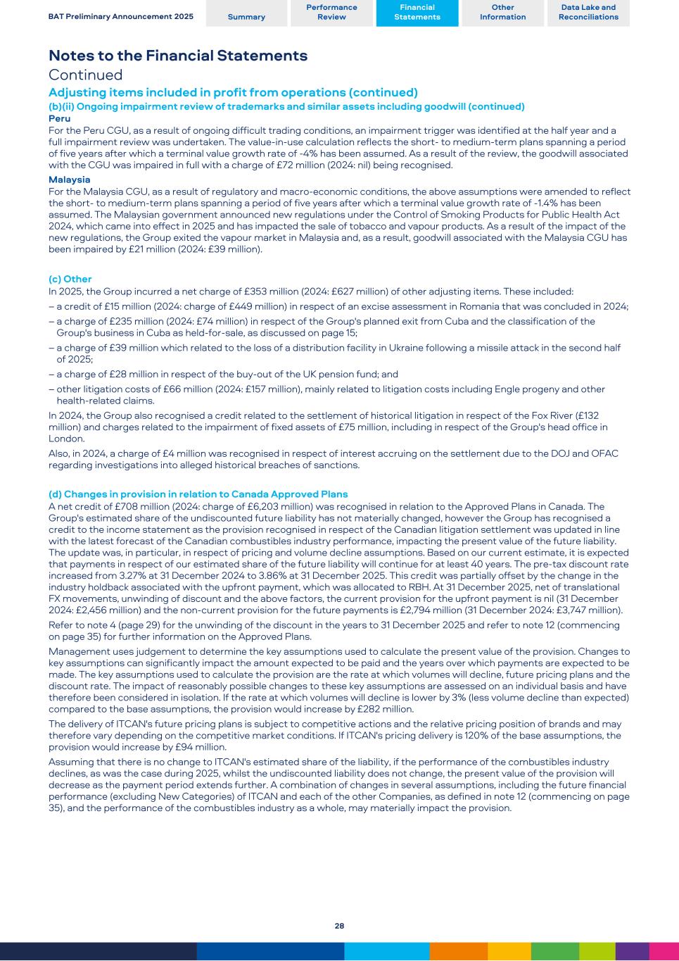 Notes to the Financial Statements Continued Adjusting items included in profit from operations (continued) (b)(ii) Ongoing impairment review of trademarks and similar assets including goodwill (continued) Peru For the Peru CGU, as a result of ongoing difficult trading conditions, an impairment trigger was identified at the half year and a full impairment review was undertaken. The value-in-use calculation reflects the short- to medium-term plans spanning a period of five years after which a terminal value growth rate of -4% has been assumed. As a result of the review, the goodwill associated with the CGU was impaired in full with a charge of £72 million (2024: nil) being recognised. Malaysia For the Malaysia CGU, as a result of regulatory and macro-economic conditions, the above assumptions were amended to reflect the short- to medium-term plans spanning a period of five years after which a terminal value growth rate of -1.4% has been assumed. The Malaysian government announced new regulations under the Control of Smoking Products for Public Health Act 2024, which came into effect in 2025 and has impacted the sale of tobacco and vapour products. As a result of the impact of the new regulations, the Group exited the vapour market in Malaysia and, as a result, goodwill associated with the Malaysia CGU has been impaired by £21 million (2024: £39 million). (c) Other In 2025, the Group incurred a net charge of £353 million (2024: £627 million) of other adjusting items. These included: – a credit of £15 million (2024: charge of £449 million) in respect of an excise assessment in Romania that was concluded in 2024; – a charge of £235 million (2024: £74 million) in respect of the Group's planned exit from Cuba and the classification of the Group's business in Cuba as held-for-sale, as discussed on page 15; – a charge of £39 million which related to the loss of a distribution facility in Ukraine following a missile attack in the second half of 2025; – a charge of £28 million in respect of the buy-out of the UK pension fund; and – other litigation costs of £66 million (2024: £157 million), mainly related to litigation costs including Engle progeny and other health-related claims. In 2024, the Group also recognised a credit related to the settlement of historical litigation in respect of the Fox River (£132 million) and charges related to the impairment of fixed assets of £75 million, including in respect of the Group's head office in London. Also, in 2024, a charge of £4 million was recognised in respect of interest accruing on the settlement due to the DOJ and OFAC regarding investigations into alleged historical breaches of sanctions. (d) Changes in provision in relation to Canada Approved Plans A net credit of £708 million (2024: charge of £6,203 million) was recognised in relation to the Approved Plans in Canada. The Group's estimated share of the undiscounted future liability has not materially changed, however the Group has recognised a credit to the income statement as the provision recognised in respect of the Canadian litigation settlement was updated in line with the latest forecast of the Canadian combustibles industry performance, impacting the present value of the future liability. The update was, in particular, in respect of pricing and volume decline assumptions. Based on our current estimate, it is expected that payments in respect of our estimated share of the future liability will continue for at least 40 years. The pre-tax discount rate increased from 3.27% at 31 December 2024 to 3.86% at 31 December 2025. This credit was partially offset by the change in the industry holdback associated with the upfront payment, which was allocated to RBH. At 31 December 2025, net of translational FX movements, unwinding of discount and the above factors, the current provision for the upfront payment is nil (31 December 2024: £2,456 million) and the non-current provision for the future payments is £2,794 million (31 December 2024: £3,747 million). Refer to note 4 (page 29) for the unwinding of the discount in the years to 31 December 2025 and refer to note 12 (commencing on page 35) for further information on the Approved Plans. Management uses judgement to determine the key assumptions used to calculate the present value of the provision. Changes to key assumptions can significantly impact the amount expected to be paid and the years over which payments are expected to be made. The key assumptions used to calculate the provision are the rate at which volumes will decline, future pricing plans and the discount rate. The impact of reasonably possible changes to these key assumptions are assessed on an individual basis and have therefore been considered in isolation. If the rate at which volumes will decline is lower by 3% (less volume decline than expected) compared to the base assumptions, the provision would increase by £282 million. The delivery of ITCAN's future pricing plans is subject to competitive actions and the relative pricing position of brands and may therefore vary depending on the competitive market conditions. If ITCAN's pricing delivery is 120% of the base assumptions, the provision would increase by £94 million. Assuming that there is no change to ITCAN's estimated share of the liability, if the performance of the combustibles industry declines, as was the case during 2025, whilst the undiscounted liability does not change, the present value of the provision will decrease as the payment period extends further. A combination of changes in several assumptions, including the future financial performance (excluding New Categories) of ITCAN and each of the other Companies, as defined in note 12 (commencing on page 35), and the performance of the combustibles industry as a whole, may materially impact the provision. BAT Preliminary Announcement 2025 Summary Performance Review Financial Statements Other Information Data Lake and Reconciliations 28