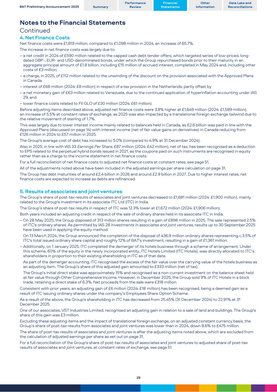Notes to the Financial Statements Continued 4. Net Finance Costs Net finance costs were £1,819 million, compared to £1,098 million in 2024, an increase of 65.7%. The increase in net finance costs was largely due to: – a net credit in 2024 of £590 million related to the capped cash debt tender offers, which targeted series of low-priced, long- dated GBP-, EUR- and USD-denominated bonds, under which the Group repurchased bonds prior to their maturity in an aggregate principal amount of £1.8 billion, including £15 million of accrued interest, completed in May 2024 and, including other costs of £3 million; – a charge, in 2025, of £112 million related to the unwinding of the discount on the provision associated with the Approved Plans in Canada; – interest of £66 million (2024: £8 million) in respect of a tax provision in the Netherlands; partly offset by – a net monetary gain of £63 million related to Venezuela, due to the continued application of hyperinflation accounting under IAS 29; and – lower finance costs related to FII GLO of £30 million (2024: £61 million). Before adjusting items described above, adjusted net finance costs were 3.8% higher at £1,649 million (2024: £1,589 million), an increase of 5.5% at constant rates of exchange, as 2025 was also impacted by a translational foreign exchange tailwind due to the relative movement of sterling of 1.7%. This was largely due to lower interest income mainly related to balances held in Canada, as £2.6 billion was paid in line with the Approved Plans (discussed on page 14) with interest income (net of fair value gains on derivatives) in Canada reducing from £126 million in 2024 to £57 million in 2025. The Group's average cost of debt has increased to 5.0% (compared to 4.9% at 31 December 2024). Also in 2025, in line with IAS 33 Earnings Per Share, £87 million (2024: £42 million), net of tax, has been recognised as a deduction to EPS related to the perpetual hybrid bonds issued in 2021, as the coupons paid on such instruments are recognised in equity rather than as a charge to the income statement in net finance costs. For a full reconciliation of net finance costs to adjusted net finance costs at constant rates, see page 51. All of the adjustments noted above have been included in the adjusted earnings per share calculation on page 31. The Group has debt maturities of around £2.4 billion in 2026 and around £2.9 billion in 2027. Due to higher interest rates, net finance costs are expected to increase as debts are refinanced. 5. Results of associates and joint ventures The Group’s share of post-tax results of associates and joint ventures decreased to £1,681 million (2024: £1,900 million), mainly related to the Group's investment in its associate ITC Ltd (ITC) in India. The Group’s share of post-tax results in respect of ITC was 12.3% lower at £1,672 million (2024: £1,906 million). Both years included an adjusting credit in respect of the sale of ordinary shares held in its associate ITC in India. – On 28 May 2025, the Group disposed of 313 million shares resulting in a gain of £898 million in 2025. The sale represented 2.5% of ITC's ordinary shares. As permitted by IAS 28 Investments in associates and joint ventures, results up to 30 September 2025 have been used in applying the equity method. On 13 March 2024, the Group announced the completion of the disposal of 436.9 million ordinary shares representing c.3.5% of ITC's total issued ordinary share capital and roughly 12% of BAT's investment, resulting in a gain of £1,361 million. – Additionally, on 1 January 2025, ITC completed the demerger of its hotels business through a scheme of arrangement. Under this scheme, 60% of the equity in the newly incorporated entity, ITC Hotels Limited (ITC Hotels), was directly allocated to ITC’s shareholders in proportion to their existing shareholding in ITC as of that date. As part of the demerger accounting, ITC recognised the excess of the fair value over the carrying value of the hotels business as an adjusting item. The Group’s share of this adjusted gain amounted to £333 million (net of tax). The Group’s initial direct stake was approximately 15% and recognised as a non-current investment on the balance sheet held at fair value through Other Comprehensive Income. However, in December 2025, the Group sold 9% of ITC Hotels in a block trade, retaining a direct stake of 6.3%. Net proceeds from the sale were £318 million. Consistent with prior years, an adjusting gain of £6 million (2024: £18 million) has been recognised, being a deemed gain as a result of ITC issuing ordinary shares under the company’s Employees Share Option Scheme. As a result of the above, the Group's shareholding in ITC has decreased from 25.45% (31 December 2024) to 22.91% at 31 December 2025. One of our associates, VST Industries Limited, recognised an adjusting gain in relation to a sale of land and buildings. The Group's share of this gain was £3 million. Excluding these adjusting items and the impact of translational foreign exchange, on an adjusted constant currency basis, the Group’s share of post-tax results from associates and joint ventures was lower than in 2024, down 8.6% to £475 million. The share of post-tax results of associates and joint ventures is after the adjusting items noted above, which are excluded from the calculation of adjusted earnings per share as set out on page 31. For a full reconciliation of the Group's share of post-tax results of associates and joint ventures to adjusted share of post-tax results of associates and joint ventures, at constant rates of exchange, see page 51. BAT Preliminary Announcement 2025 Summary Performance Review Financial Statements Other Information Data Lake and Reconciliations 29