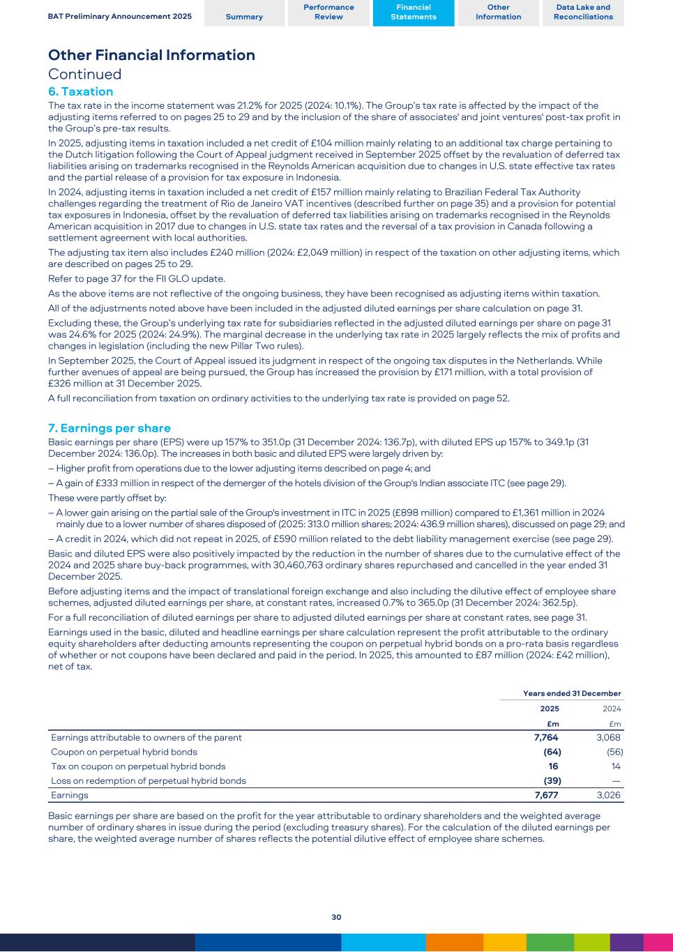 Other Financial Information Continued 6. Taxation The tax rate in the income statement was 21.2% for 2025 (2024: 10.1%). The Group’s tax rate is affected by the impact of the adjusting items referred to on pages 25 to 29 and by the inclusion of the share of associates' and joint ventures' post-tax profit in the Group’s pre-tax results. In 2025, adjusting items in taxation included a net credit of £104 million mainly relating to an additional tax charge pertaining to the Dutch litigation following the Court of Appeal judgment received in September 2025 offset by the revaluation of deferred tax liabilities arising on trademarks recognised in the Reynolds American acquisition due to changes in U.S. state effective tax rates and the partial release of a provision for tax exposure in Indonesia. In 2024, adjusting items in taxation included a net credit of £157 million mainly relating to Brazilian Federal Tax Authority challenges regarding the treatment of Rio de Janeiro VAT incentives (described further on page 35) and a provision for potential tax exposures in Indonesia, offset by the revaluation of deferred tax liabilities arising on trademarks recognised in the Reynolds American acquisition in 2017 due to changes in U.S. state tax rates and the reversal of a tax provision in Canada following a settlement agreement with local authorities. The adjusting tax item also includes £240 million (2024: £2,049 million) in respect of the taxation on other adjusting items, which are described on pages 25 to 29. Refer to page 37 for the FII GLO update. As the above items are not reflective of the ongoing business, they have been recognised as adjusting items within taxation. All of the adjustments noted above have been included in the adjusted diluted earnings per share calculation on page 31. Excluding these, the Group’s underlying tax rate for subsidiaries reflected in the adjusted diluted earnings per share on page 31 was 24.6% for 2025 (2024: 24.9%). The marginal decrease in the underlying tax rate in 2025 largely reflects the mix of profits and changes in legislation (including the new Pillar Two rules). In September 2025, the Court of Appeal issued its judgment in respect of the ongoing tax disputes in the Netherlands. While further avenues of appeal are being pursued, the Group has increased the provision by £171 million, with a total provision of £326 million at 31 December 2025. A full reconciliation from taxation on ordinary activities to the underlying tax rate is provided on page 52. 7. Earnings per share Basic earnings per share (EPS) were up 157% to 351.0p (31 December 2024: 136.7p), with diluted EPS up 157% to 349.1p (31 December 2024: 136.0p). The increases in both basic and diluted EPS were largely driven by: – Higher profit from operations due to the lower adjusting items described on page 4; and – A gain of £333 million in respect of the demerger of the hotels division of the Group's Indian associate ITC (see page 29). These were partly offset by: – A lower gain arising on the partial sale of the Group's investment in ITC in 2025 (£898 million) compared to £1,361 million in 2024 mainly due to a lower number of shares disposed of (2025: 313.0 million shares; 2024: 436.9 million shares), discussed on page 29; and – A credit in 2024, which did not repeat in 2025, of £590 million related to the debt liability management exercise (see page 29). Basic and diluted EPS were also positively impacted by the reduction in the number of shares due to the cumulative effect of the 2024 and 2025 share buy-back programmes, with 30,460,763 ordinary shares repurchased and cancelled in the year ended 31 December 2025. Before adjusting items and the impact of translational foreign exchange and also including the dilutive effect of employee share schemes, adjusted diluted earnings per share, at constant rates, increased 0.7% to 365.0p (31 December 2024: 362.5p). For a full reconciliation of diluted earnings per share to adjusted diluted earnings per share at constant rates, see page 31. Earnings used in the basic, diluted and headline earnings per share calculation represent the profit attributable to the ordinary equity shareholders after deducting amounts representing the coupon on perpetual hybrid bonds on a pro-rata basis regardless of whether or not coupons have been declared and paid in the period. In 2025, this amounted to £87 million (2024: £42 million), net of tax. Years ended 31 December 2025 2024 £m £m Earnings attributable to owners of the parent 7,764 3,068 Coupon on perpetual hybrid bonds (64) (56) Tax on coupon on perpetual hybrid bonds 16 14 Loss on redemption of perpetual hybrid bonds (39) — Earnings 7,677 3,026 Basic earnings per share are based on the profit for the year attributable to ordinary shareholders and the weighted average number of ordinary shares in issue during the period (excluding treasury shares). For the calculation of the diluted earnings per share, the weighted average number of shares reflects the potential dilutive effect of employee share schemes. BAT Preliminary Announcement 2025 Summary Performance Review Financial Statements Other Information Data Lake and Reconciliations 30