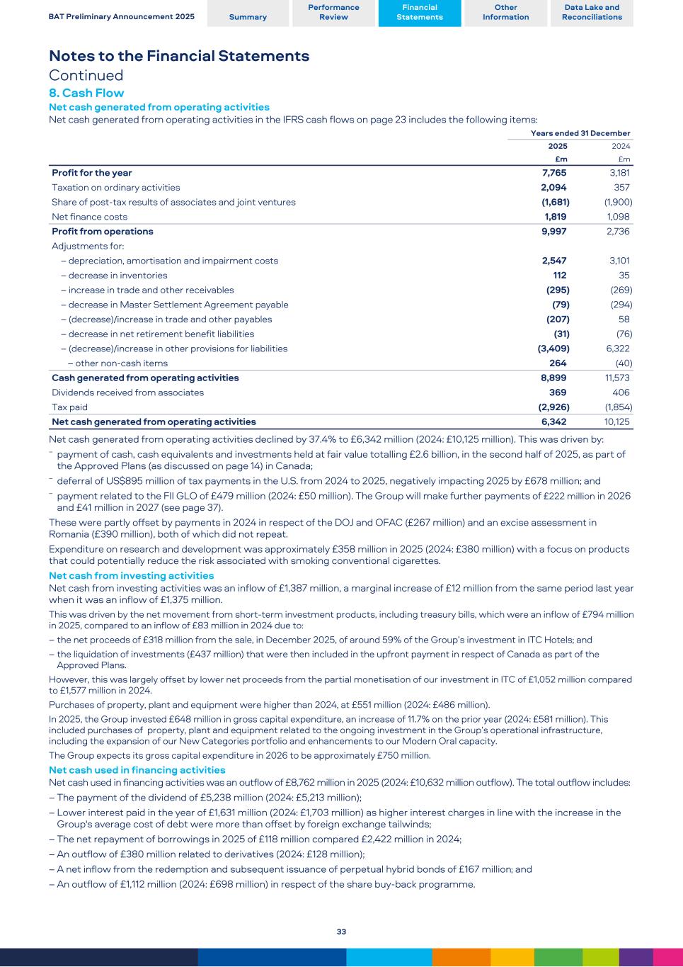 Notes to the Financial Statements Continued 8. Cash Flow Net cash generated from operating activities Net cash generated from operating activities in the IFRS cash flows on page 23 includes the following items: Years ended 31 December 2025 2024 £m £m Profit for the year 7,765 3,181 Taxation on ordinary activities 2,094 357 Share of post-tax results of associates and joint ventures (1,681) (1,900) Net finance costs 1,819 1,098 Profit from operations 9,997 2,736 Adjustments for: – depreciation, amortisation and impairment costs 2,547 3,101 – decrease in inventories 112 35 – increase in trade and other receivables (295) (269) – decrease in Master Settlement Agreement payable (79) (294) – (decrease)/increase in trade and other payables (207) 58 – decrease in net retirement benefit liabilities (31) (76) – (decrease)/increase in other provisions for liabilities (3,409) 6,322 – other non-cash items 264 (40) Cash generated from operating activities 8,899 11,573 Dividends received from associates 369 406 Tax paid (2,926) (1,854) Net cash generated from operating activities 6,342 10,125 Net cash generated from operating activities declined by 37.4% to £6,342 million (2024: £10,125 million). This was driven by: – payment of cash, cash equivalents and investments held at fair value totalling £2.6 billion, in the second half of 2025, as part of the Approved Plans (as discussed on page 14) in Canada; – deferral of US$895 million of tax payments in the U.S. from 2024 to 2025, negatively impacting 2025 by £678 million; and – payment related to the FII GLO of £479 million (2024: £50 million). The Group will make further payments of £222 million in 2026 and £41 million in 2027 (see page 37). These were partly offset by payments in 2024 in respect of the DOJ and OFAC (£267 million) and an excise assessment in Romania (£390 million), both of which did not repeat. Expenditure on research and development was approximately £358 million in 2025 (2024: £380 million) with a focus on products that could potentially reduce the risk associated with smoking conventional cigarettes. Net cash from investing activities Net cash from investing activities was an inflow of £1,387 million, a marginal increase of £12 million from the same period last year when it was an inflow of £1,375 million. This was driven by the net movement from short-term investment products, including treasury bills, which were an inflow of £794 million in 2025, compared to an inflow of £83 million in 2024 due to: – the net proceeds of £318 million from the sale, in December 2025, of around 59% of the Group’s investment in ITC Hotels; and – the liquidation of investments (£437 million) that were then included in the upfront payment in respect of Canada as part of the Approved Plans. However, this was largely offset by lower net proceeds from the partial monetisation of our investment in ITC of £1,052 million compared to £1,577 million in 2024. Purchases of property, plant and equipment were higher than 2024, at £551 million (2024: £486 million). In 2025, the Group invested £648 million in gross capital expenditure, an increase of 11.7% on the prior year (2024: £581 million). This included purchases of property, plant and equipment related to the ongoing investment in the Group’s operational infrastructure, including the expansion of our New Categories portfolio and enhancements to our Modern Oral capacity. The Group expects its gross capital expenditure in 2026 to be approximately £750 million. Net cash used in financing activities Net cash used in financing activities was an outflow of £8,762 million in 2025 (2024: £10,632 million outflow). The total outflow includes: – The payment of the dividend of £5,238 million (2024: £5,213 million); – Lower interest paid in the year of £1,631 million (2024: £1,703 million) as higher interest charges in line with the increase in the Group's average cost of debt were more than offset by foreign exchange tailwinds; – The net repayment of borrowings in 2025 of £118 million compared £2,422 million in 2024; – An outflow of £380 million related to derivatives (2024: £128 million); – A net inflow from the redemption and subsequent issuance of perpetual hybrid bonds of £167 million; and – An outflow of £1,112 million (2024: £698 million) in respect of the share buy-back programme. BAT Preliminary Announcement 2025 Summary Performance Review Financial Statements Other Information Data Lake and Reconciliations 33