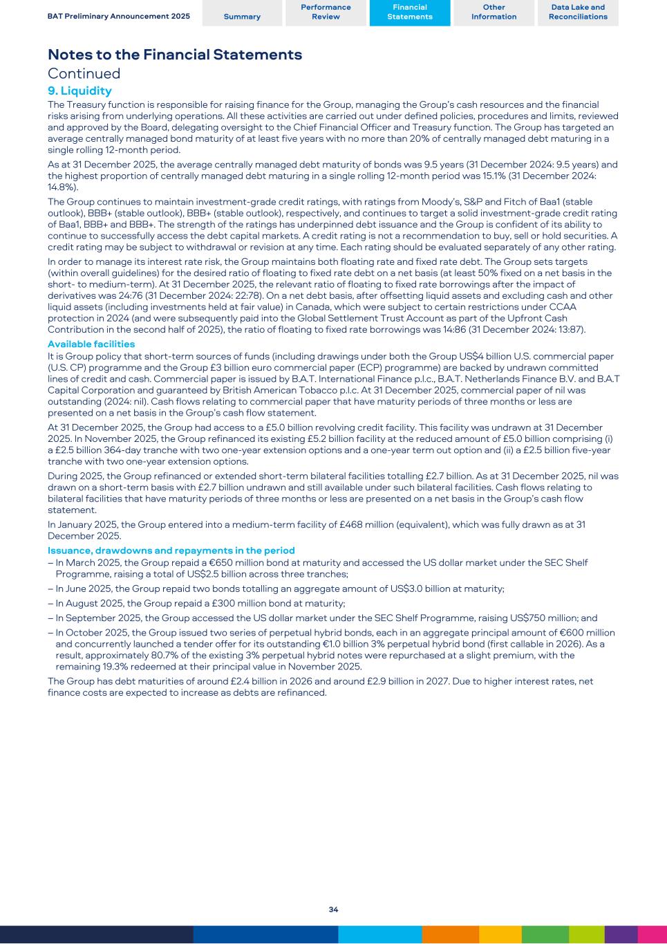 Notes to the Financial Statements Continued 9. Liquidity The Treasury function is responsible for raising finance for the Group, managing the Group’s cash resources and the financial risks arising from underlying operations. All these activities are carried out under defined policies, procedures and limits, reviewed and approved by the Board, delegating oversight to the Chief Financial Officer and Treasury function. The Group has targeted an average centrally managed bond maturity of at least five years with no more than 20% of centrally managed debt maturing in a single rolling 12-month period. As at 31 December 2025, the average centrally managed debt maturity of bonds was 9.5 years (31 December 2024: 9.5 years) and the highest proportion of centrally managed debt maturing in a single rolling 12-month period was 15.1% (31 December 2024: 14.8%). The Group continues to maintain investment-grade credit ratings, with ratings from Moody’s, S&P and Fitch of Baa1 (stable outlook), BBB+ (stable outlook), BBB+ (stable outlook), respectively, and continues to target a solid investment-grade credit rating of Baa1, BBB+ and BBB+. The strength of the ratings has underpinned debt issuance and the Group is confident of its ability to continue to successfully access the debt capital markets. A credit rating is not a recommendation to buy, sell or hold securities. A credit rating may be subject to withdrawal or revision at any time. Each rating should be evaluated separately of any other rating. In order to manage its interest rate risk, the Group maintains both floating rate and fixed rate debt. The Group sets targets (within overall guidelines) for the desired ratio of floating to fixed rate debt on a net basis (at least 50% fixed on a net basis in the short- to medium-term). At 31 December 2025, the relevant ratio of floating to fixed rate borrowings after the impact of derivatives was 24:76 (31 December 2024: 22:78). On a net debt basis, after offsetting liquid assets and excluding cash and other liquid assets (including investments held at fair value) in Canada, which were subject to certain restrictions under CCAA protection in 2024 (and were subsequently paid into the Global Settlement Trust Account as part of the Upfront Cash Contribution in the second half of 2025), the ratio of floating to fixed rate borrowings was 14:86 (31 December 2024: 13:87). Available facilities It is Group policy that short-term sources of funds (including drawings under both the Group US$4 billion U.S. commercial paper (U.S. CP) programme and the Group £3 billion euro commercial paper (ECP) programme) are backed by undrawn committed lines of credit and cash. Commercial paper is issued by B.A.T. International Finance p.l.c., B.A.T. Netherlands Finance B.V. and B.A.T Capital Corporation and guaranteed by British American Tobacco p.l.c. At 31 December 2025, commercial paper of nil was outstanding (2024: nil). Cash flows relating to commercial paper that have maturity periods of three months or less are presented on a net basis in the Group’s cash flow statement. At 31 December 2025, the Group had access to a £5.0 billion revolving credit facility. This facility was undrawn at 31 December 2025. In November 2025, the Group refinanced its existing £5.2 billion facility at the reduced amount of £5.0 billion comprising (i) a £2.5 billion 364-day tranche with two one-year extension options and a one-year term out option and (ii) a £2.5 billion five-year tranche with two one-year extension options. During 2025, the Group refinanced or extended short-term bilateral facilities totalling £2.7 billion. As at 31 December 2025, nil was drawn on a short-term basis with £2.7 billion undrawn and still available under such bilateral facilities. Cash flows relating to bilateral facilities that have maturity periods of three months or less are presented on a net basis in the Group’s cash flow statement. In January 2025, the Group entered into a medium-term facility of £468 million (equivalent), which was fully drawn as at 31 December 2025. Issuance, drawdowns and repayments in the period – In March 2025, the Group repaid a €650 million bond at maturity and accessed the US dollar market under the SEC Shelf Programme, raising a total of US$2.5 billion across three tranches; – In June 2025, the Group repaid two bonds totalling an aggregate amount of US$3.0 billion at maturity; – In August 2025, the Group repaid a £300 million bond at maturity; – In September 2025, the Group accessed the US dollar market under the SEC Shelf Programme, raising US$750 million; and – In October 2025, the Group issued two series of perpetual hybrid bonds, each in an aggregate principal amount of €600 million and concurrently launched a tender offer for its outstanding €1.0 billion 3% perpetual hybrid bond (first callable in 2026). As a result, approximately 80.7% of the existing 3% perpetual hybrid notes were repurchased at a slight premium, with the remaining 19.3% redeemed at their principal value in November 2025. The Group has debt maturities of around £2.4 billion in 2026 and around £2.9 billion in 2027. Due to higher interest rates, net finance costs are expected to increase as debts are refinanced. BAT Preliminary Announcement 2025 Summary Performance Review Financial Statements Other Information Data Lake and Reconciliations 34