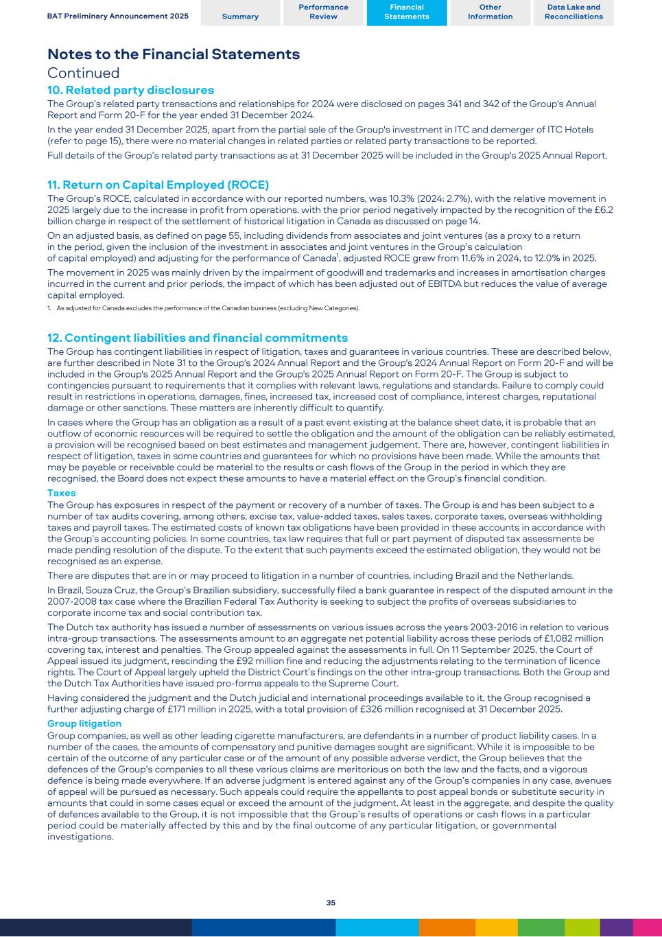 Notes to the Financial Statements Continued 10. Related party disclosures The Group’s related party transactions and relationships for 2024 were disclosed on pages 341 and 342 of the Group's Annual Report and Form 20-F for the year ended 31 December 2024. In the year ended 31 December 2025, apart from the partial sale of the Group's investment in ITC and demerger of ITC Hotels (refer to page 15), there were no material changes in related parties or related party transactions to be reported. Full details of the Group’s related party transactions as at 31 December 2025 will be included in the Group's 2025 Annual Report. 11. Return on Capital Employed (ROCE) The Group’s ROCE, calculated in accordance with our reported numbers, was 10.3% (2024: 2.7%), with the relative movement in 2025 largely due to the increase in profit from operations. with the prior period negatively impacted by the recognition of the £6.2 billion charge in respect of the settlement of historical litigation in Canada as discussed on page 14. On an adjusted basis, as defined on page 55, including dividends from associates and joint ventures (as a proxy to a return in the period, given the inclusion of the investment in associates and joint ventures in the Group’s calculation of capital employed) and adjusting for the performance of Canada1, adjusted ROCE grew from 11.6% in 2024, to 12.0% in 2025. The movement in 2025 was mainly driven by the impairment of goodwill and trademarks and increases in amortisation charges incurred in the current and prior periods, the impact of which has been adjusted out of EBITDA but reduces the value of average capital employed. 1. As adjusted for Canada excludes the performance of the Canadian business (excluding New Categories). 12. Contingent liabilities and financial commitments The Group has contingent liabilities in respect of litigation, taxes and guarantees in various countries. These are described below, are further described in Note 31 to the Group's 2024 Annual Report and the Group's 2024 Annual Report on Form 20-F and will be included in the Group's 2025 Annual Report and the Group's 2025 Annual Report on Form 20-F. The Group is subject to contingencies pursuant to requirements that it complies with relevant laws, regulations and standards. Failure to comply could result in restrictions in operations, damages, fines, increased tax, increased cost of compliance, interest charges, reputational damage or other sanctions. These matters are inherently difficult to quantify. In cases where the Group has an obligation as a result of a past event existing at the balance sheet date, it is probable that an outflow of economic resources will be required to settle the obligation and the amount of the obligation can be reliably estimated, a provision will be recognised based on best estimates and management judgement. There are, however, contingent liabilities in respect of litigation, taxes in some countries and guarantees for which no provisions have been made. While the amounts that may be payable or receivable could be material to the results or cash flows of the Group in the period in which they are recognised, the Board does not expect these amounts to have a material effect on the Group’s financial condition. Taxes The Group has exposures in respect of the payment or recovery of a number of taxes. The Group is and has been subject to a number of tax audits covering, among others, excise tax, value-added taxes, sales taxes, corporate taxes, overseas withholding taxes and payroll taxes. The estimated costs of known tax obligations have been provided in these accounts in accordance with the Group’s accounting policies. In some countries, tax law requires that full or part payment of disputed tax assessments be made pending resolution of the dispute. To the extent that such payments exceed the estimated obligation, they would not be recognised as an expense. There are disputes that are in or may proceed to litigation in a number of countries, including Brazil and the Netherlands. In Brazil, Souza Cruz, the Group’s Brazilian subsidiary, successfully filed a bank guarantee in respect of the disputed amount in the 2007-2008 tax case where the Brazilian Federal Tax Authority is seeking to subject the profits of overseas subsidiaries to corporate income tax and social contribution tax. The Dutch tax authority has issued a number of assessments on various issues across the years 2003-2016 in relation to various intra-group transactions. The assessments amount to an aggregate net potential liability across these periods of £1,082 million covering tax, interest and penalties. The Group appealed against the assessments in full. On 11 September 2025, the Court of Appeal issued its judgment, rescinding the £92 million fine and reducing the adjustments relating to the termination of licence rights. The Court of Appeal largely upheld the District Court’s findings on the other intra-group transactions. Both the Group and the Dutch Tax Authorities have issued pro-forma appeals to the Supreme Court. Having considered the judgment and the Dutch judicial and international proceedings available to it, the Group recognised a further adjusting charge of £171 million in 2025, with a total provision of £326 million recognised at 31 December 2025. Group litigation Group companies, as well as other leading cigarette manufacturers, are defendants in a number of product liability cases. In a number of the cases, the amounts of compensatory and punitive damages sought are significant. While it is impossible to be certain of the outcome of any particular case or of the amount of any possible adverse verdict, the Group believes that the defences of the Group’s companies to all these various claims are meritorious on both the law and the facts, and a vigorous defence is being made everywhere. If an adverse judgment is entered against any of the Group’s companies in any case, avenues of appeal w