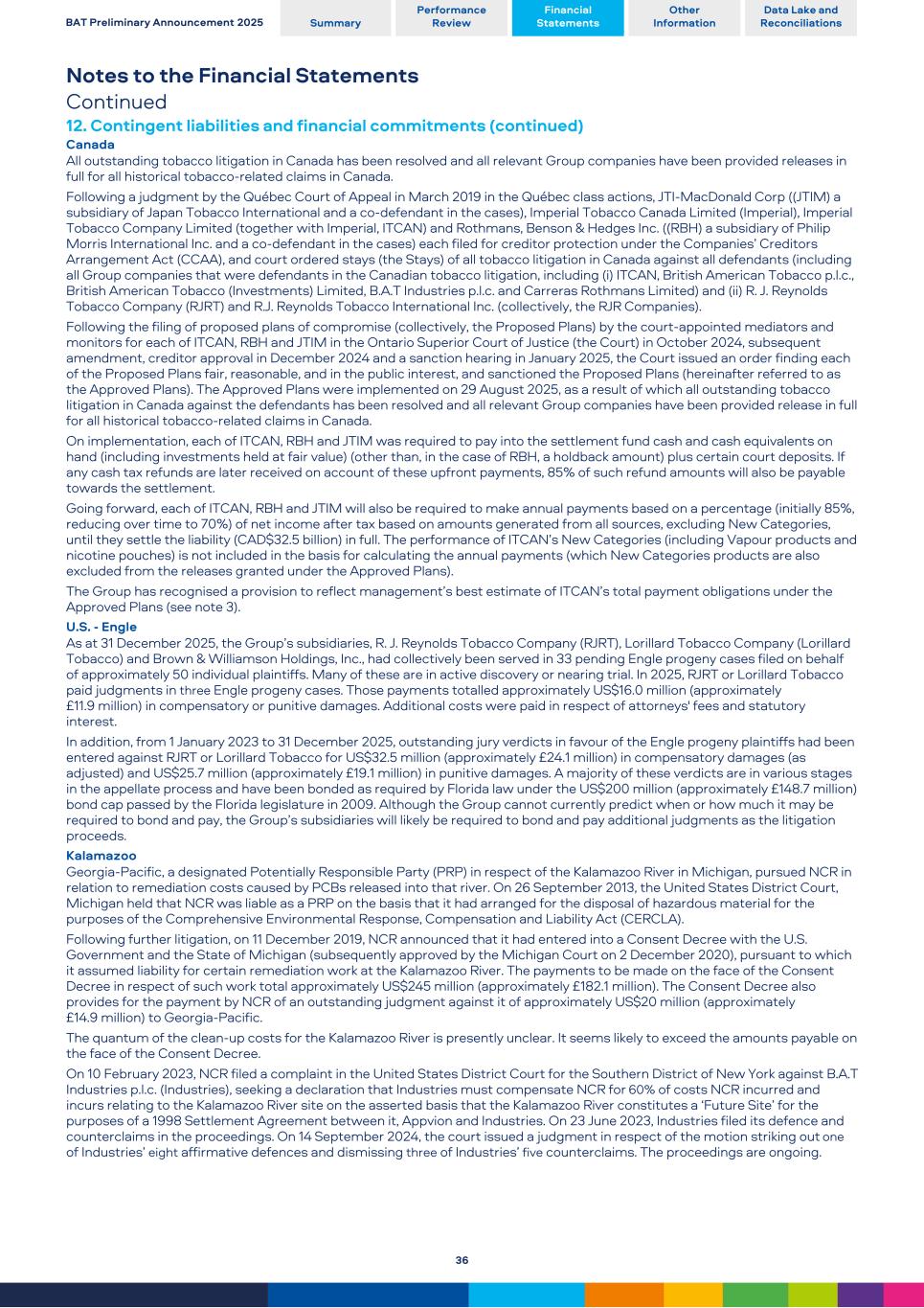 Notes to the Financial Statements Continued 12. Contingent liabilities and financial commitments (continued) Canada All outstanding tobacco litigation in Canada has been resolved and all relevant Group companies have been provided releases in full for all historical tobacco-related claims in Canada. Following a judgment by the Québec Court of Appeal in March 2019 in the Québec class actions, JTI-MacDonald Corp ((JTIM) a subsidiary of Japan Tobacco International and a co-defendant in the cases), Imperial Tobacco Canada Limited (Imperial), Imperial Tobacco Company Limited (together with Imperial, ITCAN) and Rothmans, Benson & Hedges Inc. ((RBH) a subsidiary of Philip Morris International Inc. and a co-defendant in the cases) each filed for creditor protection under the Companies’ Creditors Arrangement Act (CCAA), and court ordered stays (the Stays) of all tobacco litigation in Canada against all defendants (including all Group companies that were defendants in the Canadian tobacco litigation, including (i) ITCAN, British American Tobacco p.l.c., British American Tobacco (Investments) Limited, B.A.T Industries p.l.c. and Carreras Rothmans Limited) and (ii) R. J. Reynolds Tobacco Company (RJRT) and R.J. Reynolds Tobacco International Inc. (collectively, the RJR Companies). Following the filing of proposed plans of compromise (collectively, the Proposed Plans) by the court-appointed mediators and monitors for each of ITCAN, RBH and JTIM in the Ontario Superior Court of Justice (the Court) in October 2024, subsequent amendment, creditor approval in December 2024 and a sanction hearing in January 2025, the Court issued an order finding each of the Proposed Plans fair, reasonable, and in the public interest, and sanctioned the Proposed Plans (hereinafter referred to as the Approved Plans). The Approved Plans were implemented on 29 August 2025, as a result of which all outstanding tobacco litigation in Canada against the defendants has been resolved and all relevant Group companies have been provided release in full for all historical tobacco-related claims in Canada. On implementation, each of ITCAN, RBH and JTIM was required to pay into the settlement fund cash and cash equivalents on hand (including investments held at fair value) (other than, in the case of RBH, a holdback amount) plus certain court deposits. If any cash tax refunds are later received on account of these upfront payments, 85% of such refund amounts will also be payable towards the settlement. Going forward, each of ITCAN, RBH and JTIM will also be required to make annual payments based on a percentage (initially 85%, reducing over time to 70%) of net income after tax based on amounts generated from all sources, excluding New Categories, until they settle the liability (CAD$32.5 billion) in full. The performance of ITCAN’s New Categories (including Vapour products and nicotine pouches) is not included in the basis for calculating the annual payments (which New Categories products are also excluded from the releases granted under the Approved Plans). The Group has recognised a provision to reflect management’s best estimate of ITCAN’s total payment obligations under the Approved Plans (see note 3). U.S. - Engle As at 31 December 2025, the Group’s subsidiaries, R. J. Reynolds Tobacco Company (RJRT), Lorillard Tobacco Company (Lorillard Tobacco) and Brown & Williamson Holdings, Inc., had collectively been served in 33 pending Engle progeny cases filed on behalf of approximately 50 individual plaintiffs. Many of these are in active discovery or nearing trial. In 2025, RJRT or Lorillard Tobacco paid judgments in three Engle progeny cases. Those payments totalled approximately US$16.0 million (approximately £11.9 million) in compensatory or punitive damages. Additional costs were paid in respect of attorneys' fees and statutory interest. In addition, from 1 January 2023 to 31 December 2025, outstanding jury verdicts in favour of the Engle progeny plaintiffs had been entered against RJRT or Lorillard Tobacco for US$32.5 million (approximately £24.1 million) in compensatory damages (as adjusted) and US$25.7 million (approximately £19.1 million) in punitive damages. A majority of these verdicts are in various stages in the appellate process and have been bonded as required by Florida law under the US$200 million (approximately £148.7 million) bond cap passed by the Florida legislature in 2009. Although the Group cannot currently predict when or how much it may be required to bond and pay, the Group’s subsidiaries will likely be required to bond and pay additional judgments as the litigation proceeds. Kalamazoo Georgia-Pacific, a designated Potentially Responsible Party (PRP) in respect of the Kalamazoo River in Michigan, pursued NCR in relation to remediation costs caused by PCBs released into that river. On 26 September 2013, the United States District Court, Michigan held that NCR was liable as a PRP on the basis that it had arranged for the disposal of hazardous material for the purposes of the Comprehensive Environmental Response, Compensation and Liability Act (CERCLA). Following further litigation, on 11 December 2019, NCR announced that it had entered into a Consent Decree with the U.S. Government and the State of Michigan (subsequently approved by the Michigan Court on 2 December 2020), pursuant to which it assumed liability for certain remediation work at the Kalamazoo River. The payments to be made on the face of the Consent Decree in respect of such work total approximately US$245 million (approximately £182.1 million). The Consent Decree also provides for the payment by NCR of an outstanding judgment against it of approximately US$20 million (approximately £14.9 million) to Georgia-Pacific. The quantum of the clean-up costs for the Kalamazoo River is presently unclear. It seems likely to exceed the amounts payable on the face of the Consent Decree. On 10 February 2023, NCR filed a complaint in the United