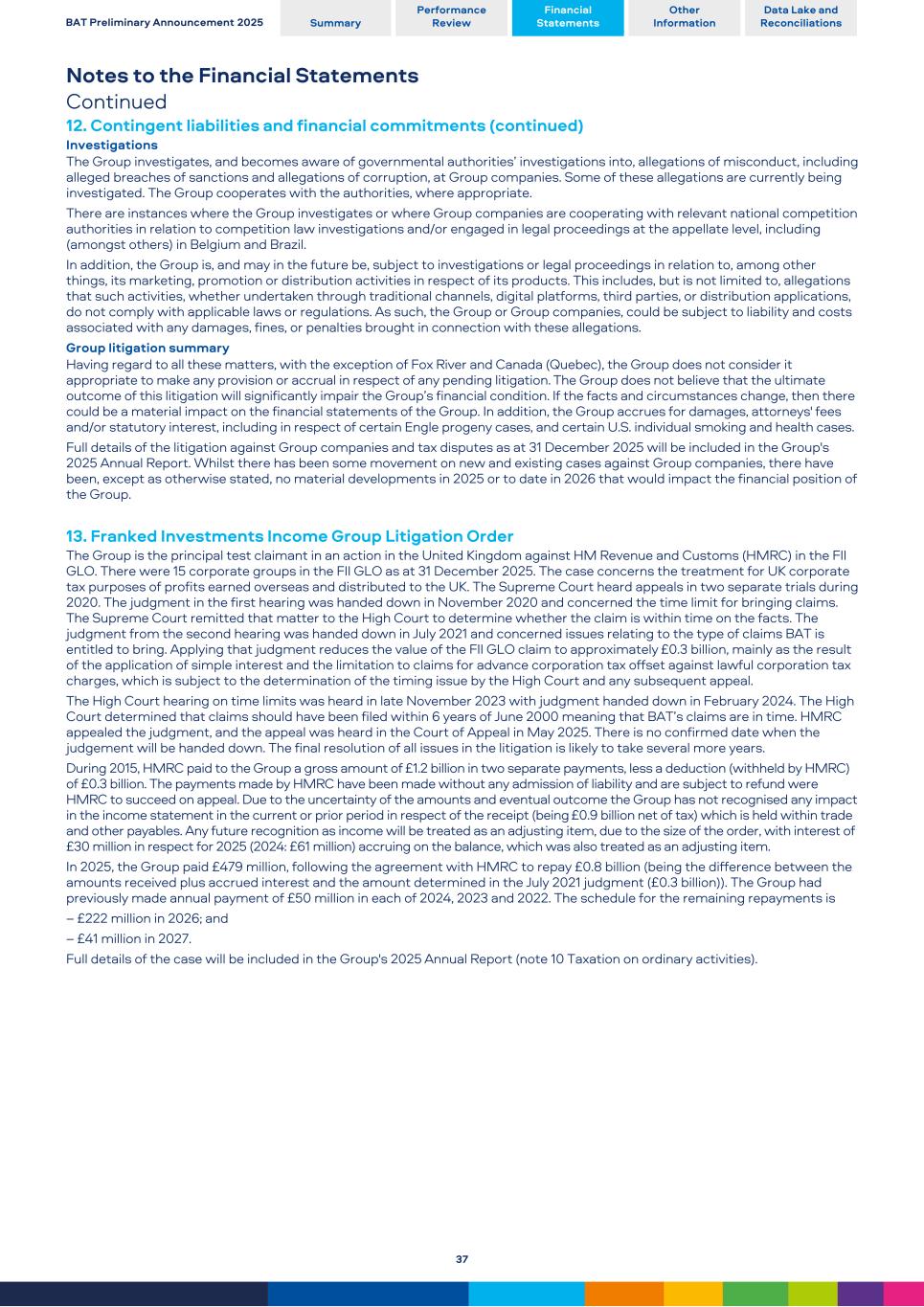 Notes to the Financial Statements Continued 12. Contingent liabilities and financial commitments (continued) Investigations The Group investigates, and becomes aware of governmental authorities’ investigations into, allegations of misconduct, including alleged breaches of sanctions and allegations of corruption, at Group companies. Some of these allegations are currently being investigated. The Group cooperates with the authorities, where appropriate. There are instances where the Group investigates or where Group companies are cooperating with relevant national competition authorities in relation to competition law investigations and/or engaged in legal proceedings at the appellate level, including (amongst others) in Belgium and Brazil. In addition, the Group is, and may in the future be, subject to investigations or legal proceedings in relation to, among other things, its marketing, promotion or distribution activities in respect of its products. This includes, but is not limited to, allegations that such activities, whether undertaken through traditional channels, digital platforms, third parties, or distribution applications, do not comply with applicable laws or regulations. As such, the Group or Group companies, could be subject to liability and costs associated with any damages, fines, or penalties brought in connection with these allegations. Group litigation summary Having regard to all these matters, with the exception of Fox River and Canada (Quebec), the Group does not consider it appropriate to make any provision or accrual in respect of any pending litigation. The Group does not believe that the ultimate outcome of this litigation will significantly impair the Group’s financial condition. If the facts and circumstances change, then there could be a material impact on the financial statements of the Group. In addition, the Group accrues for damages, attorneys' fees and/or statutory interest, including in respect of certain Engle progeny cases, and certain U.S. individual smoking and health cases. Full details of the litigation against Group companies and tax disputes as at 31 December 2025 will be included in the Group's 2025 Annual Report. Whilst there has been some movement on new and existing cases against Group companies, there have been, except as otherwise stated, no material developments in 2025 or to date in 2026 that would impact the financial position of the Group. 13. Franked Investments Income Group Litigation Order The Group is the principal test claimant in an action in the United Kingdom against HM Revenue and Customs (HMRC) in the FII GLO. There were 15 corporate groups in the FII GLO as at 31 December 2025. The case concerns the treatment for UK corporate tax purposes of profits earned overseas and distributed to the UK. The Supreme Court heard appeals in two separate trials during 2020. The judgment in the first hearing was handed down in November 2020 and concerned the time limit for bringing claims. The Supreme Court remitted that matter to the High Court to determine whether the claim is within time on the facts. The judgment from the second hearing was handed down in July 2021 and concerned issues relating to the type of claims BAT is entitled to bring. Applying that judgment reduces the value of the FII GLO claim to approximately £0.3 billion, mainly as the result of the application of simple interest and the limitation to claims for advance corporation tax offset against lawful corporation tax charges, which is subject to the determination of the timing issue by the High Court and any subsequent appeal. The High Court hearing on time limits was heard in late November 2023 with judgment handed down in February 2024. The High Court determined that claims should have been filed within 6 years of June 2000 meaning that BAT’s claims are in time. HMRC appealed the judgment, and the appeal was heard in the Court of Appeal in May 2025. There is no confirmed date when the judgement will be handed down. The final resolution of all issues in the litigation is likely to take several more years. During 2015, HMRC paid to the Group a gross amount of £1.2 billion in two separate payments, less a deduction (withheld by HMRC) of £0.3 billion. The payments made by HMRC have been made without any admission of liability and are subject to refund were HMRC to succeed on appeal. Due to the uncertainty of the amounts and eventual outcome the Group has not recognised any impact in the income statement in the current or prior period in respect of the receipt (being £0.9 billion net of tax) which is held within trade and other payables. Any future recognition as income will be treated as an adjusting item, due to the size of the order, with interest of £30 million in respect for 2025 (2024: £61 million) accruing on the balance, which was also treated as an adjusting item. In 2025, the Group paid £479 million, following the agreement with HMRC to repay £0.8 billion (being the difference between the amounts received plus accrued interest and the amount determined in the July 2021 judgment (£0.3 billion)). The Group had previously made annual payment of £50 million in each of 2024, 2023 and 2022. The schedule for the remaining repayments is – £222 million in 2026; and – £41 million in 2027. Full details of the case will be included in the Group's 2025 Annual Report (note 10 Taxation on ordinary activities). BAT Preliminary Announcement 2025 Summary Performance Review Financial Statements Other Information Data Lake and Reconciliations 37