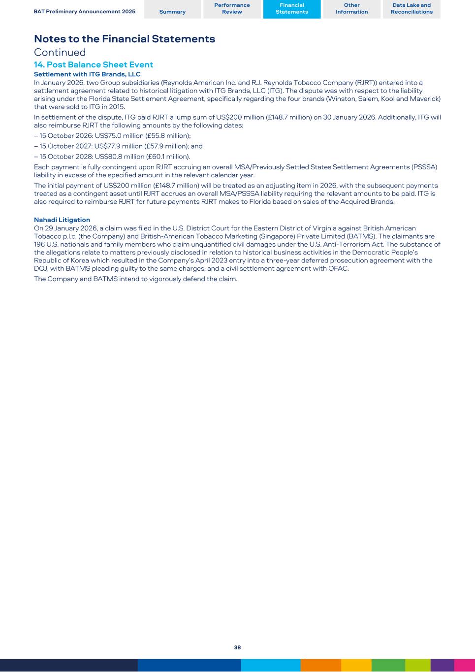 Notes to the Financial Statements Continued 14. Post Balance Sheet Event Settlement with ITG Brands, LLC In January 2026, two Group subsidiaries (Reynolds American Inc. and R.J. Reynolds Tobacco Company (RJRT)) entered into a settlement agreement related to historical litigation with ITG Brands, LLC (ITG). The dispute was with respect to the liability arising under the Florida State Settlement Agreement, specifically regarding the four brands (Winston, Salem, Kool and Maverick) that were sold to ITG in 2015. In settlement of the dispute, ITG paid RJRT a lump sum of US$200 million (£148.7 million) on 30 January 2026. Additionally, ITG will also reimburse RJRT the following amounts by the following dates: – 15 October 2026: US$75.0 million (£55.8 million); – 15 October 2027: US$77.9 million (£57.9 million); and – 15 October 2028: US$80.8 million (£60.1 million). Each payment is fully contingent upon RJRT accruing an overall MSA/Previously Settled States Settlement Agreements (PSSSA) liability in excess of the specified amount in the relevant calendar year. The initial payment of US$200 million (£148.7 million) will be treated as an adjusting item in 2026, with the subsequent payments treated as a contingent asset until RJRT accrues an overall MSA/PSSSA liability requiring the relevant amounts to be paid. ITG is also required to reimburse RJRT for future payments RJRT makes to Florida based on sales of the Acquired Brands. Nahadi Litigation On 29 January 2026, a claim was filed in the U.S. District Court for the Eastern District of Virginia against British American Tobacco p.l.c. (the Company) and British-American Tobacco Marketing (Singapore) Private Limited (BATMS). The claimants are 196 U.S. nationals and family members who claim unquantified civil damages under the U.S. Anti-Terrorism Act. The substance of the allegations relate to matters previously disclosed in relation to historical business activities in the Democratic People’s Republic of Korea which resulted in the Company’s April 2023 entry into a three-year deferred prosecution agreement with the DOJ, with BATMS pleading guilty to the same charges, and a civil settlement agreement with OFAC. The Company and BATMS intend to vigorously defend the claim. BAT Preliminary Announcement 2025 Summary Performance Review Financial Statements Other Information Data Lake and Reconciliations 38