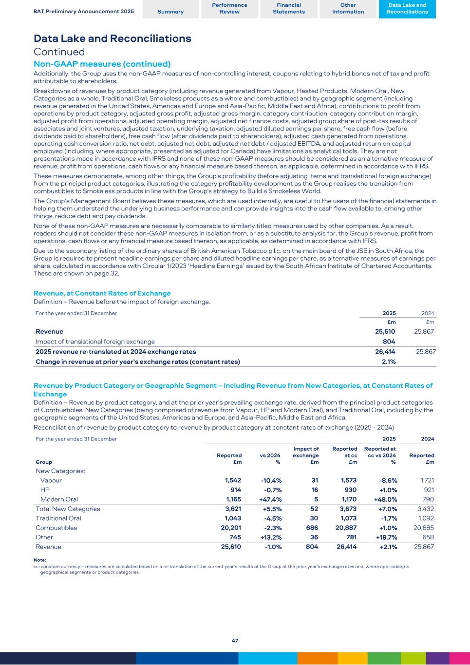 Data Lake and Reconciliations Continued Non-GAAP measures (continued) Additionally, the Group uses the non-GAAP measures of non-controlling interest, coupons relating to hybrid bonds net of tax and profit attributable to shareholders. Breakdowns of revenues by product category (including revenue generated from Vapour, Heated Products, Modern Oral, New Categories as a whole, Traditional Oral, Smokeless products as a whole and combustibles) and by geographic segment (including revenue generated in the United States, Americas and Europe and Asia-Pacific, Middle East and Africa), contributions to profit from operations by product category, adjusted gross profit, adjusted gross margin, category contribution, category contribution margin, adjusted profit from operations, adjusted operating margin, adjusted net finance costs, adjusted group share of post-tax results of associates and joint ventures, adjusted taxation, underlying taxation, adjusted diluted earnings per share, free cash flow (before dividends paid to shareholders), free cash flow (after dividends paid to shareholders), adjusted cash generated from operations, operating cash conversion ratio, net debt, adjusted net debt, adjusted net debt / adjusted EBITDA, and adjusted return on capital employed (including, where appropriate, presented as adjusted for Canada) have limitations as analytical tools. They are not presentations made in accordance with IFRS and none of these non-GAAP measures should be considered as an alternative measure of revenue, profit from operations, cash flows or any financial measure based thereon, as applicable, determined in accordance with IFRS. These measures demonstrate, among other things, the Group's profitability (before adjusting items and translational foreign exchange) from the principal product categories, illustrating the category profitability development as the Group realises the transition from combustibles to Smokeless products in line with the Group's strategy to Build a Smokeless World. The Group’s Management Board believes these measures, which are used internally, are useful to the users of the financial statements in helping them understand the underlying business performance and can provide insights into the cash flow available to, among other things, reduce debt and pay dividends. None of these non-GAAP measures are necessarily comparable to similarly titled measures used by other companies. As a result, readers should not consider these non-GAAP measures in isolation from, or as a substitute analysis for, the Group’s revenue, profit from operations, cash flows or any financial measure based thereon, as applicable, as determined in accordance with IFRS. Due to the secondary listing of the ordinary shares of British American Tobacco p.l.c. on the main board of the JSE in South Africa, the Group is required to present headline earnings per share and diluted headline earnings per share, as alternative measures of earnings per share, calculated in accordance with Circular 1/2023 ‘Headline Earnings’ issued by the South African Institute of Chartered Accountants. These are shown on page 32. Revenue, at Constant Rates of Exchange Definition – Revenue before the impact of foreign exchange. For the year ended 31 December 2025 2024 £m £m Revenue 25,610 25,867 Impact of translational foreign exchange 804 2025 revenue re-translated at 2024 exchange rates 26,414 25,867 Change in revenue at prior year’s exchange rates (constant rates) 2.1% Revenue by Product Category or Geographic Segment – Including Revenue from New Categories, at Constant Rates of Exchange Definition – Revenue by product category, and at the prior year’s prevailing exchange rate, derived from the principal product categories of Combustibles, New Categories (being comprised of revenue from Vapour, HP and Modern Oral), and Traditional Oral, including by the geographic segments of the United States, Americas and Europe, and Asia-Pacific, Middle East and Africa. Reconciliation of revenue by product category to revenue by product category at constant rates of exchange (2025 - 2024) For the year ended 31 December 2025 2024 Group Reported £m vs 2024 % Impact of exchange £m Reported at cc £m Reported at cc vs 2024 % Reported £m New Categories: Vapour 1,542 -10.4% 31 1,573 -8.6% 1,721 HP 914 -0.7% 16 930 +1.0% 921 Modern Oral 1,165 +47.4% 5 1,170 +48.0% 790 Total New Categories 3,621 +5.5% 52 3,673 +7.0% 3,432 Traditional Oral 1,043 -4.5% 30 1,073 -1.7% 1,092 Combustibles 20,201 -2.3% 686 20,887 +1.0% 20,685 Other 745 +13.2% 36 781 +18.7% 658 Revenue 25,610 -1.0% 804 26,414 +2.1% 25,867 Note: cc: constant currency – measures are calculated based on a re-translation of the current year’s results of the Group at the prior year’s exchange rates and, where applicable, its geographical segments or product categories. BAT Preliminary Announcement 2025 Summary Performance Review Financial Statements Other Information Data Lake and Reconciliations 47