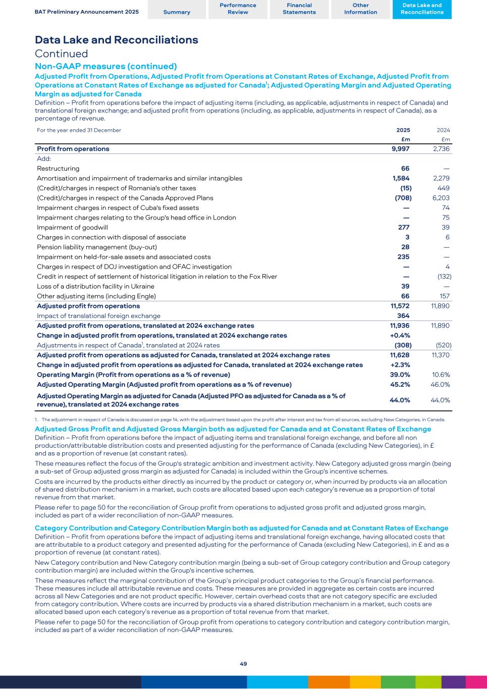 Data Lake and Reconciliations Continued Non-GAAP measures (continued) Adjusted Profit from Operations, Adjusted Profit from Operations at Constant Rates of Exchange, Adjusted Profit from Operations at Constant Rates of Exchange as adjusted for Canada1; Adjusted Operating Margin and Adjusted Operating Margin as adjusted for Canada Definition – Profit from operations before the impact of adjusting items (including, as applicable, adjustments in respect of Canada) and translational foreign exchange; and adjusted profit from operations (including, as applicable, adjustments in respect of Canada), as a percentage of revenue. For the year ended 31 December 2025 2024 £m £m Profit from operations 9,997 2,736 Add: Restructuring 66 — Amortisation and impairment of trademarks and similar intangibles 1,584 2,279 (Credit)/charges in respect of Romania's other taxes (15) 449 (Credit)/charges in respect of the Canada Approved Plans (708) 6,203 Impairment charges in respect of Cuba's fixed assets — 74 Impairment charges relating to the Group's head office in London — 75 Impairment of goodwill 277 39 Charges in connection with disposal of associate 3 6 Pension liability management (buy-out) 28 — Impairment on held-for-sale assets and associated costs 235 — Charges in respect of DOJ investigation and OFAC investigation — 4 Credit in respect of settlement of historical litigation in relation to the Fox River — (132) Loss of a distribution facility in Ukraine 39 — Other adjusting items (including Engle) 66 157 Adjusted profit from operations 11,572 11,890 Impact of translational foreign exchange 364 Adjusted profit from operations, translated at 2024 exchange rates 11,936 11,890 Change in adjusted profit from operations, translated at 2024 exchange rates +0.4% Adjustments in respect of Canada1, translated at 2024 rates (308) (520) Adjusted profit from operations as adjusted for Canada, translated at 2024 exchange rates 11,628 11,370 Change in adjusted profit from operations as adjusted for Canada, translated at 2024 exchange rates +2.3% Operating Margin (Profit from operations as a % of revenue) 39.0% 10.6% Adjusted Operating Margin (Adjusted profit from operations as a % of revenue) 45.2% 46.0% Adjusted Operating Margin as adjusted for Canada (Adjusted PFO as adjusted for Canada as a % of revenue), translated at 2024 exchange rates 44.0% 44.0% 1. The adjustment in respect of Canada is discussed on page 14, with the adjustment based upon the profit after interest and tax from all sources, excluding New Categories, in Canada. Adjusted Gross Profit and Adjusted Gross Margin both as adjusted for Canada and at Constant Rates of Exchange Definition – Profit from operations before the impact of adjusting items and translational foreign exchange, and before all non production/attributable distribution costs and presented adjusting for the performance of Canada (excluding New Categories), in £ and as a proportion of revenue (at constant rates). These measures reflect the focus of the Group's strategic ambition and investment activity. New Category adjusted gross margin (being a sub-set of Group adjusted gross margin as adjusted for Canada) is included within the Group's incentive schemes. Costs are incurred by the products either directly as incurred by the product or category or, when incurred by products via an allocation of shared distribution mechanism in a market, such costs are allocated based upon each category’s revenue as a proportion of total revenue from that market. Please refer to page 50 for the reconciliation of Group profit from operations to adjusted gross profit and adjusted gross margin, included as part of a wider reconciliation of non-GAAP measures. Category Contribution and Category Contribution Margin both as adjusted for Canada and at Constant Rates of Exchange Definition – Profit from operations before the impact of adjusting items and translational foreign exchange, having allocated costs that are attributable to a product category and presented adjusting for the performance of Canada (excluding New Categories), in £ and as a proportion of revenue (at constant rates). New Category contribution and New Category contribution margin (being a sub-set of Group category contribution and Group category contribution margin) are included within the Group's incentive schemes. These measures reflect the marginal contribution of the Group’s principal product categories to the Group’s financial performance. These measures include all attributable revenue and costs. These measures are provided in aggregate as certain costs are incurred across all New Categories and are not product specific. However, certain overhead costs that are not category specific are excluded from category contribution. Where costs are incurred by products via a shared distribution mechanism in a market, such costs are allocated based upon each category’s revenue as a proportion of total revenue from that market. Please refer to page 50 for the reconciliation of Group profit from operations to category contribution and category contribution margin, included as part of a wider reconciliation of non-GAAP measures. BAT Preliminary Announcement 2025 Summary Performance Review Financial Statements Other Information Data Lake and Reconciliations 49