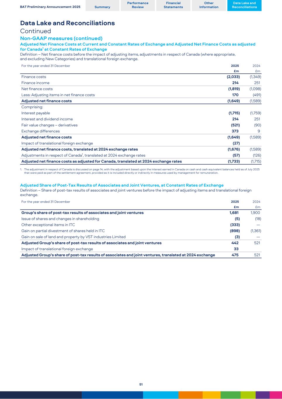 Data Lake and Reconciliations Continued Non-GAAP measures (continued) Adjusted Net Finance Costs at Current and Constant Rates of Exchange and Adjusted Net Finance Costs as adjusted for Canada1 at Constant Rates of Exchange Definition – Net finance costs before the impact of adjusting items, adjustments in respect of Canada (where appropriate, and excluding New Categories) and translational foreign exchange. For the year ended 31 December 2025 2024 £m £m Finance costs (2,033) (1,349) Finance income 214 251 Net finance costs (1,819) (1,098) Less: Adjusting items in net finance costs 170 (491) Adjusted net finance costs (1,649) (1,589) Comprising: Interest payable (1,715) (1,759) Interest and dividend income 214 251 Fair value changes – derivatives (521) (90) Exchange differences 373 9 Adjusted net finance costs (1,649) (1,589) Impact of translational foreign exchange (27) Adjusted net finance costs, translated at 2024 exchange rates (1,676) (1,589) Adjustments in respect of Canada1, translated at 2024 exchange rates (57) (126) Adjusted net finance costs as adjusted for Canada, translated at 2024 exchange rates (1,733) (1,715) 1. The adjustment in respect of Canada is discussed on page 14, with the adjustment based upon the interest earned in Canada on cash and cash equivalent balances held as of July 2025 that were paid as part of the settlement agreement, provided as it is included directly or indirectly in measures used by management for remuneration. Adjusted Share of Post-Tax Results of Associates and Joint Ventures, at Constant Rates of Exchange Definition – Share of post-tax results of associates and joint ventures before the impact of adjusting items and translational foreign exchange. For the year ended 31 December 2025 2024 £m £m Group’s share of post-tax results of associates and joint ventures 1,681 1,900 Issue of shares and changes in shareholding (5) (18) Other exceptional items in ITC (333) — Gain on partial divestment of shares held in ITC (898) (1,361) Gain on sale of land and property by VST industries Limited (3) — Adjusted Group’s share of post-tax results of associates and joint ventures 442 521 Impact of translational foreign exchange 33 Adjusted Group’s share of post-tax results of associates and joint ventures, translated at 2024 exchange 475 521 BAT Preliminary Announcement 2025 Summary Performance Review Financial Statements Other Information Data Lake and Reconciliations 51