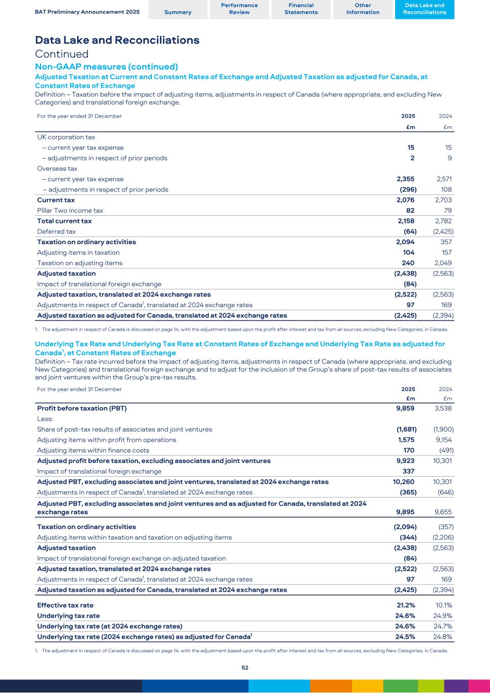 Data Lake and Reconciliations Continued Non-GAAP measures (continued) Adjusted Taxation at Current and Constant Rates of Exchange and Adjusted Taxation as adjusted for Canada, at Constant Rates of Exchange Definition – Taxation before the impact of adjusting items, adjustments in respect of Canada (where appropriate, and excluding New Categories) and translational foreign exchange. For the year ended 31 December 2025 2024 £m £m UK corporation tax – current year tax expense 15 15 – adjustments in respect of prior periods 2 9 Overseas tax – current year tax expense 2,355 2,571 – adjustments in respect of prior periods (296) 108 Current tax 2,076 2,703 Pillar Two income tax 82 79 Total current tax 2,158 2,782 Deferred tax (64) (2,425) Taxation on ordinary activities 2,094 357 Adjusting items in taxation 104 157 Taxation on adjusting items 240 2,049 Adjusted taxation (2,438) (2,563) Impact of translational foreign exchange (84) Adjusted taxation, translated at 2024 exchange rates (2,522) (2,563) Adjustments in respect of Canada1, translated at 2024 exchange rates 97 169 Adjusted taxation as adjusted for Canada, translated at 2024 exchange rates (2,425) (2,394) 1. The adjustment in respect of Canada is discussed on page 14, with the adjustment based upon the profit after interest and tax from all sources, excluding New Categories, in Canada. Underlying Tax Rate and Underlying Tax Rate at Constant Rates of Exchange and Underlying Tax Rate as adjusted for Canada1, at Constant Rates of Exchange Definition – Tax rate incurred before the impact of adjusting items, adjustments in respect of Canada (where appropriate, and excluding New Categories) and translational foreign exchange and to adjust for the inclusion of the Group’s share of post-tax results of associates and joint ventures within the Group’s pre-tax results. For the year ended 31 December 2025 2024 £m £m Profit before taxation (PBT) 9,859 3,538 Less: Share of post-tax results of associates and joint ventures (1,681) (1,900) Adjusting items within profit from operations 1,575 9,154 Adjusting items within finance costs 170 (491) Adjusted profit before taxation, excluding associates and joint ventures 9,923 10,301 Impact of translational foreign exchange 337 Adjusted PBT, excluding associates and joint ventures, translated at 2024 exchange rates 10,260 10,301 Adjustments in respect of Canada1, translated at 2024 exchange rates (365) (646) Adjusted PBT, excluding associates and joint ventures and as adjusted for Canada, translated at 2024 exchange rates 9,895 9,655 Taxation on ordinary activities (2,094) (357) Adjusting items within taxation and taxation on adjusting items (344) (2,206) Adjusted taxation (2,438) (2,563) Impact of translational foreign exchange on adjusted taxation (84) Adjusted taxation, translated at 2024 exchange rates (2,522) (2,563) Adjustments in respect of Canada1, translated at 2024 exchange rates 97 169 Adjusted taxation as adjusted for Canada, translated at 2024 exchange rates (2,425) (2,394) Effective tax rate 21.2% 10.1% Underlying tax rate 24.6% 24.9% Underlying tax rate (at 2024 exchange rates) 24.6% 24.7% Underlying tax rate (2024 exchange rates) as adjusted for Canada1 24.5% 24.8% 1. The adjustment in respect of Canada is discussed on page 14, with the adjustment based upon the profit after interest and tax from all sources, excluding New Categories, in Canada. BAT Preliminary Announcement 2025 Summary Performance Review Financial Statements Other Information Data Lake and Reconciliations 52