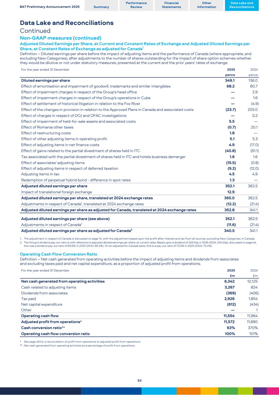 Data Lake and Reconciliations Continued Non-GAAP measures (continued) Adjusted Diluted Earnings per Share, at Current and Constant Rates of Exchange and Adjusted Diluted Earnings per Share, at Constant Rates of Exchange as adjusted for Canada1 Definition – Diluted earnings per share before the impact of adjusting items and the performance of Canada (where appropriate, and excluding New Categories), after adjustments to the number of shares outstanding for the impact of share option schemes whether they would be dilutive or not under statutory measures, presented at the current and the prior years’ rates of exchange. For the year ended 31 December 2025 2024 pence pence Diluted earnings per share 349.1 136.0 Effect of amortisation and impairment of goodwill, trademarks and similar intangibles 68.2 80.7 Effect of impairment charges in respect of the Group's head office — 2.9 Effect of impairment charges in respect of the Group's operations in Cuba — 1.6 Effect of settlement of historical litigation in relation to the Fox River — (4.9) Effect of the changes in provision in relation to the Approved Plans in Canada and associated costs (23.7) 205.0 Effect of charges in respect of DOJ and OFAC investigations — 0.2 Effect of impairment of held-for-sale assets and associated costs 5.5 — Effect of Romania other taxes (0.7) 20.1 Effect of restructuring costs 1.8 — Effect of other adjusting items in operating profit 5.1 5.3 Effect of adjusting items in net finance costs 4.9 (17.0) Effect of gains related to the partial divestment of shares held in ITC (40.8) (61.1) Tax associated with the partial divestment of shares held in ITC and hotels business demerger 1.6 1.6 Effect of associates’ adjusting items (15.5) (0.8) Effect of adjusting items in respect of deferred taxation (9.2) (12.0) Adjusting items in tax 4.5 4.9 Redemption of perpetual hybrid bond - difference in spot rates 1.3 — Adjusted diluted earnings per share 352.1 362.5 Impact of translational foreign exchange 12.9 Adjusted diluted earnings per share, translated at 2024 exchange rates 365.0 362.5 Adjustments in respect of Canada1, translated at 2024 exchange rates (12.2) (21.4) Adjusted diluted earnings per share as adjusted for Canada, translated at 2024 exchange rates 352.8 341.1 Adjusted diluted earnings per share (see above) 352.1 362.5 Adjustments in respect of Canada1 (11.6) (21.4) Adjusted diluted earnings per share as adjusted for Canada2 340.5 341.1 1. The adjustment in respect of Canada is discussed on page 14, with the adjustment based upon the profit after interest and tax from all sources, excluding New Categories, in Canada. 2. The Group’s dividend pay-out ratio is with reference to adjusted diluted earnings per share, at current rates. Based upon a dividend of 245.04p in 2025 (2024: 240.24p), discussed on page 44, this was a dividend pay-out ratio of 69.6% in 2025 (2024: 66.3%). On an adjusted for Canada basis, this is a pay-out ratio of 72.0% in 2025 (2024: 70.4%). Operating Cash Flow Conversion Ratio Definition – Net cash generated from operating activities before the impact of adjusting items and dividends from associates and excluding taxes paid and net capital expenditure, as a proportion of adjusted profit from operations. For the year ended 31 December 2025 2024 £m £m Net cash generated from operating activities 6,342 10,125 Cash related to adjusting items 3,267 824 Dividends from associates (369) (406) Tax paid 2,926 1,854 Net capital expenditure (612) (434) Other — 1 Operating cash flow 11,554 11,964 Adjusted profit from operations* 11,572 11,890 Cash conversion ratio** 63% 370% Operating cash flow conversion ratio 100% 101% * See page 49 for a reconciliation of profit from operations to adjusted profit from operations. ** Net cash generated from operating activities as a percentage of profit from operations. BAT Preliminary Announcement 2025 Summary Performance Review Financial Statements Other Information Data Lake and Reconciliations 53