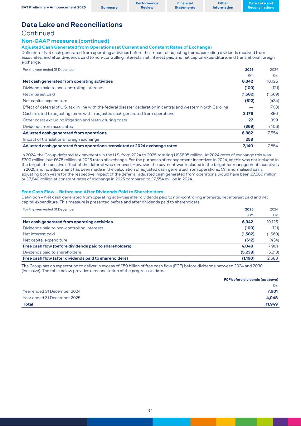 Data Lake and Reconciliations Continued Non-GAAP measures (continued) Adjusted Cash Generated from Operations (at Current and Constant Rates of Exchange) Definition – Net cash generated from operating activities before the impact of adjusting items, excluding dividends received from associates, and after dividends paid to non-controlling interests, net interest paid and net capital expenditure, and translational foreign exchange. For the year ended 31 December 2025 2024 £m £m Net cash generated from operating activities 6,342 10,125 Dividends paid to non-controlling interests (100) (121) Net interest paid (1,582) (1,669) Net capital expenditure (612) (434) Effect of deferral of U.S. tax, in line with the federal disaster declaration in central and western North Carolina — (700) Cash related to adjusting items within adjusted cash generated from operations 3,176 360 Other costs excluding litigation and restructuring costs 27 399 Dividends from associates (369) (406) Adjusted cash generated from operations 6,882 7,554 Impact of translational foreign exchange 258 Adjusted cash generated from operations, translated at 2024 exchange rates 7,140 7,554 In 2024, the Group deferred tax payments in the U.S. from 2024 to 2025 totalling US$895 million. At 2024 rates of exchange this was £700 million, but £678 million at 2025 rates of exchange. For the purposes of management incentives in 2024, as this was not included in the target, the positive effect of the deferral was removed. However, the payment was included in the target for management incentives in 2025 and no adjustment has been made in the calculation of adjusted cash generated from operations. On a normalised basis, adjusting both years for the respective impact of the deferral, adjusted cash generated from operations would have been £7,560 million, or £7,840 million at constant rates of exchange in 2025 compared to £7,554 million in 2024. Free Cash Flow – Before and After Dividends Paid to Shareholders Definition – Net cash generated from operating activities after dividends paid to non-controlling interests, net interest paid and net capital expenditure. This measure is presented before and after dividends paid to shareholders. For the year ended 31 December 2025 2024 £m £m Net cash generated from operating activities 6,342 10,125 Dividends paid to non-controlling interests (100) (121) Net interest paid (1,582) (1,669) Net capital expenditure (612) (434) Free cash flow (before dividends paid to shareholders) 4,048 7,901 Dividends paid to shareholders (5,238) (5,213) Free cash flow (after dividends paid to shareholders) (1,190) 2,688 The Group has an expectation to deliver in excess of £50 billion of free cash flow (FCF) before dividends between 2024 and 2030 (inclusive). The table below provides a reconciliation of the progress to date. FCF before dividends (as above) £m Year ended 31 December 2024 7,901 Year ended 31 December 2025 4,048 Total 11,949 BAT Preliminary Announcement 2025 Summary Performance Review Financial Statements Other Information Data Lake and Reconciliations 54