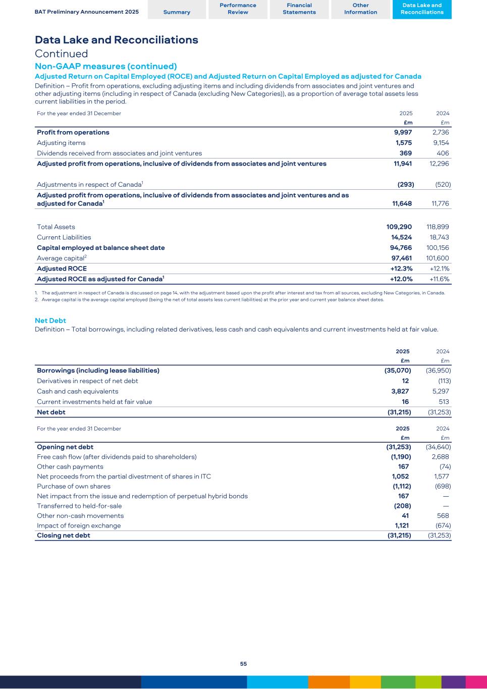 Data Lake and Reconciliations Continued Non-GAAP measures (continued) Adjusted Return on Capital Employed (ROCE) and Adjusted Return on Capital Employed as adjusted for Canada Definition – Profit from operations, excluding adjusting items and including dividends from associates and joint ventures and other adjusting items (including in respect of Canada (excluding New Categories)), as a proportion of average total assets less current liabilities in the period. For the year ended 31 December 2025 2024 £m £m Profit from operations 9,997 2,736 Adjusting items 1,575 9,154 Dividends received from associates and joint ventures 369 406 Adjusted profit from operations, inclusive of dividends from associates and joint ventures 11,941 12,296 Adjustments in respect of Canada1 (293) (520) Adjusted profit from operations, inclusive of dividends from associates and joint ventures and as adjusted for Canada1 11,648 11,776 Total Assets 109,290 118,899 Current Liabilities 14,524 18,743 Capital employed at balance sheet date 94,766 100,156 Average capital2 97,461 101,600 Adjusted ROCE +12.3% +12.1% Adjusted ROCE as adjusted for Canada1 +12.0% +11.6% 1. The adjustment in respect of Canada is discussed on page 14, with the adjustment based upon the profit after interest and tax from all sources, excluding New Categories, in Canada. 2. Average capital is the average capital employed (being the net of total assets less current liabilities) at the prior year and current year balance sheet dates. Net Debt Definition – Total borrowings, including related derivatives, less cash and cash equivalents and current investments held at fair value. 2025 2024 £m £m Borrowings (including lease liabilities) (35,070) (36,950) Derivatives in respect of net debt 12 (113) Cash and cash equivalents 3,827 5,297 Current investments held at fair value 16 513 Net debt (31,215) (31,253) For the year ended 31 December 2025 2024 £m £m Opening net debt (31,253) (34,640) Free cash flow (after dividends paid to shareholders) (1,190) 2,688 Other cash payments 167 (74) Net proceeds from the partial divestment of shares in ITC 1,052 1,577 Purchase of own shares (1,112) (698) Net impact from the issue and redemption of perpetual hybrid bonds 167 — Transferred to held-for-sale (208) — Other non-cash movements 41 568 Impact of foreign exchange 1,121 (674) Closing net debt (31,215) (31,253) BAT Preliminary Announcement 2025 Summary Performance Review Financial Statements Other Information Data Lake and Reconciliations 55