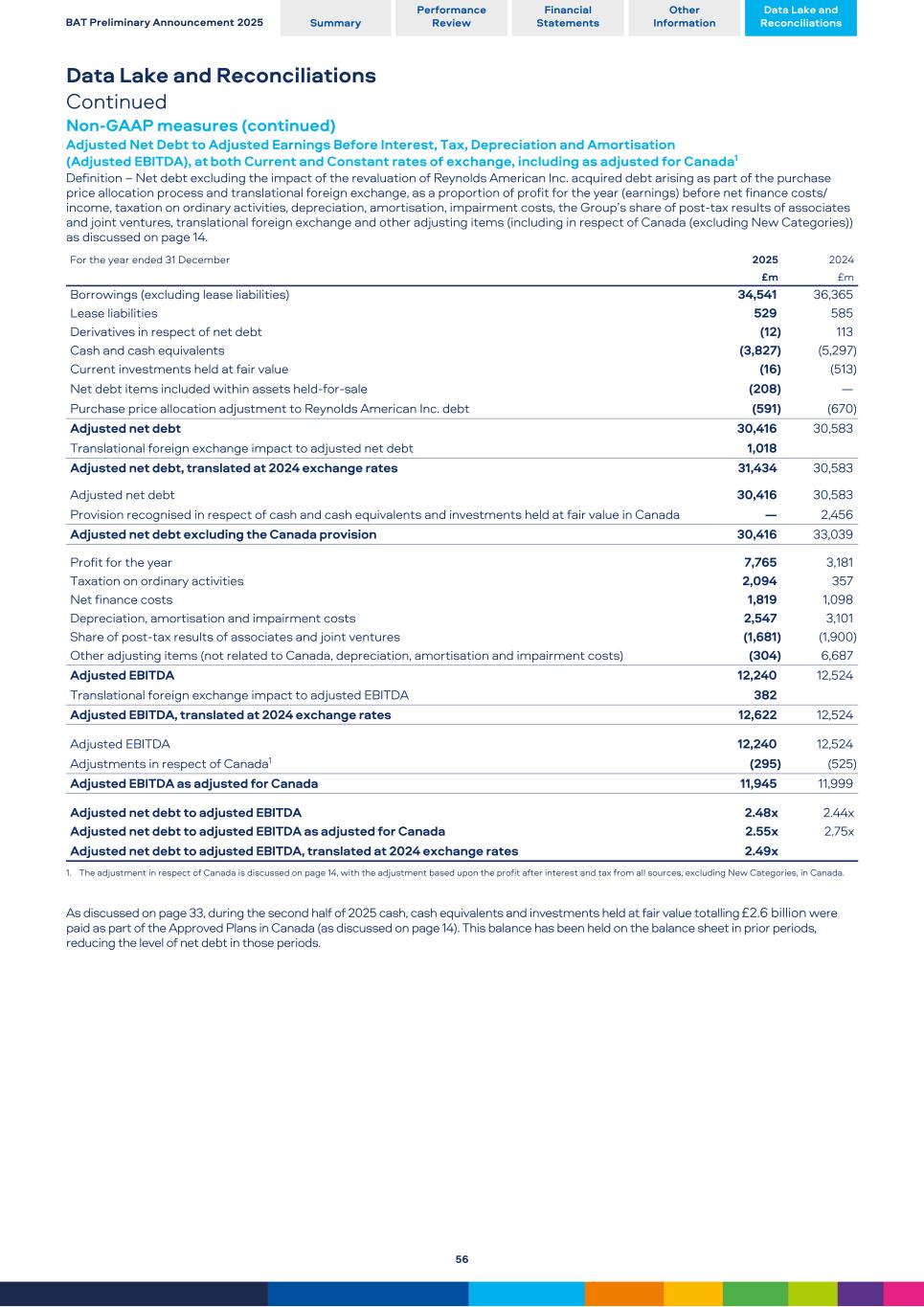 Data Lake and Reconciliations Continued Non-GAAP measures (continued) Adjusted Net Debt to Adjusted Earnings Before Interest, Tax, Depreciation and Amortisation (Adjusted EBITDA), at both Current and Constant rates of exchange, including as adjusted for Canada1 Definition – Net debt excluding the impact of the revaluation of Reynolds American Inc. acquired debt arising as part of the purchase price allocation process and translational foreign exchange, as a proportion of profit for the year (earnings) before net finance costs/ income, taxation on ordinary activities, depreciation, amortisation, impairment costs, the Group’s share of post-tax results of associates and joint ventures, translational foreign exchange and other adjusting items (including in respect of Canada (excluding New Categories)) as discussed on page 14. For the year ended 31 December 2025 2024 £m £m Borrowings (excluding lease liabilities) 34,541 36,365 Lease liabilities 529 585 Derivatives in respect of net debt (12) 113 Cash and cash equivalents (3,827) (5,297) Current investments held at fair value (16) (513) Net debt items included within assets held-for-sale (208) — Purchase price allocation adjustment to Reynolds American Inc. debt (591) (670) Adjusted net debt 30,416 30,583 Translational foreign exchange impact to adjusted net debt 1,018 Adjusted net debt, translated at 2024 exchange rates 31,434 30,583 Adjusted net debt 30,416 30,583 Provision recognised in respect of cash and cash equivalents and investments held at fair value in Canada — 2,456 Adjusted net debt excluding the Canada provision 30,416 33,039 Profit for the year 7,765 3,181 Taxation on ordinary activities 2,094 357 Net finance costs 1,819 1,098 Depreciation, amortisation and impairment costs 2,547 3,101 Share of post-tax results of associates and joint ventures (1,681) (1,900) Other adjusting items (not related to Canada, depreciation, amortisation and impairment costs) (304) 6,687 Adjusted EBITDA 12,240 12,524 Translational foreign exchange impact to adjusted EBITDA 382 Adjusted EBITDA, translated at 2024 exchange rates 12,622 12,524 Adjusted EBITDA 12,240 12,524 Adjustments in respect of Canada1 (295) (525) Adjusted EBITDA as adjusted for Canada 11,945 11,999 Adjusted net debt to adjusted EBITDA 2.48x 2.44x Adjusted net debt to adjusted EBITDA as adjusted for Canada 2.55x 2.75x Adjusted net debt to adjusted EBITDA, translated at 2024 exchange rates 2.49x 1. The adjustment in respect of Canada is discussed on page 14, with the adjustment based upon the profit after interest and tax from all sources, excluding New Categories, in Canada. As discussed on page 33, during the second half of 2025 cash, cash equivalents and investments held at fair value totalling £2.6 billion were paid as part of the Approved Plans in Canada (as discussed on page 14). This balance has been held on the balance sheet in prior periods, reducing the level of net debt in those periods. BAT Preliminary Announcement 2025 Summary Performance Review Financial Statements Other Information Data Lake and Reconciliations 56