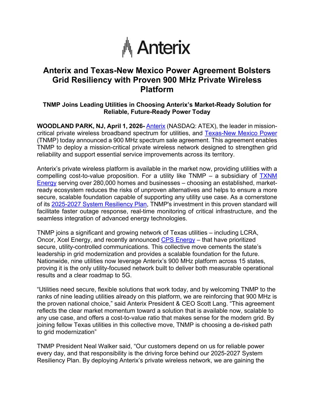 Anterix and Texas-New Mexico Power Agreement Bolsters Grid Resiliency with Proven 900 MHz Private Wireless Platform TNMP Joins Leading Utilities in Choosing Anterix’s Market-Ready Solution for Reliable, Future-Ready Power Today WOODLAND PARK, NJ, April 1, 2026- Anterix (NASDAQ: ATEX), the leader in mission- critical private wireless broadband spectrum for utilities, and Texas-New Mexico Power (TNMP) today announced a 900 MHz spectrum sale agreement. This agreement enables TNMP to deploy a mission-critical private wireless network designed to strengthen grid reliability and support essential service improvements across its territory. Anterix’s private wireless platform is available in the market now, providing utilities with a compelling cost-to-value proposition. For a utility like TNMP – a subsidiary of TXNM Energy serving over 280,000 homes and businesses – choosing an established, market- ready ecosystem reduces the risks of unproven alternatives and helps to ensure a more secure, scalable foundation capable of supporting any utility use case. As a cornerstone of its 2025-2027 System Resiliency Plan, TNMP's investment in this proven standard will facilitate faster outage response, real-time monitoring of critical infrastructure, and the seamless integration of advanced energy technologies. TNMP joins a significant and growing network of Texas utilities – including LCRA, Oncor, Xcel Energy, and recently announced CPS Energy – that have prioritized secure, utility-controlled communications. This collective move cements the state’s leadership in grid modernization and provides a scalable foundation for the future. Nationwide, nine utilities now leverage Anterix’s 900 MHz platform across 15 states, proving it is the only utility-focused network built to deliver both measurable operational results and a clear roadmap to 5G. “Utilities need secure, flexible solutions that work today, and by welcoming TNMP to the ranks of nine leading utilities already on this platform, we are reinforcing that 900 MHz is the proven national choice,” said Anterix President & CEO Scott Lang. “This agreement reflects the clear market momentum toward a solution that is available now, scalable to any use case, and offers a cost-to-value ratio that makes sense for the modern grid. By joining fellow Texas utilities in this collective move, TNMP is choosing a de-risked path to grid modernization” TNMP President Neal Walker said, “Our customers depend on us for reliable power every day, and that responsibility is the driving force behind our 2025-2027 System Resiliency Plan. By deploying Anterix’s private wireless network, we are gaining the