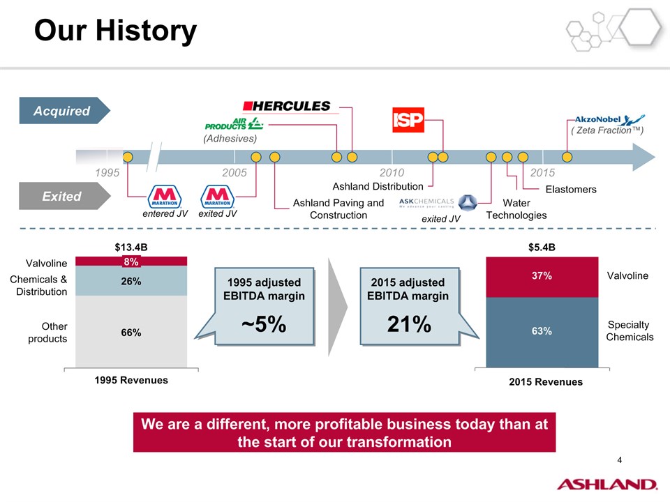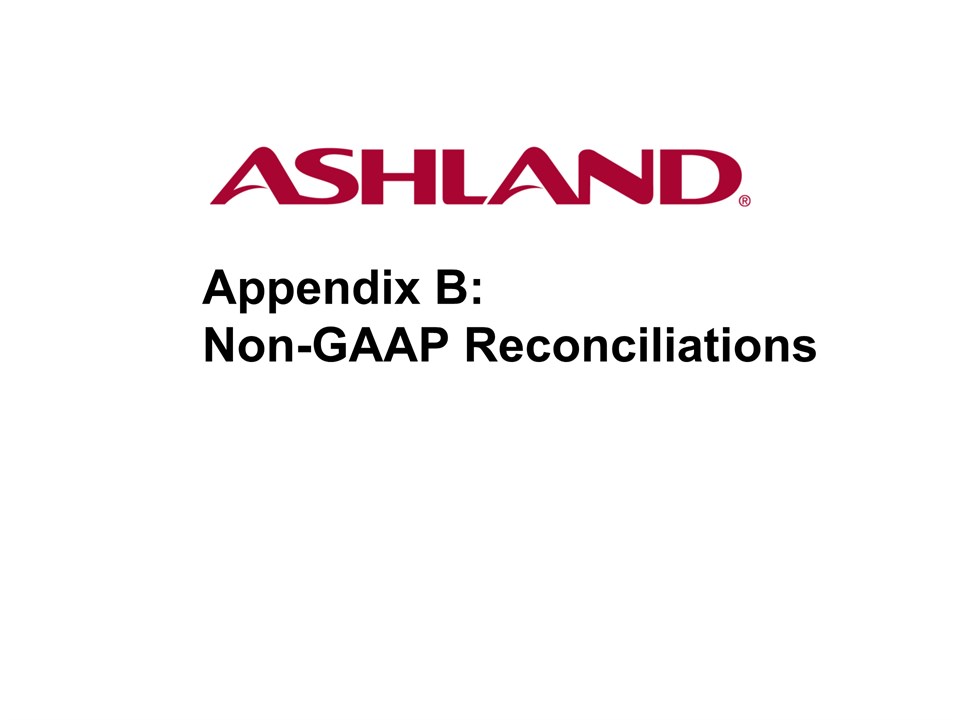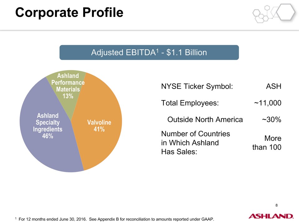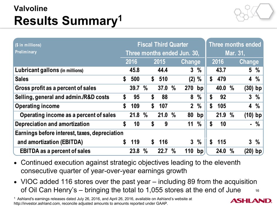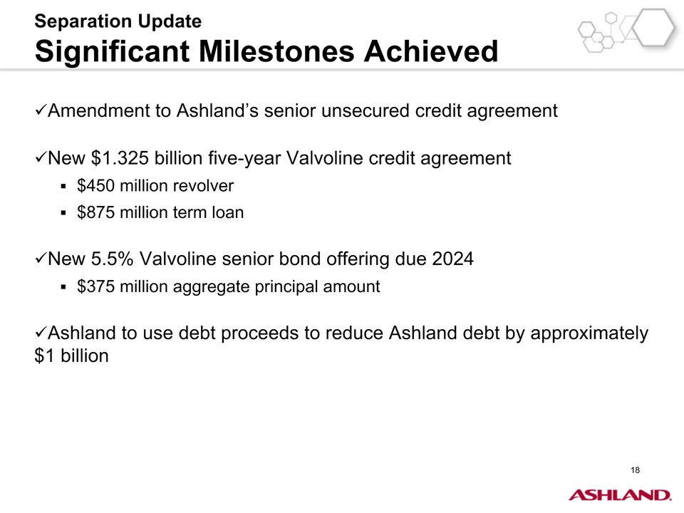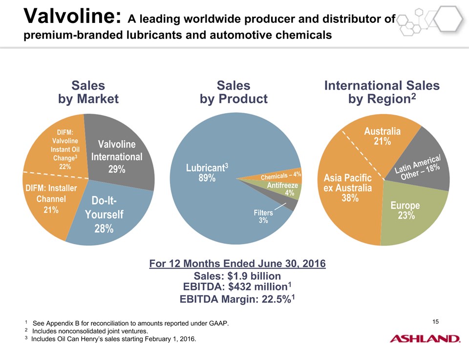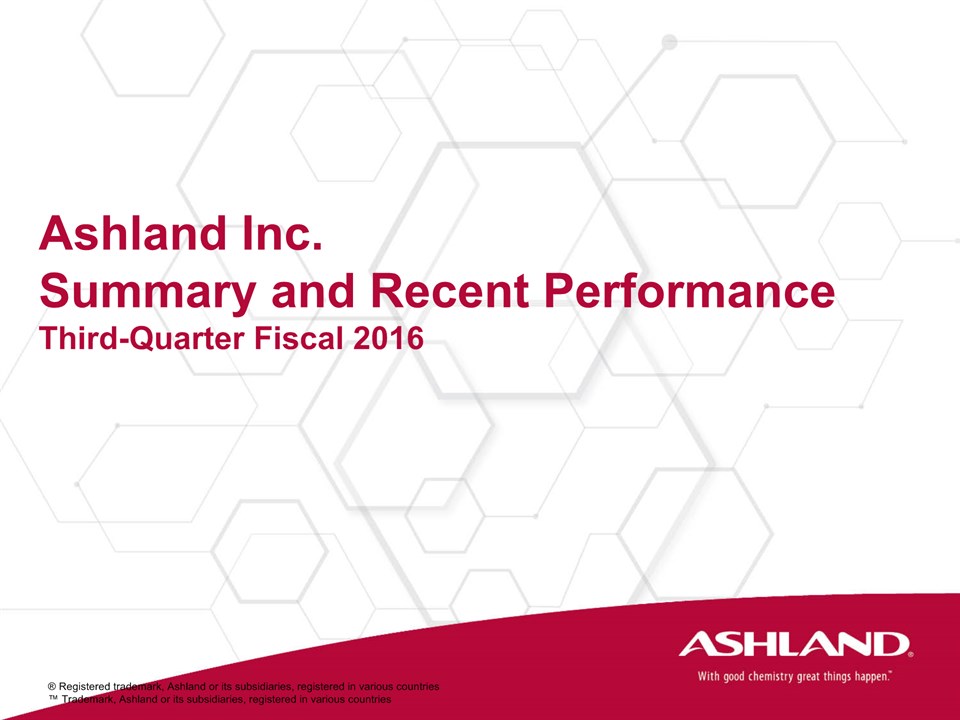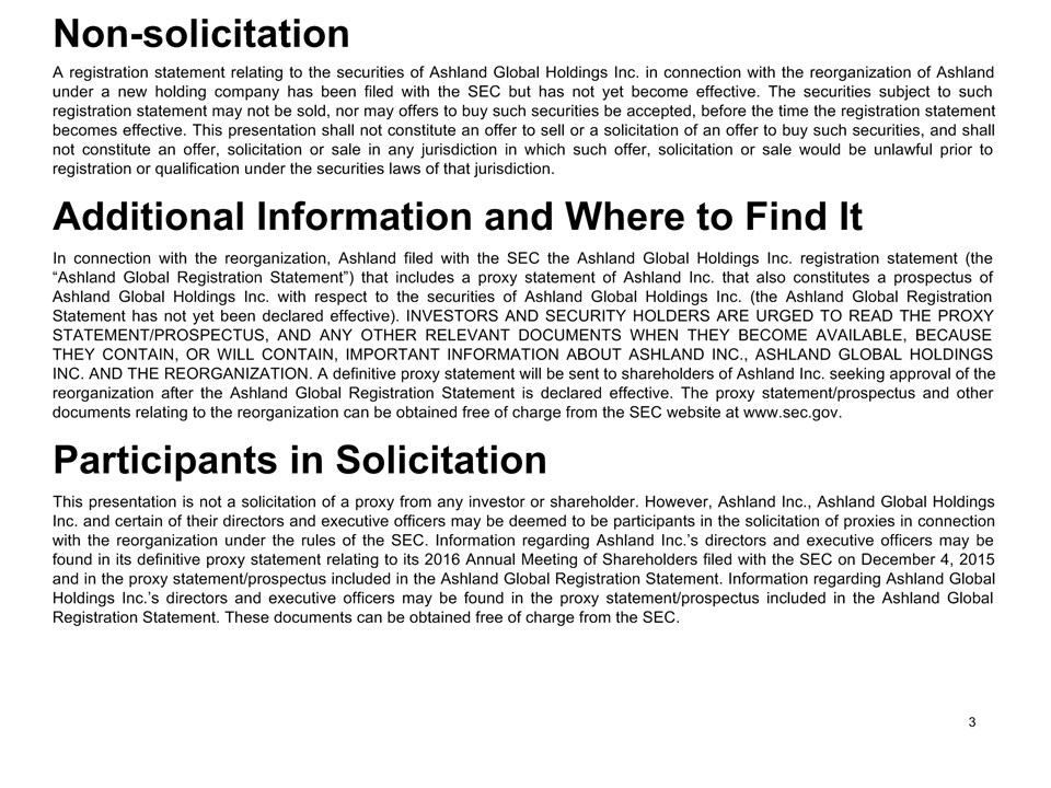 * Forward-Looking StatementsThis presentation contains forward-looking statements within the meaning of Section 27A of the Securities Act of 1933, as amended, and Section 21E of the Securities Exchange Act of 1934, as amended. Ashland has identified some of these forward-looking statements with words such as “anticipates,” “believes,” “expects,” “estimates,” “is likely,” “predicts,” “projects,” “forecasts,” “objectives,” “may,” “will,” “should,” “plans” and “intends” and the negative of these words or other comparable terminology. These forward-looking statements include statements relating to status of the separation process, the plan to pursue an IPO of up to 20 percent of the common stock of Valvoline and the expected completion of the separation through the subsequent distribution of Valvoline common stock, the anticipated timing of completion of the planned IPO and subsequent distribution of the remaining Valvoline common stock, the plan to reorganize under a new public holding company to be called Ashland Global Holdings Inc., and Ashland’s and Valvoline’s ability to pursue their long-term strategies. In addition, Ashland may from time to time make forward-looking statements in its annual report, quarterly reports and other filings with the Securities and Exchange Commission (SEC), news releases and other written and oral communications. These forward-looking statements are based on Ashland’s expectations and assumptions, as of the date such statements are made, regarding Ashland’s future operating performance and financial condition, including the proposed separation of its specialty chemicals and Valvoline businesses, the proposed IPO of its Valvoline business, the expected timetable for completing the IPO and the separation, the proposal to reorganize under a new public holding company, the future financial and operating performance of each company, strategic and competitive advantages of each company, the leadership of each company, and future opportunities for each company, as well as the economy and other future events or circumstances. Ashland’s expectations and assumptions include, without limitation, internal forecasts and analyses of current and future market conditions and trends, management plans and strategies, operating efficiencies and economic conditions (such as prices, supply and demand, cost of raw materials, and the ability to recover raw-material cost increases through price increases), and risks and uncertainties associated with the following: the possibility that the proposed IPO, new holding company reorganization or separation will not be consummated within the anticipated time period or at all, including as the result of regulatory, market or other factors or the failure to obtain shareholder approval of the new holding company reorganization; the potential for disruption to Ashland’s business in connection with the proposed IPO, new holding company reorganization or separation; the potential that the new Ashland and Valvoline do not realize all of the expected benefits of the proposed IPO, new holding company reorganization or separation or obtain the expected credit ratings following the proposed IPO, new holding company reorganization or separation; Ashland’s substantial indebtedness (including the possibility that such indebtedness and related restrictive covenants may adversely affect Ashland’s future cash flows, results of operations, financial condition and its ability to repay debt); the impact of acquisitions and/or divestitures Ashland has made or may make (including the possibility that Ashland may not realize the anticipated benefits from such transactions); severe weather, natural disasters, and legal proceedings and claims (including environmental and asbestos matters). Various risks and uncertainties may cause actual results to differ materially from those stated, projected or implied by any forward-looking statements, including, without limitation, risks and uncertainties affecting Ashland that are described in its most recent Form 10-K and its Form 10-Q for the quarterly period ended March 31, 2016 (including Item 1A Risk Factors) filed with the SEC, which is available on Ashland’s website at http://investor.ashland.com or on the SEC’s website at http://www.sec.gov. Ashland believes its expectations and assumptions are reasonable, but there can be no assurance that the expectations reflected herein will be achieved. Unless legally required, Ashland undertakes no obligation to update any forward-looking statements made in this presentation whether as a result of new information, future events or otherwise. This presentation does not constitute an offer to sell or the solicitation of an offer to buy securities, and shall not constitute an offer, solicitation or sale in any jurisdiction in which such offer, solicitation or sale would be unlawful prior to registration or qualification under the securities laws of that jurisdiction.Regulation G: Adjusted ResultsThe information presented herein regarding certain unaudited adjusted results does not conform to generally accepted accounting principles in the United States (U.S. GAAP) and should not be construed as an alternative to the reported results determined in accordance with U.S. GAAP. Ashland has included this non-GAAP information to assist in understanding the operating performance of the company and its reportable segments. The non-GAAP information provided may not be consistent with the methodologies used by other companies. All non-GAAP information related to previous Ashland filings with the SEC has been reconciled with reported U.S. GAAP results. 2