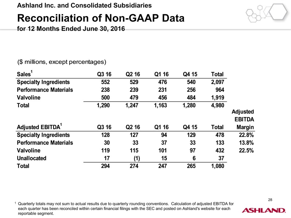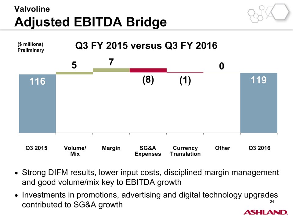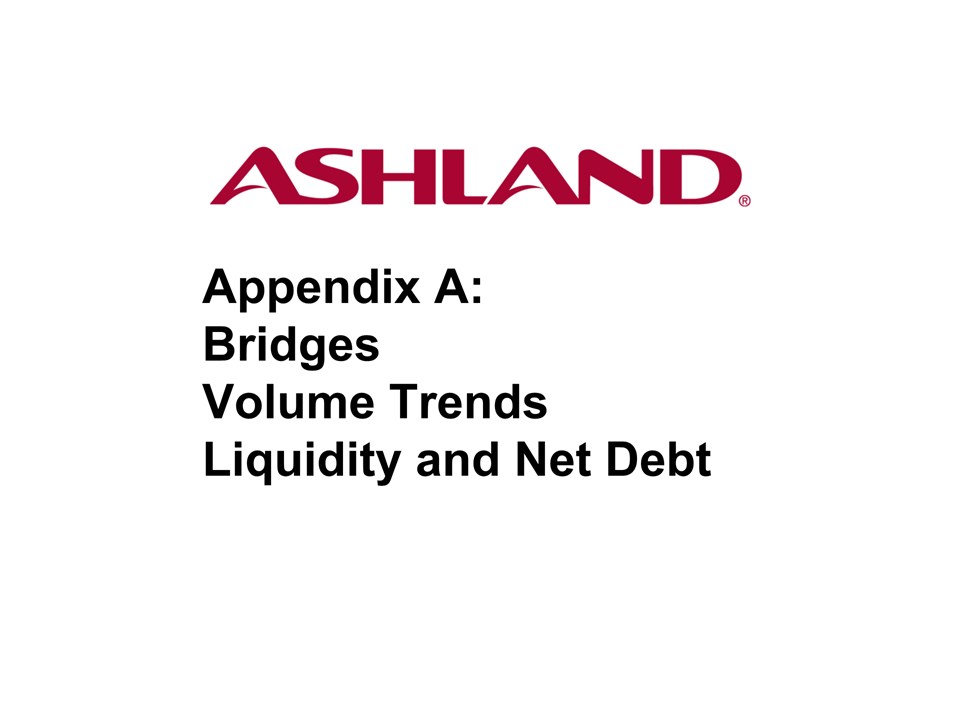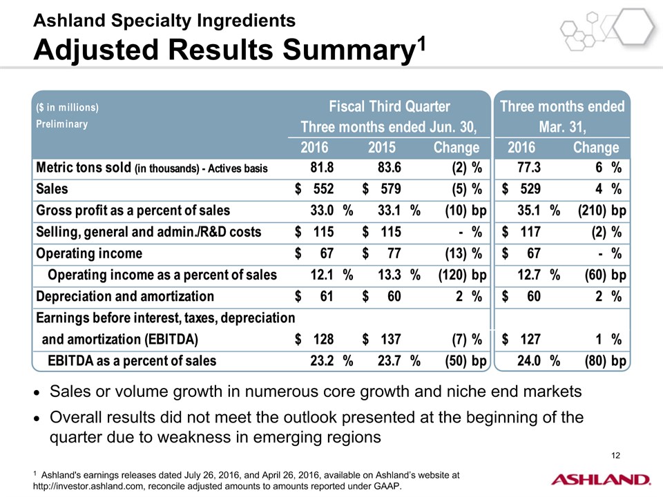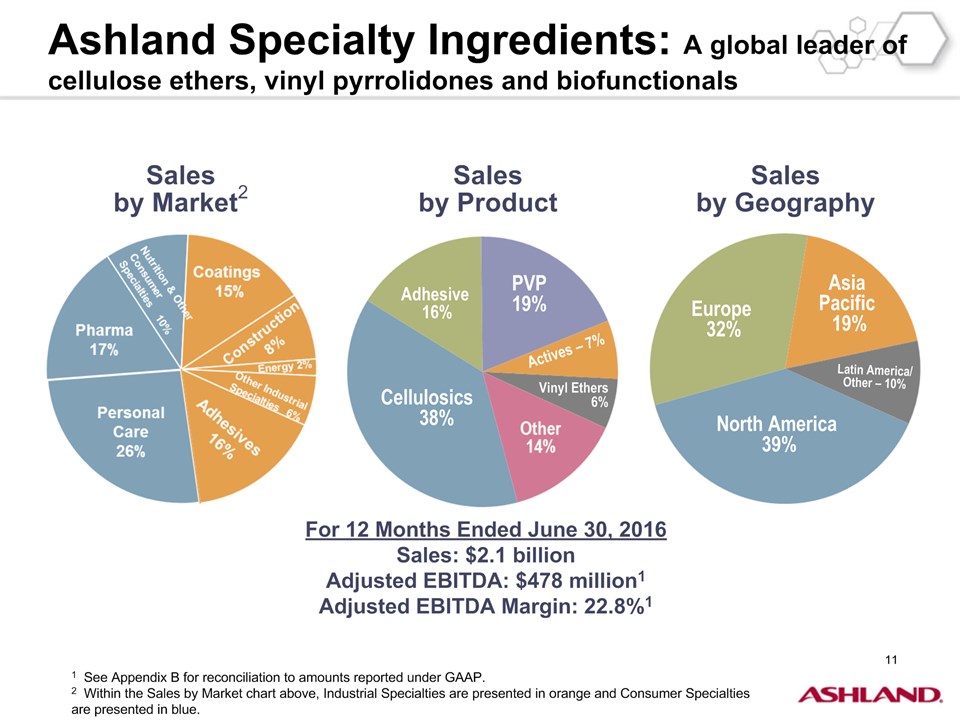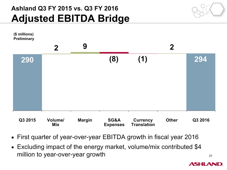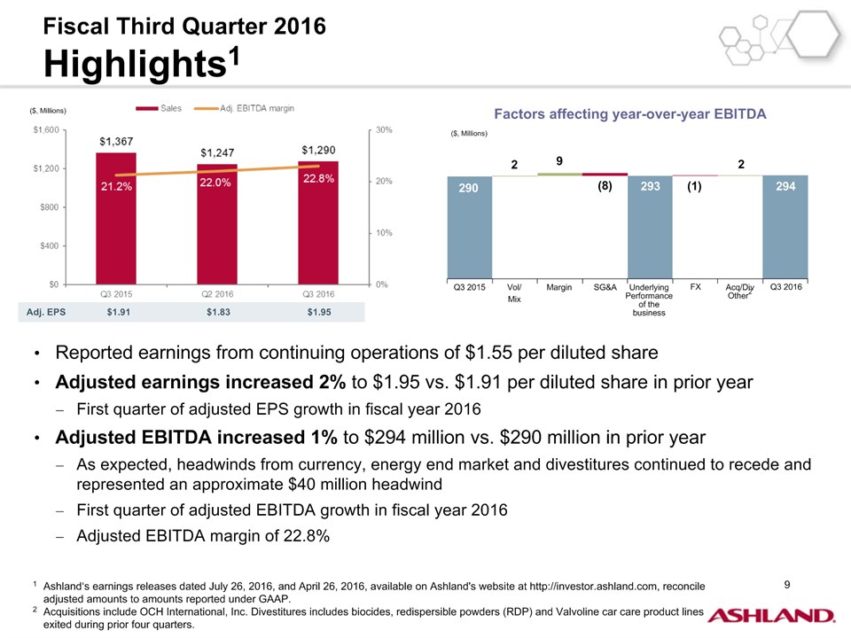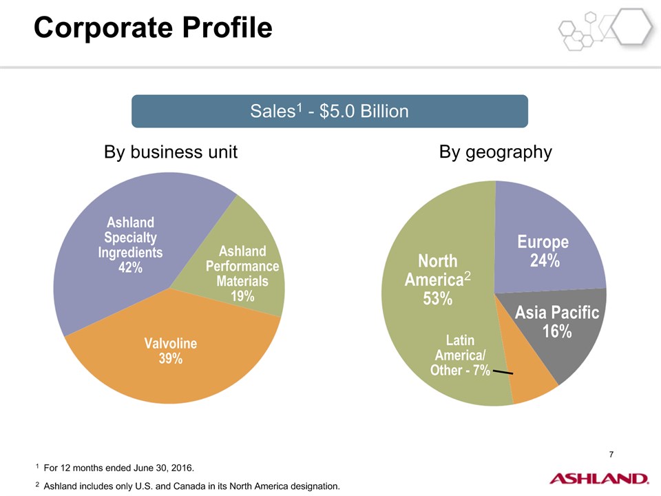 * Forward-Looking StatementsThis presentation contains forward-looking statements within the meaning of Section 27A of the Securities Act of 1933, as amended, and Section 21E of the Securities Exchange Act of 1934, as amended. Ashland has identified some of these forward-looking statements with words such as “anticipates,” “believes,” “expects,” “estimates,” “is likely,” “predicts,” “projects,” “forecasts,” “objectives,” “may,” “will,” “should,” “plans” and “intends” and the negative of these words or other comparable terminology. These forward-looking statements include statements relating to status of the separation process, the plan to pursue an IPO of up to 20 percent of the common stock of Valvoline and the expected completion of the separation through the subsequent distribution of Valvoline common stock, the anticipated timing of completion of the planned IPO and subsequent distribution of the remaining Valvoline common stock, the plan to reorganize under a new public holding company to be called Ashland Global Holdings Inc., and Ashland’s and Valvoline’s ability to pursue their long-term strategies. In addition, Ashland may from time to time make forward-looking statements in its annual report, quarterly reports and other filings with the Securities and Exchange Commission (SEC), news releases and other written and oral communications. These forward-looking statements are based on Ashland’s expectations and assumptions, as of the date such statements are made, regarding Ashland’s future operating performance and financial condition, including the proposed separation of its specialty chemicals and Valvoline businesses, the proposed IPO of its Valvoline business, the expected timetable for completing the IPO and the separation, the proposal to reorganize under a new public holding company, the future financial and operating performance of each company, strategic and competitive advantages of each company, the leadership of each company, and future opportunities for each company, as well as the economy and other future events or circumstances. Ashland’s expectations and assumptions include, without limitation, internal forecasts and analyses of current and future market conditions and trends, management plans and strategies, operating efficiencies and economic conditions (such as prices, supply and demand, cost of raw materials, and the ability to recover raw-material cost increases through price increases), and risks and uncertainties associated with the following: the possibility that the proposed IPO, new holding company reorganization or separation will not be consummated within the anticipated time period or at all, including as the result of regulatory, market or other factors or the failure to obtain shareholder approval of the new holding company reorganization; the potential for disruption to Ashland’s business in connection with the proposed IPO, new holding company reorganization or separation; the potential that the new Ashland and Valvoline do not realize all of the expected benefits of the proposed IPO, new holding company reorganization or separation or obtain the expected credit ratings following the proposed IPO, new holding company reorganization or separation; Ashland’s substantial indebtedness (including the possibility that such indebtedness and related restrictive covenants may adversely affect Ashland’s future cash flows, results of operations, financial condition and its ability to repay debt); the impact of acquisitions and/or divestitures Ashland has made or may make (including the possibility that Ashland may not realize the anticipated benefits from such transactions); severe weather, natural disasters, and legal proceedings and claims (including environmental and asbestos matters). Various risks and uncertainties may cause actual results to differ materially from those stated, projected or implied by any forward-looking statements, including, without limitation, risks and uncertainties affecting Ashland that are described in its most recent Form 10-K and its Form 10-Q for the quarterly period ended March 31, 2016 (including Item 1A Risk Factors) filed with the SEC, which is available on Ashland’s website at http://investor.ashland.com or on the SEC’s website at http://www.sec.gov. Ashland believes its expectations and assumptions are reasonable, but there can be no assurance that the expectations reflected herein will be achieved. Unless legally required, Ashland undertakes no obligation to update any forward-looking statements made in this presentation whether as a result of new information, future events or otherwise. This presentation does not constitute an offer to sell or the solicitation of an offer to buy securities, and shall not constitute an offer, solicitation or sale in any jurisdiction in which such offer, solicitation or sale would be unlawful prior to registration or qualification under the securities laws of that jurisdiction.Regulation G: Adjusted ResultsThe information presented herein regarding certain unaudited adjusted results does not conform to generally accepted accounting principles in the United States (U.S. GAAP) and should not be construed as an alternative to the reported results determined in accordance with U.S. GAAP. Ashland has included this non-GAAP information to assist in understanding the operating performance of the company and its reportable segments. The non-GAAP information provided may not be consistent with the methodologies used by other companies. All non-GAAP information related to previous Ashland filings with the SEC has been reconciled with reported U.S. GAAP results. 2