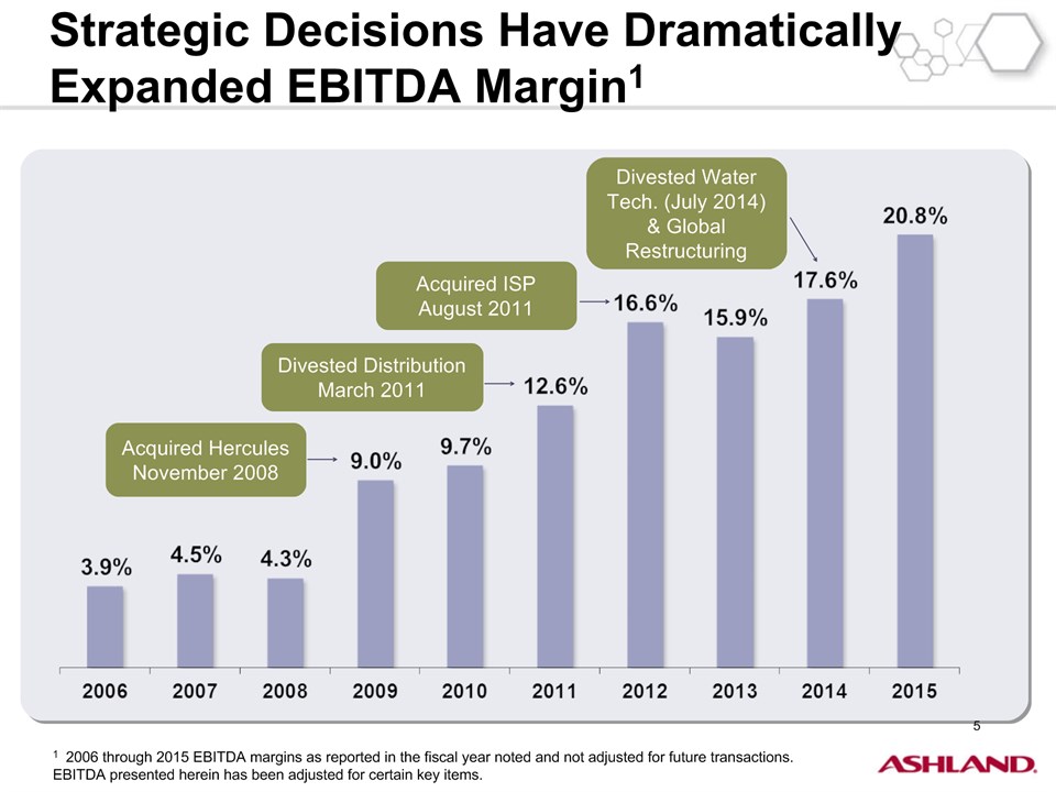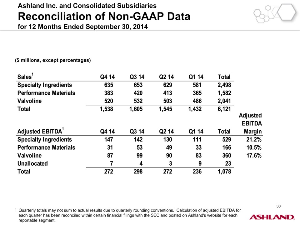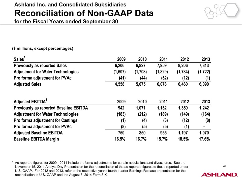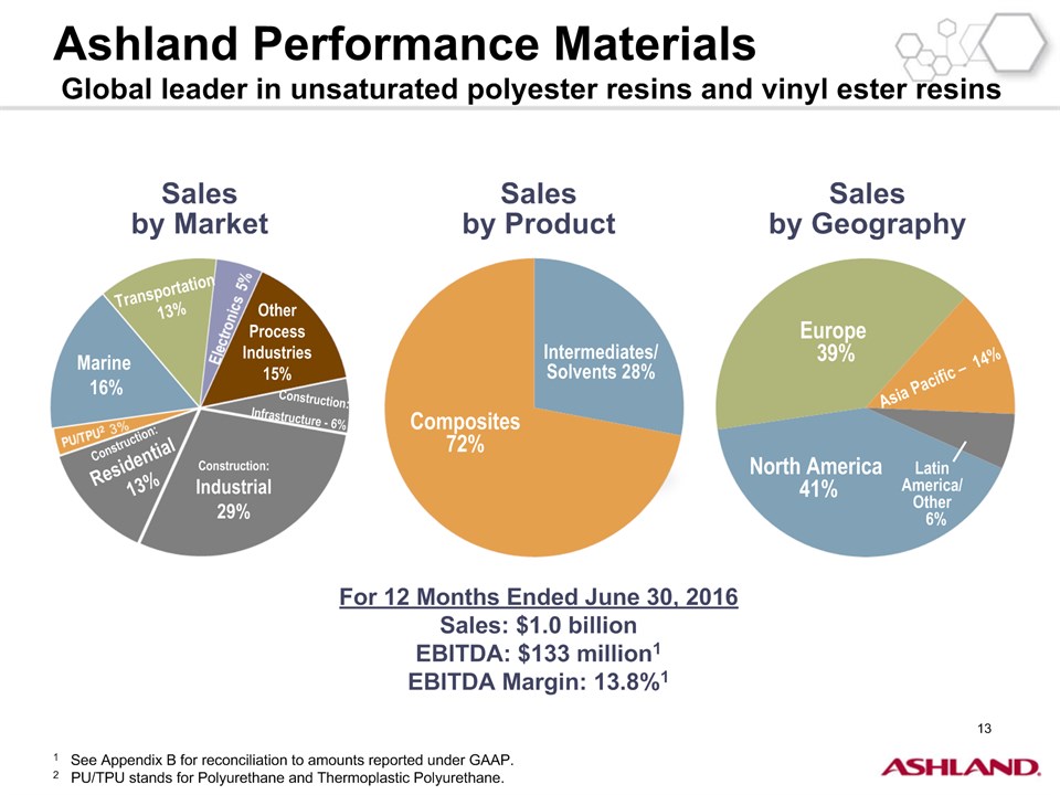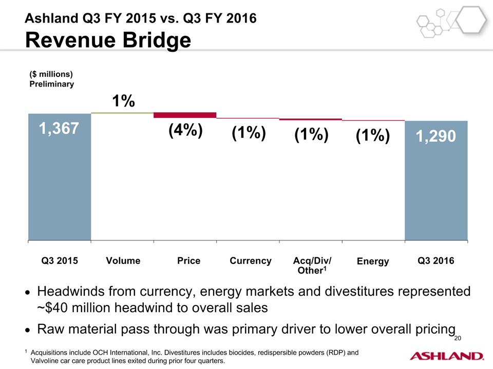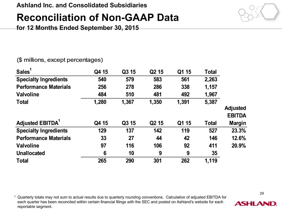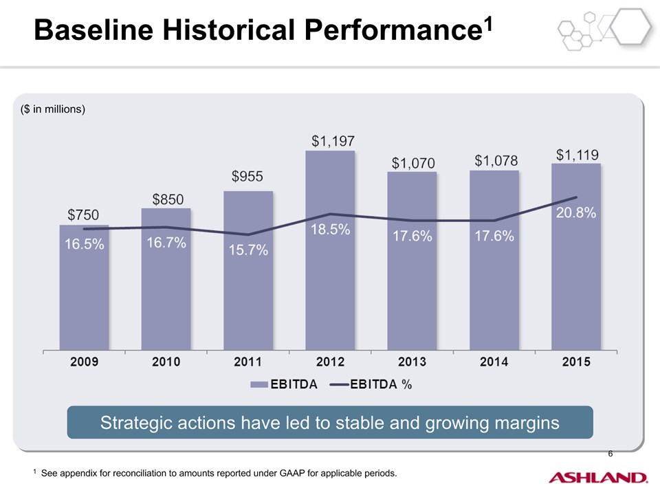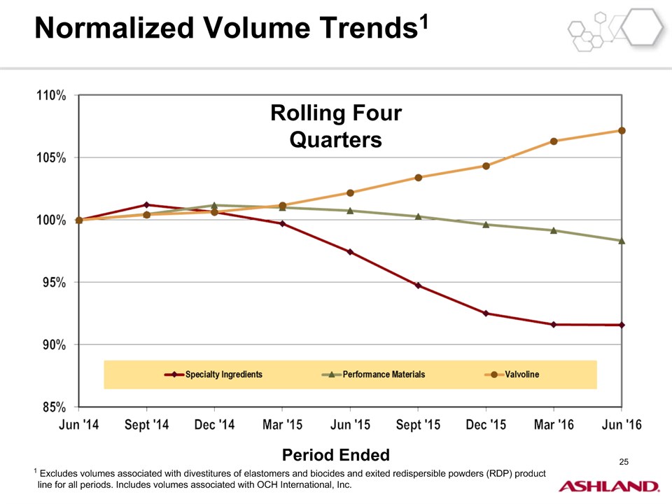 * Forward-Looking StatementsThis presentation contains forward-looking statements within the meaning of Section 27A of the Securities Act of 1933, as amended, and Section 21E of the Securities Exchange Act of 1934, as amended. Ashland has identified some of these forward-looking statements with words such as “anticipates,” “believes,” “expects,” “estimates,” “is likely,” “predicts,” “projects,” “forecasts,” “objectives,” “may,” “will,” “should,” “plans” and “intends” and the negative of these words or other comparable terminology. These forward-looking statements include statements relating to status of the separation process, the plan to pursue an IPO of up to 20 percent of the common stock of Valvoline and the expected completion of the separation through the subsequent distribution of Valvoline common stock, the anticipated timing of completion of the planned IPO and subsequent distribution of the remaining Valvoline common stock, the plan to reorganize under a new public holding company to be called Ashland Global Holdings Inc., and Ashland’s and Valvoline’s ability to pursue their long-term strategies. In addition, Ashland may from time to time make forward-looking statements in its annual report, quarterly reports and other filings with the Securities and Exchange Commission (SEC), news releases and other written and oral communications. These forward-looking statements are based on Ashland’s expectations and assumptions, as of the date such statements are made, regarding Ashland’s future operating performance and financial condition, including the proposed separation of its specialty chemicals and Valvoline businesses, the proposed IPO of its Valvoline business, the expected timetable for completing the IPO and the separation, the proposal to reorganize under a new public holding company, the future financial and operating performance of each company, strategic and competitive advantages of each company, the leadership of each company, and future opportunities for each company, as well as the economy and other future events or circumstances. Ashland’s expectations and assumptions include, without limitation, internal forecasts and analyses of current and future market conditions and trends, management plans and strategies, operating efficiencies and economic conditions (such as prices, supply and demand, cost of raw materials, and the ability to recover raw-material cost increases through price increases), and risks and uncertainties associated with the following: the possibility that the proposed IPO, new holding company reorganization or separation will not be consummated within the anticipated time period or at all, including as the result of regulatory, market or other factors or the failure to obtain shareholder approval of the new holding company reorganization; the potential for disruption to Ashland’s business in connection with the proposed IPO, new holding company reorganization or separation; the potential that the new Ashland and Valvoline do not realize all of the expected benefits of the proposed IPO, new holding company reorganization or separation or obtain the expected credit ratings following the proposed IPO, new holding company reorganization or separation; Ashland’s substantial indebtedness (including the possibility that such indebtedness and related restrictive covenants may adversely affect Ashland’s future cash flows, results of operations, financial condition and its ability to repay debt); the impact of acquisitions and/or divestitures Ashland has made or may make (including the possibility that Ashland may not realize the anticipated benefits from such transactions); severe weather, natural disasters, and legal proceedings and claims (including environmental and asbestos matters). Various risks and uncertainties may cause actual results to differ materially from those stated, projected or implied by any forward-looking statements, including, without limitation, risks and uncertainties affecting Ashland that are described in its most recent Form 10-K and its Form 10-Q for the quarterly period ended March 31, 2016 (including Item 1A Risk Factors) filed with the SEC, which is available on Ashland’s website at http://investor.ashland.com or on the SEC’s website at http://www.sec.gov. Ashland believes its expectations and assumptions are reasonable, but there can be no assurance that the expectations reflected herein will be achieved. Unless legally required, Ashland undertakes no obligation to update any forward-looking statements made in this presentation whether as a result of new information, future events or otherwise. This presentation does not constitute an offer to sell or the solicitation of an offer to buy securities, and shall not constitute an offer, solicitation or sale in any jurisdiction in which such offer, solicitation or sale would be unlawful prior to registration or qualification under the securities laws of that jurisdiction.Regulation G: Adjusted ResultsThe information presented herein regarding certain unaudited adjusted results does not conform to generally accepted accounting principles in the United States (U.S. GAAP) and should not be construed as an alternative to the reported results determined in accordance with U.S. GAAP. Ashland has included this non-GAAP information to assist in understanding the operating performance of the company and its reportable segments. The non-GAAP information provided may not be consistent with the methodologies used by other companies. All non-GAAP information related to previous Ashland filings with the SEC has been reconciled with reported U.S. GAAP results. 2