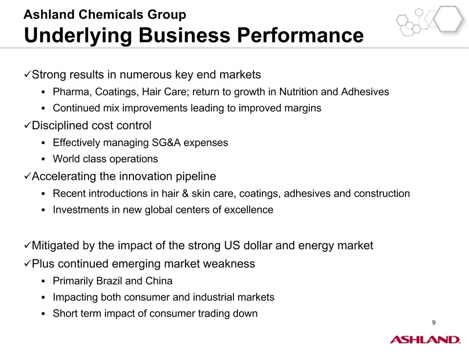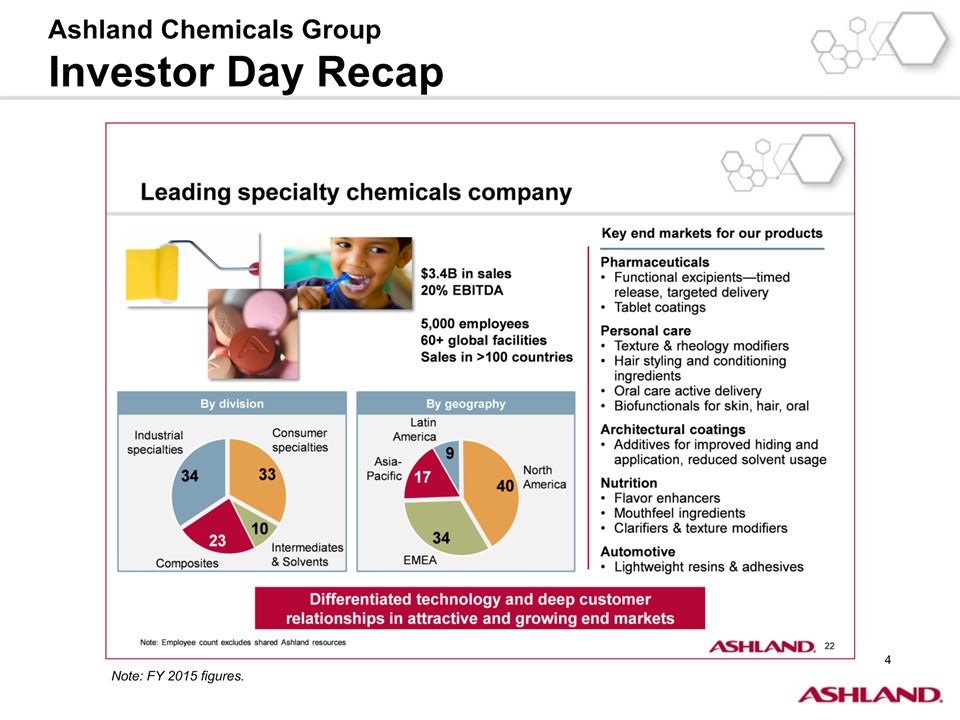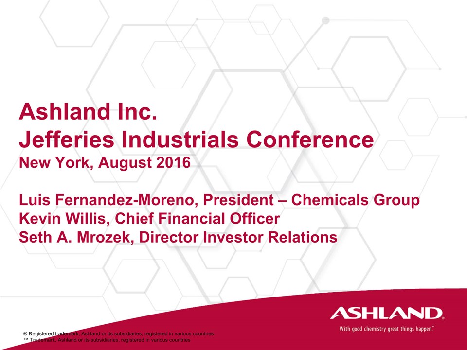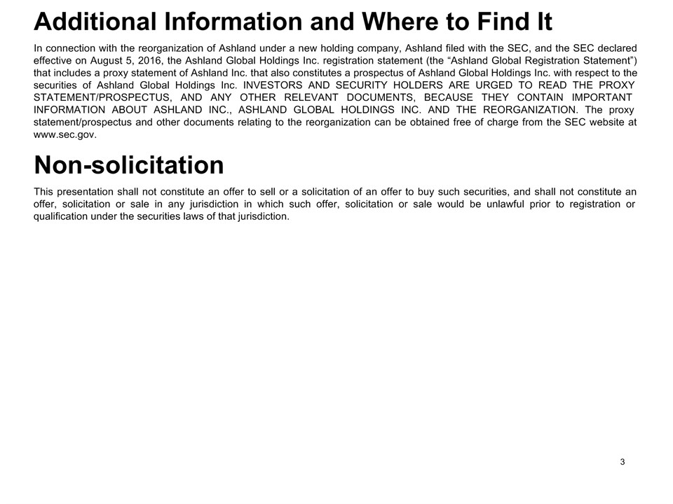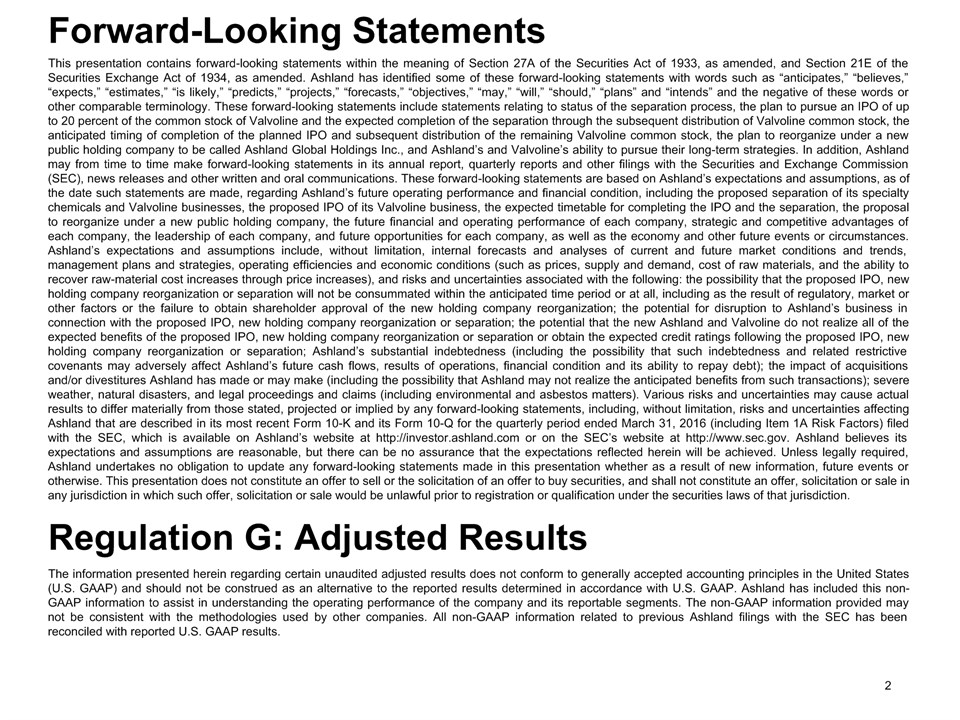 * Forward-Looking StatementsThis presentation contains forward-looking statements within the meaning of Section 27A of the Securities Act of 1933, as amended, and Section 21E of the Securities Exchange Act of 1934, as amended. Ashland has identified some of these forward-looking statements with words such as “anticipates,” “believes,” “expects,” “estimates,” “is likely,” “predicts,” “projects,” “forecasts,” “objectives,” “may,” “will,” “should,” “plans” and “intends” and the negative of these words or other comparable terminology. These forward-looking statements include statements relating to status of the separation process, the plan to pursue an IPO of up to 20 percent of the common stock of Valvoline and the expected completion of the separation through the subsequent distribution of Valvoline common stock, the anticipated timing of completion of the planned IPO and subsequent distribution of the remaining Valvoline common stock, the plan to reorganize under a new public holding company to be called Ashland Global Holdings Inc., and Ashland’s and Valvoline’s ability to pursue their long-term strategies. In addition, Ashland may from time to time make forward-looking statements in its annual report, quarterly reports and other filings with the Securities and Exchange Commission (SEC), news releases and other written and oral communications. These forward-looking statements are based on Ashland’s expectations and assumptions, as of the date such statements are made, regarding Ashland’s future operating performance and financial condition, including the proposed separation of its specialty chemicals and Valvoline businesses, the proposed IPO of its Valvoline business, the expected timetable for completing the IPO and the separation, the proposal to reorganize under a new public holding company, the future financial and operating performance of each company, strategic and competitive advantages of each company, the leadership of each company, and future opportunities for each company, as well as the economy and other future events or circumstances. Ashland’s expectations and assumptions include, without limitation, internal forecasts and analyses of current and future market conditions and trends, management plans and strategies, operating efficiencies and economic conditions (such as prices, supply and demand, cost of raw materials, and the ability to recover raw-material cost increases through price increases), and risks and uncertainties associated with the following: the possibility that the proposed IPO, new holding company reorganization or separation will not be consummated within the anticipated time period or at all, including as the result of regulatory, market or other factors or the failure to obtain shareholder approval of the new holding company reorganization; the potential for disruption to Ashland’s business in connection with the proposed IPO, new holding company reorganization or separation; the potential that the new Ashland and Valvoline do not realize all of the expected benefits of the proposed IPO, new holding company reorganization or separation or obtain the expected credit ratings following the proposed IPO, new holding company reorganization or separation; Ashland’s substantial indebtedness (including the possibility that such indebtedness and related restrictive covenants may adversely affect Ashland’s future cash flows, results of operations, financial condition and its ability to repay debt); the impact of acquisitions and/or divestitures Ashland has made or may make (including the possibility that Ashland may not realize the anticipated benefits from such transactions); severe weather, natural disasters, and legal proceedings and claims (including environmental and asbestos matters). Various risks and uncertainties may cause actual results to differ materially from those stated, projected or implied by any forward-looking statements, including, without limitation, risks and uncertainties affecting Ashland that are described in its most recent Form 10-K and its Form 10-Q for the quarterly period ended March 31, 2016 (including Item 1A Risk Factors) filed with the SEC, which is available on Ashland’s website at http://investor.ashland.com or on the SEC’s website at http://www.sec.gov. Ashland believes its expectations and assumptions are reasonable, but there can be no assurance that the expectations reflected herein will be achieved. Unless legally required, Ashland undertakes no obligation to update any forward-looking statements made in this presentation whether as a result of new information, future events or otherwise. This presentation does not constitute an offer to sell or the solicitation of an offer to buy securities, and shall not constitute an offer, solicitation or sale in any jurisdiction in which such offer, solicitation or sale would be unlawful prior to registration or qualification under the securities laws of that jurisdiction.Regulation G: Adjusted ResultsThe information presented herein regarding certain unaudited adjusted results does not conform to generally accepted accounting principles in the United States (U.S. GAAP) and should not be construed as an alternative to the reported results determined in accordance with U.S. GAAP. Ashland has included this non-GAAP information to assist in understanding the operating performance of the company and its reportable segments. The non-GAAP information provided may not be consistent with the methodologies used by other companies. All non-GAAP information related to previous Ashland filings with the SEC has been reconciled with reported U.S. GAAP results. *