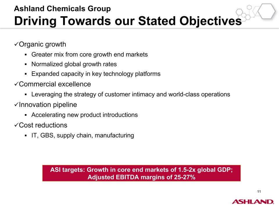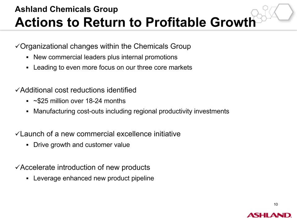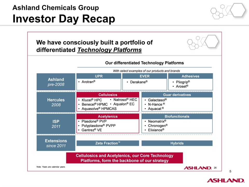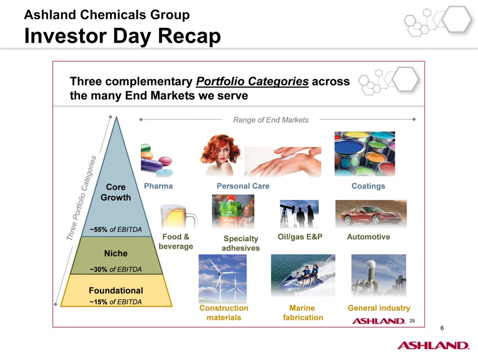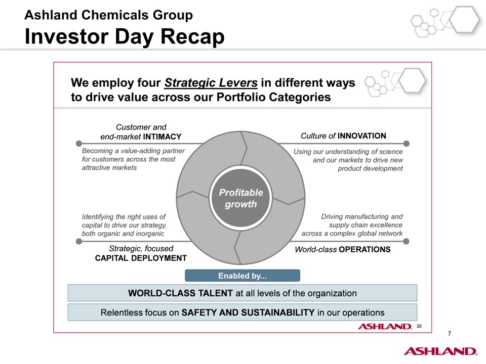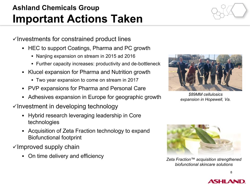 * Forward-Looking StatementsThis presentation contains forward-looking statements within the meaning of Section 27A of the Securities Act of 1933, as amended, and Section 21E of the Securities Exchange Act of 1934, as amended. Ashland has identified some of these forward-looking statements with words such as “anticipates,” “believes,” “expects,” “estimates,” “is likely,” “predicts,” “projects,” “forecasts,” “objectives,” “may,” “will,” “should,” “plans” and “intends” and the negative of these words or other comparable terminology. These forward-looking statements include statements relating to status of the separation process, the plan to pursue an IPO of up to 20 percent of the common stock of Valvoline and the expected completion of the separation through the subsequent distribution of Valvoline common stock, the anticipated timing of completion of the planned IPO and subsequent distribution of the remaining Valvoline common stock, the plan to reorganize under a new public holding company to be called Ashland Global Holdings Inc., and Ashland’s and Valvoline’s ability to pursue their long-term strategies. In addition, Ashland may from time to time make forward-looking statements in its annual report, quarterly reports and other filings with the Securities and Exchange Commission (SEC), news releases and other written and oral communications. These forward-looking statements are based on Ashland’s expectations and assumptions, as of the date such statements are made, regarding Ashland’s future operating performance and financial condition, including the proposed separation of its specialty chemicals and Valvoline businesses, the proposed IPO of its Valvoline business, the expected timetable for completing the IPO and the separation, the proposal to reorganize under a new public holding company, the future financial and operating performance of each company, strategic and competitive advantages of each company, the leadership of each company, and future opportunities for each company, as well as the economy and other future events or circumstances. Ashland’s expectations and assumptions include, without limitation, internal forecasts and analyses of current and future market conditions and trends, management plans and strategies, operating efficiencies and economic conditions (such as prices, supply and demand, cost of raw materials, and the ability to recover raw-material cost increases through price increases), and risks and uncertainties associated with the following: the possibility that the proposed IPO, new holding company reorganization or separation will not be consummated within the anticipated time period or at all, including as the result of regulatory, market or other factors or the failure to obtain shareholder approval of the new holding company reorganization; the potential for disruption to Ashland’s business in connection with the proposed IPO, new holding company reorganization or separation; the potential that the new Ashland and Valvoline do not realize all of the expected benefits of the proposed IPO, new holding company reorganization or separation or obtain the expected credit ratings following the proposed IPO, new holding company reorganization or separation; Ashland’s substantial indebtedness (including the possibility that such indebtedness and related restrictive covenants may adversely affect Ashland’s future cash flows, results of operations, financial condition and its ability to repay debt); the impact of acquisitions and/or divestitures Ashland has made or may make (including the possibility that Ashland may not realize the anticipated benefits from such transactions); severe weather, natural disasters, and legal proceedings and claims (including environmental and asbestos matters). Various risks and uncertainties may cause actual results to differ materially from those stated, projected or implied by any forward-looking statements, including, without limitation, risks and uncertainties affecting Ashland that are described in its most recent Form 10-K and its Form 10-Q for the quarterly period ended March 31, 2016 (including Item 1A Risk Factors) filed with the SEC, which is available on Ashland’s website at http://investor.ashland.com or on the SEC’s website at http://www.sec.gov. Ashland believes its expectations and assumptions are reasonable, but there can be no assurance that the expectations reflected herein will be achieved. Unless legally required, Ashland undertakes no obligation to update any forward-looking statements made in this presentation whether as a result of new information, future events or otherwise. This presentation does not constitute an offer to sell or the solicitation of an offer to buy securities, and shall not constitute an offer, solicitation or sale in any jurisdiction in which such offer, solicitation or sale would be unlawful prior to registration or qualification under the securities laws of that jurisdiction.Regulation G: Adjusted ResultsThe information presented herein regarding certain unaudited adjusted results does not conform to generally accepted accounting principles in the United States (U.S. GAAP) and should not be construed as an alternative to the reported results determined in accordance with U.S. GAAP. Ashland has included this non-GAAP information to assist in understanding the operating performance of the company and its reportable segments. The non-GAAP information provided may not be consistent with the methodologies used by other companies. All non-GAAP information related to previous Ashland filings with the SEC has been reconciled with reported U.S. GAAP results. *
