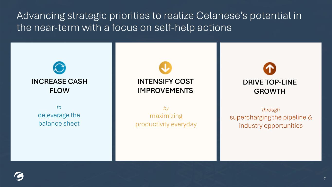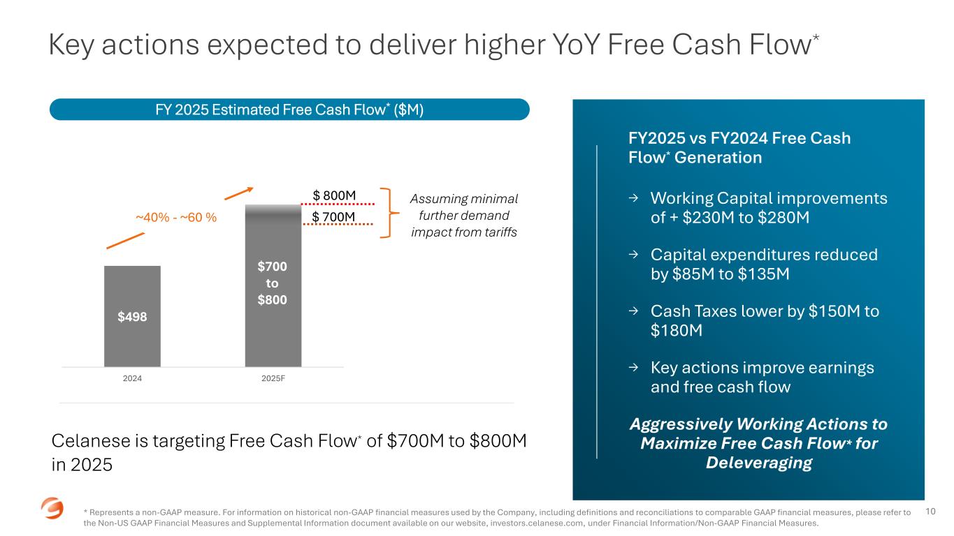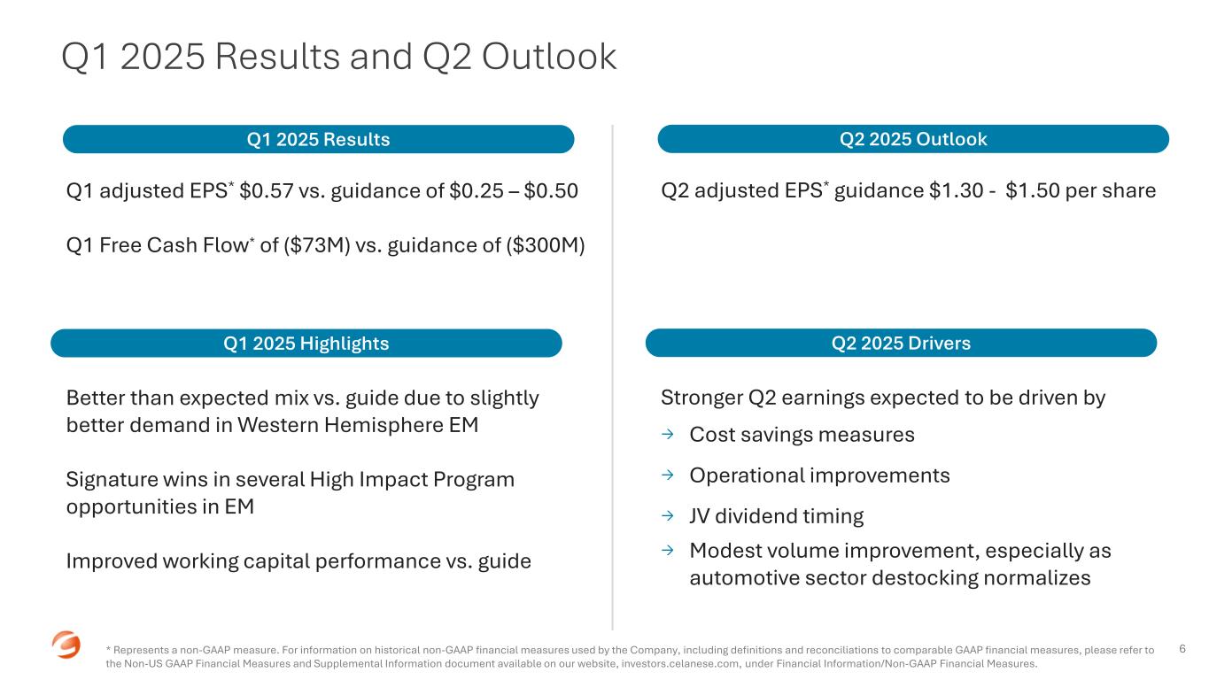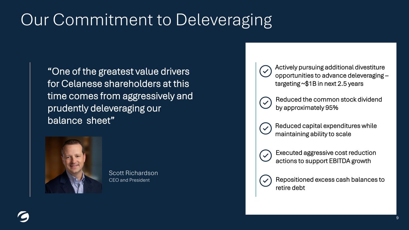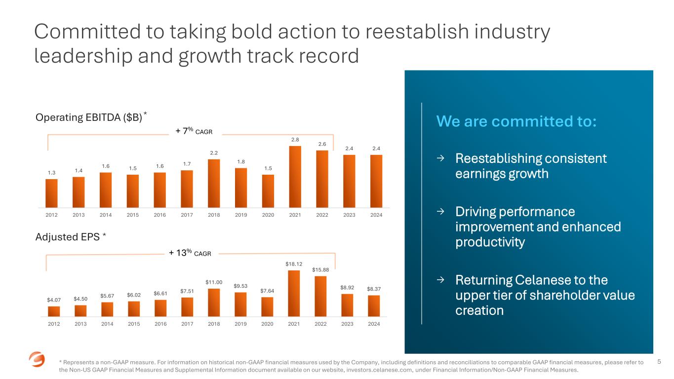 Celanese Corporation Disclosures Forward-Looking Statements This presentation may contain "forward-looking statements," which include information concerning Celanese Corporation’s (the “Company”) plans objectives, goals, strategies, future revenues, cash flow, financial performance, synergies, capital expenditures, deleveraging efforts, planned cost reductions, dividend policy, financing needs and other information that is not historical information. All forward-looking statements are based upon current expectations and beliefs and various assumptions. There can be no assurance that the Company will realize these expectations or that these beliefs will prove correct. There are a number of risks and uncertainties that could cause actual results to differ materially from the results expressed or implied in the forward-looking statements contained in this release. These risks and uncertainties include, among other things: the ability to successfully achieve planned cost reductions; changes in general economic, business, political and regulatory conditions in the countries or regions in which we operate; the length and depth of product and industry business cycles, particularly in the automotive, electrical, textiles, electronics and construction industries; volatility or changes in the price and availability of raw materials and energy, particularly changes in the demand for, supply of, and market prices of ethylene, methanol, natural gas, carbon monoxide, wood pulp, hexamethylene diamine, Polyamide 66 ("PA66"), polybutylene terephthalate, ethanol, natural gas and fuel oil, and the prices for electricity and other energy sources; the ability to pass increases in raw materials prices, logistics costs and other costs on to customers or otherwise improve margins through price increases; the possibility that we will not be able to realize the anticipated benefits of the Mobility & Materials business (the "M&M Business") we acquired from DuPont de Nemours, Inc. (the "M&M Acquisition"), including synergies and growth opportunities, whether as a result of difficulties arising from the operation of the M&M Business or other unanticipated delays, costs, inefficiencies or liabilities; additional impairments of goodwill or intangible assets; increased commercial, legal or regulatory complexity of entering into, or expanding our exposure to, certain end markets and geographies; risks in the global economy and equity and credit markets and their potential impact on our ability to pay down debt in the future and/or refinance at suitable rates, in a timely manner, or at all; risks and costs associated with increased leverage from the M&M Acquisition, including increased interest expense and potential reduction of business and strategic flexibility; the ability to maintain plant utilization rates and to implement planned capacity additions, expansions and maintenance; the ability to reduce or maintain current levels of production costs and to improve productivity by implementing technological improvements to existing plants; increased price competition and the introduction of competing products by other companies; the ability to identify desirable potential acquisition or divestiture opportunities and to complete such transactions, including obtaining regulatory approvals, consistent with the Company's strategy; market acceptance of our products and technology; compliance and other costs and potential disruption or interruption of production or operations due to accidents, interruptions in sources of raw materials, transportation, logistics or supply chain disruptions, cybersecurity incidents, terrorism or political unrest, public health crises, or other unforeseen events or delays in construction or operation of facilities, including as a result of geopolitical conditions, the direct or indirect consequences of acts of war or conflict (such as the Russia-Ukraine conflict or conflicts in the Middle East) or terrorist incidents or as a result of weather, natural disasters, or other crises; the ability to obtain governmental approvals and to construct facilities on terms and schedules acceptable to the Company; changes in applicable tariffs, duties and trade agreements, tax rates or legislation throughout the world including, but not limited to, anti-dumping and countervailing duties, adjustments, changes in estimates or interpretations or the resolution of tax examinations or audits that may impact recorded or future tax impacts and potential regulatory and legislative tax developments in the United States and other jurisdictions; changes in the degree of intellectual property and other legal protection afforded to our products or technologies, or the theft of such intellectual property; potential liability for remedial actions and increased costs under existing or future environmental, health and safety regulations, including those relating to climate change or other sustainability matters; potential liability resulting from pending or future claims or litigation, including investigations or enforcement actions, or from changes in the laws, regulations or policies of governments or other governmental activities, in the countries in which we operate; our level of indebtedness, which could diminish our ability to raise additional capital to fund operations or limit our ability to react to changes in the economy or the chemicals industry, and the success of our deleveraging efforts, as well as any changes to our credit ratings; changes in currency exchange rates and interest rates; tax rates and changes thereto; and various other factors discussed from time to time in the Company's filings with the Securities and Exchange Commission. Any forward-looking statement speaks only as of the date on which it is made, and the Company undertakes no obligation to update any forward-looking statements to reflect events or circumstances after the date on which it is made or to reflect the occurrence of anticipated 