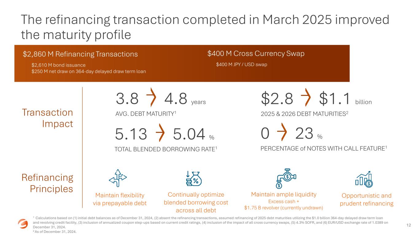 The refinancing transaction completed in March 2025 improved the maturity profile $2,860 M Refinancing Transactions $2,610 M bond issuance $250 M net draw on 364-day delayed draw term loan 3.8 ⟩ 4.8 years AVG. DEBT MATURITY1 Transaction Impact $400 M Cross Currency Swap $400 M JPY / USD swap 5.13 ⟩ 5.04 % TOTAL BLENDED BORROWING RATE1 $2.8 ⟩ $1.1 billion 2025 & 2026 DEBT MATURITIES2 0 ⟩ 23 % PERCENTAGE of NOTES WITH CALL FEATURE1 Maintain flexibility via prepayable debt 1 Calculations based on (1) initial debt balances as of December 31, 2024, (2) absent the refinancing transactions, assumed refinancing of 2025 debt maturities utilizing the $1.0 billion 364-day delayed draw term loan and revolving credit facility, (3) inclusion of annualized coupon step-ups based on current credit ratings, (4) inclusion of the impact of all cross currency swaps, (5) 4.3% SOFR, and (6) EUR/USD exchange rate of 1.0389 on December 31, 2024. 2 As of December 31, 2024. Continually optimize blended borrowing cost across all debt Maintain ample liquidity Excess cash + $1.75 B revolver (currently undrawn) Opportunistic and prudent refinancing Refinancing Principles 12