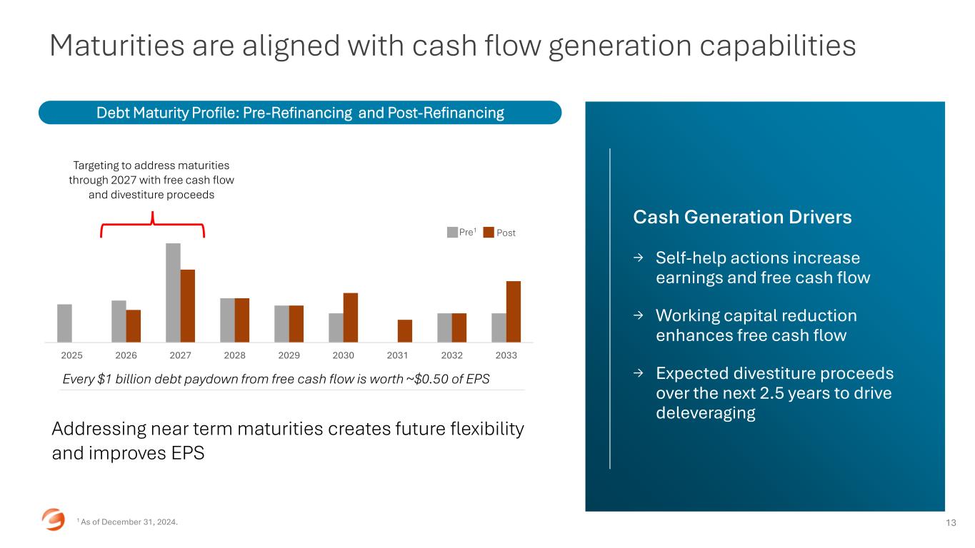 Maturities are aligned with cash flow generation capabilities Debt Maturity Profile: Pre-Refinancing and Post-Refinancing 13 Addressing near term maturities creates future flexibility and improves EPS 2025 2026 2027 2028 2029 2030 2031 2032 2033 Pre1 Post Targeting to address maturities through 2027 with free cash flow and divestiture proceeds Every $1 billion debt paydown from free cash flow is worth ~$0.50 of EPS Cash Generation Drivers → Self-help actions increase earnings and free cash flow → Working capital reduction enhances free cash flow → Expected divestiture proceeds over the next 2.5 years to drive deleveraging 1 As of December 31, 2024.