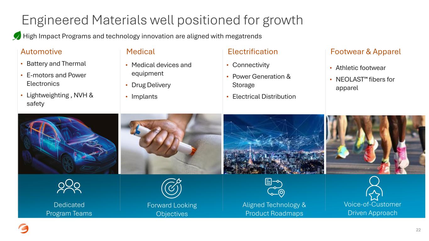 Engineered Materials well positioned for growth 22 Dedicated Program Teams Forward Looking Objectives Aligned Technology & Product Roadmaps Voice-of-Customer Driven Approach High Impact Programs and technology innovation are aligned with megatrends • Battery and Thermal • E-motors and Power Electronics • Lightweighting , NVH & safety • Medical devices and equipment • Drug Delivery • Implants • Connectivity • Power Generation & Storage • Electrical Distribution • Athletic footwear • NEOLAST fibers for apparel Automotive Medical Electrification Footwear & Apparel