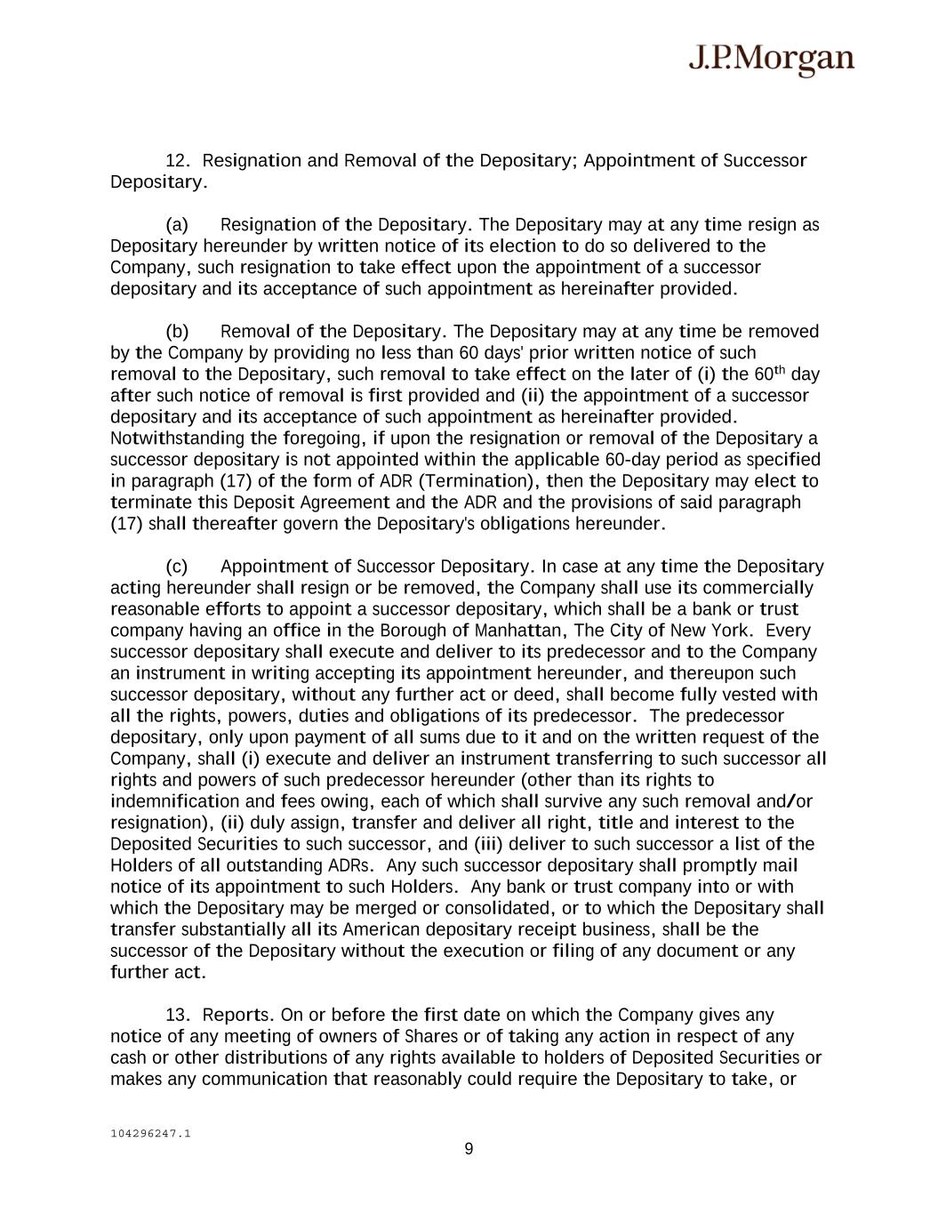 104296247.1 9 12. Resignation and Removal of the Depositary; Appointment of Successor Depositary. (a) Resignation of the Depositary. The Depositary may at any time resign as Depositary hereunder by written notice of its election to do so delivered to the Company, such resignation to take effect upon the appointment of a successor depositary and its acceptance of such appointment as hereinafter provided. (b) Removal of the Depositary. The Depositary may at any time be removed by the Company by providing no less than 60 days' prior written notice of such removal to the Depositary, such removal to take effect on the later of (i) the 60th day after such notice of removal is first provided and (ii) the appointment of a successor depositary and its acceptance of such appointment as hereinafter provided. Notwithstanding the foregoing, if upon the resignation or removal of the Depositary a successor depositary is not appointed within the applicable 60-day period as specified in paragraph (17) of the form of ADR (Termination), then the Depositary may elect to terminate this Deposit Agreement and the ADR and the provisions of said paragraph (17) shall thereafter govern the Depositary's obligations hereunder. (c) Appointment of Successor Depositary. In case at any time the Depositary acting hereunder shall resign or be removed, the Company shall use its commercially reasonable efforts to appoint a successor depositary, which shall be a bank or trust company having an office in the Borough of Manhattan, The City of New York. Every successor depositary shall execute and deliver to its predecessor and to the Company an instrument in writing accepting its appointment hereunder, and thereupon such successor depositary, without any further act or deed, shall become fully vested with all the rights, powers, duties and obligations of its predecessor. The predecessor depositary, only upon payment of all sums due to it and on the written request of the Company, shall (i) execute and deliver an instrument transferring to such successor all rights and powers of such predecessor hereunder (other than its rights to indemnification and fees owing, each of which shall survive any such removal and/or resignation), (ii) duly assign, transfer and deliver all right, title and interest to the Deposited Securities to such successor, and (iii) deliver to such successor a list of the Holders of all outstanding ADRs. Any such successor depositary shall promptly mail notice of its appointment to such Holders. Any bank or trust company into or with which the Depositary may be merged or consolidated, or to which the Depositary shall transfer substantially all its American depositary receipt business, shall be the successor of the Depositary without the execution or filing of any document or any further act. 13. Reports. On or before the first date on which the Company gives any notice of any meeting of owners of Shares or of taking any action in respect of any cash or other distributions of any rights available to holders of Deposited Securities or makes any communication that reasonably could require the Depositary to take, or