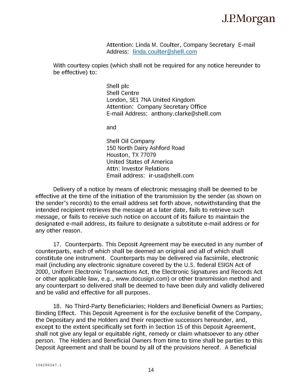 104296247.1 14 Attention: Linda M. Coulter, Company Secretary E-mail Address: linda.coulter@shell.com With courtesy copies (which shall not be required for any notice hereunder to be effective) to: Shell plc Shell Centre London, SE1 7NA United Kingdom Attention: Company Secretary Office E-mail Address: anthony.clarke@shell.com and Shell Oil Company 150 North Dairy Ashford Road Houston, TX 77079 United States of America Attn: Investor Relations Email address: ir-usa@shell.com Delivery of a notice by means of electronic messaging shall be deemed to be effective at the time of the initiation of the transmission by the sender (as shown on the sender’s records) to the email address set forth above, notwithstanding that the intended recipient retrieves the message at a later date, fails to retrieve such message, or fails to receive such notice on account of its failure to maintain the designated e-mail address, its failure to designate a substitute e-mail address or for any other reason. 17. Counterparts. This Deposit Agreement may be executed in any number of counterparts, each of which shall be deemed an original and all of which shall constitute one instrument. Counterparts may be delivered via facsimile, electronic mail (including any electronic signature covered by the U.S. federal ESIGN Act of 2000, Uniform Electronic Transactions Act, the Electronic Signatures and Records Act or other applicable law, e.g., www.docusign.com) or other transmission method and any counterpart so delivered shall be deemed to have been duly and validly delivered and be valid and effective for all purposes. 18. No Third-Party Beneficiaries; Holders and Beneficial Owners as Parties; Binding Effect. This Deposit Agreement is for the exclusive benefit of the Company, the Depositary and the Holders and their respective successors hereunder, and, except to the extent specifically set forth in Section 15 of this Deposit Agreement, shall not give any legal or equitable right, remedy or claim whatsoever to any other person. The Holders and Beneficial Owners from time to time shall be parties to this Deposit Agreement and shall be bound by all of the provisions hereof. A Beneficial