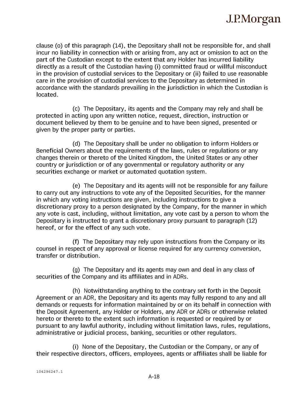 104296247.1 A-18 clause (o) of this paragraph (14), the Depositary shall not be responsible for, and shall incur no liability in connection with or arising from, any act or omission to act on the part of the Custodian except to the extent that any Holder has incurred liability directly as a result of the Custodian having (i) committed fraud or willful misconduct in the provision of custodial services to the Depositary or (ii) failed to use reasonable care in the provision of custodial services to the Depositary as determined in accordance with the standards prevailing in the jurisdiction in which the Custodian is located. (c) The Depositary, its agents and the Company may rely and shall be protected in acting upon any written notice, request, direction, instruction or document believed by them to be genuine and to have been signed, presented or given by the proper party or parties. (d) The Depositary shall be under no obligation to inform Holders or Beneficial Owners about the requirements of the laws, rules or regulations or any changes therein or thereto of the United Kingdom, the United States or any other country or jurisdiction or of any governmental or regulatory authority or any securities exchange or market or automated quotation system. (e) The Depositary and its agents will not be responsible for any failure to carry out any instructions to vote any of the Deposited Securities, for the manner in which any voting instructions are given, including instructions to give a discretionary proxy to a person designated by the Company, for the manner in which any vote is cast, including, without limitation, any vote cast by a person to whom the Depositary is instructed to grant a discretionary proxy pursuant to paragraph (12) hereof, or for the effect of any such vote. (f) The Depositary may rely upon instructions from the Company or its counsel in respect of any approval or license required for any currency conversion, transfer or distribution. (g) The Depositary and its agents may own and deal in any class of securities of the Company and its affiliates and in ADRs. (h) Notwithstanding anything to the contrary set forth in the Deposit Agreement or an ADR, the Depositary and its agents may fully respond to any and all demands or requests for information maintained by or on its behalf in connection with the Deposit Agreement, any Holder or Holders, any ADR or ADRs or otherwise related hereto or thereto to the extent such information is requested or required by or pursuant to any lawful authority, including without limitation laws, rules, regulations, administrative or judicial process, banking, securities or other regulators. (i) None of the Depositary, the Custodian or the Company, or any of their respective directors, officers, employees, agents or affiliates shall be liable for
