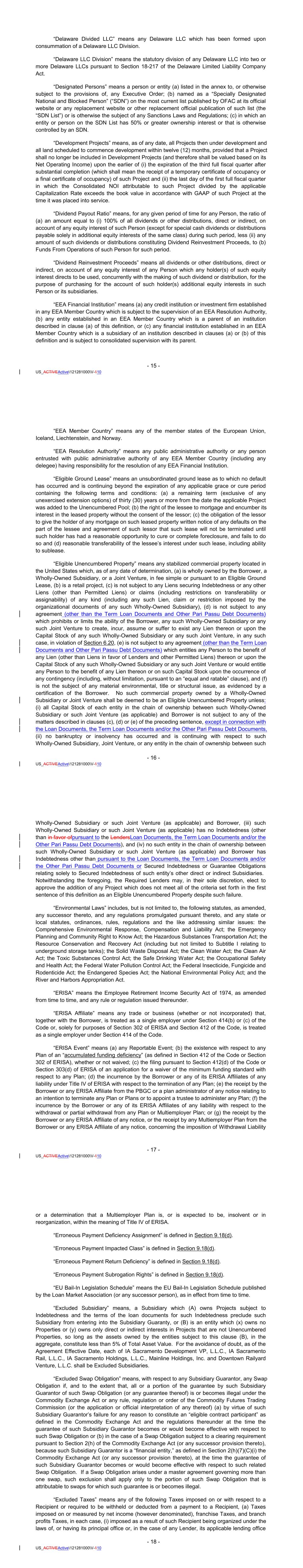 “Delaware Divided LLC” means any Delaware LLC which has been formed upon consummation of a Delaware LLC Division. “Delaware LLC Division” means the statutory division of any Delaware LLC into two or more Delaware LLCs pursuant to Section 18-217 of the Delaware Limited Liability Company Act. “Designated Persons” means a person or entity (a) listed in the annex to, or otherwise subject to the provisions of, any Executive Order; (b) named as a “Specially Designated National and Blocked Person” (“SDN”) on the most current list published by OFAC at its official website or any replacement website or other replacement official publication of such list (the “SDN List”) or is otherwise the subject of any Sanctions Laws and Regulations; (c) in which an entity or person on the SDN List has 50% or greater ownership interest or that is otherwise controlled by an SDN. “Development Projects” means, as of any date, all Projects then under development and all land scheduled to commence development within twelve (12) months, provided that a Project shall no longer be included in Development Projects (and therefore shall be valued based on its Net Operating Income) upon the earlier of (i) the expiration of the third full fiscal quarter after substantial completion (which shall mean the receipt of a temporary certificate of occupancy or a final certificate of occupancy) of such Project and (ii) the last day of the first full fiscal quarter in which the Consolidated NOI attributable to such Project divided by the applicable Capitalization Rate exceeds the book value in accordance with GAAP of such Project at the time it was placed into service. “Dividend Payout Ratio” means, for any given period of time for any Person, the ratio of (a) an amount equal to (i) 100% of all dividends or other distributions, direct or indirect, on account of any equity interest of such Person (except for special cash dividends or distributions payable solely in additional equity interests of the same class) during such period, less (ii) any amount of such dividends or distributions constituting Dividend Reinvestment Proceeds, to (b) Funds From Operations of such Person for such period. “Dividend Reinvestment Proceeds” means all dividends or other distributions, direct or indirect, on account of any equity interest of any Person which any holder(s) of such equity interest directs to be used, concurrently with the making of such dividend or distribution, for the purpose of purchasing for the account of such holder(s) additional equity interests in such Person or its subsidiaries. “EEA Financial Institution” means (a) any credit institution or investment firm established in any EEA Member Country which is subject to the supervision of an EEA Resolution Authority, (b) any entity established in an EEA Member Country which is a parent of an institution described in clause (a) of this definition, or (c) any financial institution established in an EEA Member Country which is a subsidiary of an institution described in clauses (a) or (b) of this definition and is subject to consolidated supervision with its parent. - 15 - US_ACTIVEActive\121281000\V-110 “EEA Member Country” means any of the member states of the European Union, Iceland, Liechtenstein, and Norway. “EEA Resolution Authority” means any public administrative authority or any person entrusted with public administrative authority of any EEA Member Country (including any delegee) having responsibility for the resolution of any EEA Financial Institution. “Eligible Ground Lease” means an unsubordinated ground lease as to which no default has occurred and is continuing beyond the expiration of any applicable grace or cure period containing the following terms and conditions: (a) a remaining term (exclusive of any unexercised extension options) of thirty (30) years or more from the date the applicable Project was added to the Unencumbered Pool; (b) the right of the lessee to mortgage and encumber its interest in the leased property without the consent of the lessor; (c) the obligation of the lessor to give the holder of any mortgage on such leased property written notice of any defaults on the part of the lessee and agreement of such lessor that such lease will not be terminated until such holder has had a reasonable opportunity to cure or complete foreclosure, and fails to do so and (d) reasonable transferability of the lessee’s interest under such lease, including ability to sublease. “Eligible Unencumbered Property” means any stabilized commercial property located in the United States which, as of any date of determination, (a) is wholly owned by the Borrower, a Wholly-Owned Subsidiary, or a Joint Venture, in fee simple or pursuant to an Eligible Ground Lease, (b) is a retail project, (c) is not subject to any Liens securing Indebtedness or any other Liens (other than Permitted Liens) or claims (including restrictions on transferability or assignability) of any kind (including any such Lien, claim or restriction imposed by the organizational documents of any such Wholly-Owned Subsidiary), (d) is not subject to any agreement (other than the Term Loan Documents and Other Pari Passu Debt Documents) which prohibits or limits the ability of the Borrower, any such Wholly-Owned Subsidiary or any such Joint Venture to create, incur, assume or suffer to exist any Lien thereon or upon the Capital Stock of any such Wholly-Owned Subsidiary or any such Joint Venture, in any such case, in violation of Section 6.20, (e) is not subject to any agreement (other than the Term Loan Documents and Other Pari Passu Debt Documents) which entitles any Person to the benefit of any Lien (other than Liens in favor of Lenders and other Permitted Liens) thereon or upon the Capital Stock of any such Wholly-Owned Subsidiary or any such Joint Venture or would entitle any Person to the benefit of any Lien thereon or on such Capital Stock upon the occurrence