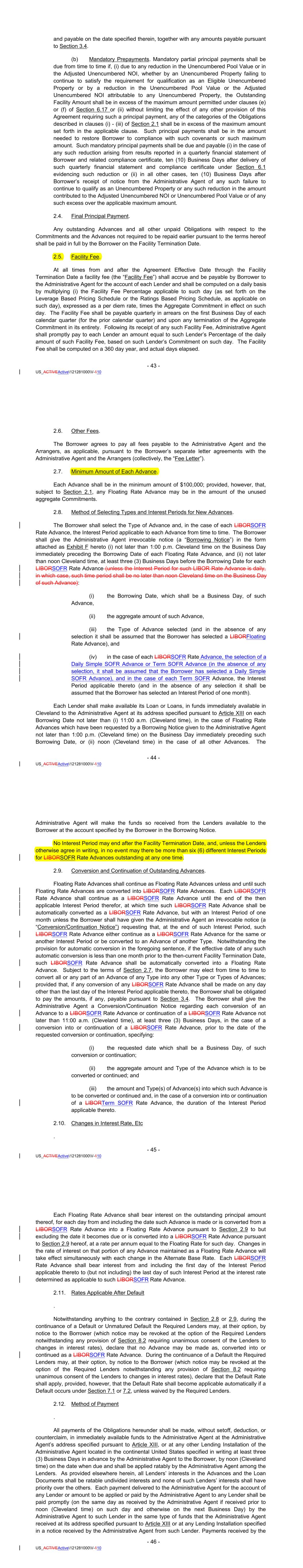 and payable on the date specified therein, together with any amounts payable pursuant to Section 3.4. (b) Mandatory Prepayments. Mandatory partial principal payments shall be due from time to time if, (i) due to any reduction in the Unencumbered Pool Value or in the Adjusted Unencumbered NOI, whether by an Unencumbered Property failing to continue to satisfy the requirement for qualification as an Eligible Unencumbered Property or by a reduction in the Unencumbered Pool Value or the Adjusted Unencumbered NOI attributable to any Unencumbered Property, the Outstanding Facility Amount shall be in excess of the maximum amount permitted under clauses (e) or (f) of Section 6.17 or (ii) without limiting the effect of any other provision of this Agreement requiring such a principal payment, any of the categories of the Obligations described in clauses (i) - (iii) of Section 2.1 shall be in excess of the maximum amount set forth in the applicable clause. Such principal payments shall be in the amount needed to restore Borrower to compliance with such covenants or such maximum amount. Such mandatory principal payments shall be due and payable (i) in the case of any such reduction arising from results reported in a quarterly financial statement of Borrower and related compliance certificate, ten (10) Business Days after delivery of such quarterly financial statement and compliance certificate under Section 6.1 evidencing such reduction or (ii) in all other cases, ten (10) Business Days after Borrower’s receipt of notice from the Administrative Agent of any such failure to continue to qualify as an Unencumbered Property or any such reduction in the amount contributed to the Adjusted Unencumbered NOI or Unencumbered Pool Value or of any such excess over the applicable maximum amount. 2.4. Final Principal Payment. Any outstanding Advances and all other unpaid Obligations with respect to the Commitments and the Advances not required to be repaid earlier pursuant to the terms hereof shall be paid in full by the Borrower on the Facility Termination Date. 2.5. Facility Fee. At all times from and after the Agreement Effective Date through the Facility Termination Date a facility fee (the “Facility Fee”) shall accrue and be payable by Borrower to the Administrative Agent for the account of each Lender and shall be computed on a daily basis by multiplying (i) the Facility Fee Percentage applicable to such day (as set forth on the Leverage Based Pricing Schedule or the Ratings Based Pricing Schedule, as applicable on such day), expressed as a per diem rate, times the Aggregate Commitment in effect on such day. The Facility Fee shall be payable quarterly in arrears on the first Business Day of each calendar quarter (for the prior calendar quarter) and upon any termination of the Aggregate Commitment in its entirety. Following its receipt of any such Facility Fee, Administrative Agent shall promptly pay to each Lender an amount equal to such Lender’s Percentage of the daily amount of such Facility Fee, based on such Lender’s Commitment on such day. The Facility Fee shall be computed on a 360 day year, and actual days elapsed. - 43 - US_ACTIVEActive\121281000\V-110 2.6. Other Fees. The Borrower agrees to pay all fees payable to the Administrative Agent and the Arrangers, as applicable, pursuant to the Borrower’s separate letter agreements with the Administrative Agent and the Arrangers (collectively, the “Fee Letter”). 2.7. Minimum Amount of Each Advance. Each Advance shall be in the minimum amount of $100,000; provided, however, that, subject to Section 2.1, any Floating Rate Advance may be in the amount of the unused aggregate Commitments. 2.8. Method of Selecting Types and Interest Periods for New Advances. The Borrower shall select the Type of Advance and, in the case of each LIBORSOFR Rate Advance, the Interest Period applicable to each Advance from time to time. The Borrower shall give the Administrative Agent irrevocable notice (a “Borrowing Notice”) in the form attached as Exhibit F hereto (i) not later than 1:00 p.m. Cleveland time on the Business Day immediately preceding the Borrowing Date of each Floating Rate Advance, and (ii) not later than noon Cleveland time, at least three (3) Business Days before the Borrowing Date for each LIBORSOFR Rate Advance (unless the Interest Period for such LIBOR Rate Advance is daily, in which case, such time period shall be no later than noon Cleveland time on the Business Day of such Advance): (i) the Borrowing Date, which shall be a Business Day, of such Advance, (ii) the aggregate amount of such Advance, (iii) the Type of Advance selected (and in the absence of any selection it shall be assumed that the Borrower has selected a LIBORFloating Rate Advance), and (iv) in the case of each LIBORSOFR Rate Advance, the selection of a Daily Simple SOFR Advance or Term SOFR Advance (in the absence of any selection, it shall be assumed that the Borrower has selected a Daily Simple SOFR Advance), and in the case of each Term SOFR Advance, the Interest Period applicable thereto (and in the absence of any selection it shall be assumed that the Borrower has selected an Interest Period of one month). Each Lender shall make available its Loan or Loans, in funds immediately available in Cleveland to the Administrative Agent at its address specified pursuant to Article XIII on each Borrowing Date not later than (i) 11:00 a.m. (Cleveland time), in the case of Floating Rate Advances which have been requested by a Borrowing Notice given to the Administrative Agent not later than 1:00 p.m. (Cleveland time) on the Business Day immediately preceding such Borrowing Date, or (ii) noon (Cleveland time) in the case of all other Advances. The - 44 - US_ACTIVEActive\121281000\V-110 Administrative Agent will make the funds so received from the Lenders available to the Borrower at the account specified by the Borrower in the Borrowing Notice. No Interest Period may end after t