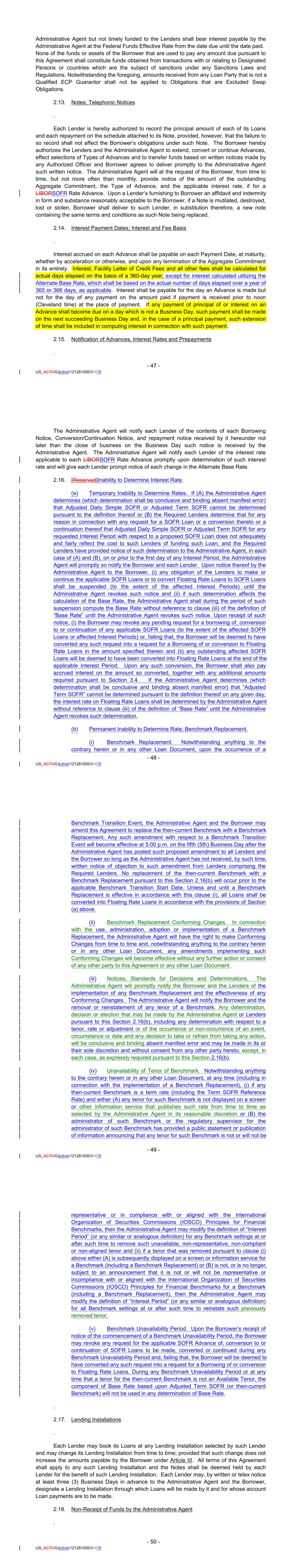 Administrative Agent but not timely funded to the Lenders shall bear interest payable by the Administrative Agent at the Federal Funds Effective Rate from the date due until the date paid. None of the funds or assets of the Borrower that are used to pay any amount due pursuant to this Agreement shall constitute funds obtained from transactions with or relating to Designated Persons or countries which are the subject of sanctions under any Sanctions Laws and Regulations. Notwithstanding the foregoing, amounts received from any Loan Party that is not a Qualified ECP Guarantor shall not be applied to Obligations that are Excluded Swap Obligations. 2.13. Notes; Telephonic Notices . Each Lender is hereby authorized to record the principal amount of each of its Loans and each repayment on the schedule attached to its Note, provided, however, that the failure to so record shall not affect the Borrower’s obligations under such Note. The Borrower hereby authorizes the Lenders and the Administrative Agent to extend, convert or continue Advances, effect selections of Types of Advances and to transfer funds based on written notices made by any Authorized Officer and Borrower agrees to deliver promptly to the Administrative Agent such written notice. The Administrative Agent will at the request of the Borrower, from time to time, but not more often than monthly, provide notice of the amount of the outstanding Aggregate Commitment, the Type of Advance, and the applicable interest rate, if for a LIBORSOFR Rate Advance. Upon a Lender’s furnishing to Borrower an affidavit and indemnity in form and substance reasonably acceptable to the Borrower, if a Note is mutilated, destroyed, lost or stolen, Borrower shall deliver to such Lender, in substitution therefore, a new note containing the same terms and conditions as such Note being replaced. 2.14. Interest Payment Dates; Interest and Fee Basis . Interest accrued on each Advance shall be payable on each Payment Date, at maturity, whether by acceleration or otherwise, and upon any termination of the Aggregate Commitment in its entirety. Interest, Facility Letter of Credit Fees and all other fees shall be calculated for actual days elapsed on the basis of a 360-day year, except for interest calculated utilizing the Alternate Base Rate, which shall be based on the actual number of days elapsed over a year of 365 or 366 days, as applicable. Interest shall be payable for the day an Advance is made but not for the day of any payment on the amount paid if payment is received prior to noon (Cleveland time) at the place of payment. If any payment of principal of or interest on an Advance shall become due on a day which is not a Business Day, such payment shall be made on the next succeeding Business Day and, in the case of a principal payment, such extension of time shall be included in computing interest in connection with such payment. 2.15. Notification of Advances, Interest Rates and Prepayments . - 47 - US_ACTIVEActive\121281000\V-110 The Administrative Agent will notify each Lender of the contents of each Borrowing Notice, Conversion/Continuation Notice, and repayment notice received by it hereunder not later than the close of business on the Business Day such notice is received by the Administrative Agent. The Administrative Agent will notify each Lender of the interest rate applicable to each LIBORSOFR Rate Advance promptly upon determination of such interest rate and will give each Lender prompt notice of each change in the Alternate Base Rate. 2.16. [Reserved]Inability to Determine Interest Rate. (a) Temporary Inability to Determine Rates. If (A) the Administrative Agent determines (which determination shall be conclusive and binding absent manifest error) that Adjusted Daily Simple SOFR or Adjusted Term SOFR cannot be determined pursuant to the definition thereof or (B) the Required Lenders determine that for any reason in connection with any request for a SOFR Loan or a conversion thereto or a continuation thereof that Adjusted Daily Simple SOFR or Adjusted Term SOFR for any requested Interest Period with respect to a proposed SOFR Loan does not adequately and fairly reflect the cost to such Lenders of funding such Loan, and the Required Lenders have provided notice of such determination to the Administrative Agent, in each case of (A) and (B), on or prior to the first day of any Interest Period, the Administrative Agent will promptly so notify the Borrower and each Lender. Upon notice thereof by the Administrative Agent to the Borrower, (i) any obligation of the Lenders to make or continue the applicable SOFR Loans or to convert Floating Rate Loans to SOFR Loans shall be suspended (to the extent of the affected Interest Periods) until the Administrative Agent revokes such notice and (ii) if such determination affects the calculation of the Base Rate, the Administrative Agent shall during the period of such suspension compute the Base Rate without reference to clause (iii) of the definition of “Base Rate” until the Administrative Agent revokes such notice. Upon receipt of such notice, (i) the Borrower may revoke any pending request for a borrowing of, conversion to or continuation of any applicable SOFR Loans (to the extent of the affected SOFR Loans or affected Interest Periods) or, failing that, the Borrower will be deemed to have converted any such request into a request for a Borrowing of or conversion to Floating Rate Loans in the amount specified therein and (ii) any outstanding affected SOFR Loans will be deemed to have been converted into Floating Rate Loans at the end of the applicable Interest Period. Upon any such conversion, the Borrower shall also pay accrued interest on the amount so converted, together with any additional amounts required pursuant to Section 3.4. If the Administrative Agent determines (which determination shall be conclusive and binding absent manifest error) that “Adjusted Term SOFR” cannot be determined pursu