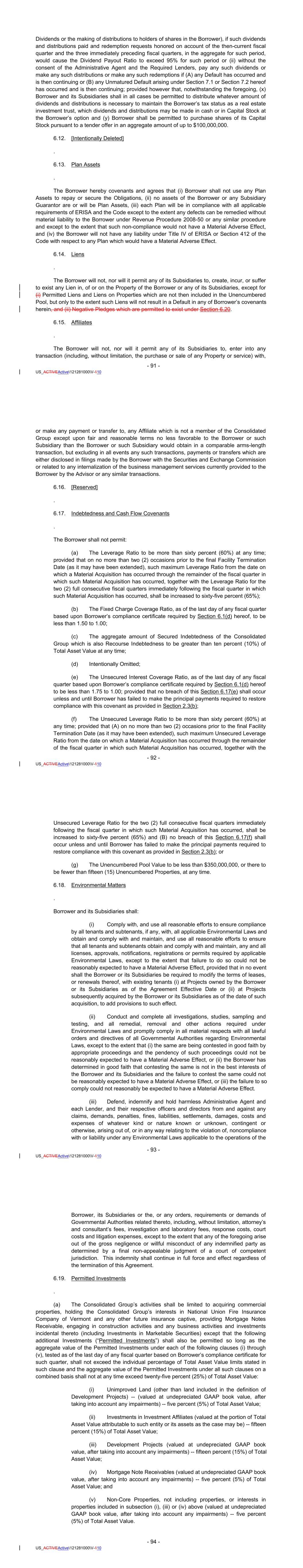 Dividends or the making of distributions to holders of shares in the Borrower), if such dividends and distributions paid and redemption requests honored on account of the then-current fiscal quarter and the three immediately preceding fiscal quarters, in the aggregate for such period, would cause the Dividend Payout Ratio to exceed 95% for such period or (ii) without the consent of the Administrative Agent and the Required Lenders, pay any such dividends or make any such distributions or make any such redemptions if (A) any Default has occurred and is then continuing or (B) any Unmatured Default arising under Section 7.1 or Section 7.2 hereof has occurred and is then continuing; provided however that, notwithstanding the foregoing, (x) Borrower and its Subsidiaries shall in all cases be permitted to distribute whatever amount of dividends and distributions is necessary to maintain the Borrower’s tax status as a real estate investment trust, which dividends and distributions may be made in cash or in Capital Stock at the Borrower’s option and (y) Borrower shall be permitted to purchase shares of its Capital Stock pursuant to a tender offer in an aggregate amount of up to $100,000,000. 6.12. [Intentionally Deleted] . 6.13. Plan Assets . The Borrower hereby covenants and agrees that (i) Borrower shall not use any Plan Assets to repay or secure the Obligations, (ii) no assets of the Borrower or any Subsidiary Guarantor are or will be Plan Assets, (iii) each Plan will be in compliance with all applicable requirements of ERISA and the Code except to the extent any defects can be remedied without material liability to the Borrower under Revenue Procedure 2008-50 or any similar procedure and except to the extent that such non-compliance would not have a Material Adverse Effect, and (iv) the Borrower will not have any liability under Title IV of ERISA or Section 412 of the Code with respect to any Plan which would have a Material Adverse Effect. 6.14. Liens . The Borrower will not, nor will it permit any of its Subsidiaries to, create, incur, or suffer to exist any Lien in, of or on the Property of the Borrower or any of its Subsidiaries, except for (i) Permitted Liens and Liens on Properties which are not then included in the Unencumbered Pool, but only to the extent such Liens will not result in a Default in any of Borrower’s covenants herein, and (ii) Negative Pledges which are permitted to exist under Section 6.20. 6.15. Affiliates . The Borrower will not, nor will it permit any of its Subsidiaries to, enter into any transaction (including, without limitation, the purchase or sale of any Property or service) with, - 91 - US_ACTIVEActive\121281000\V-110 or make any payment or transfer to, any Affiliate which is not a member of the Consolidated Group except upon fair and reasonable terms no less favorable to the Borrower or such Subsidiary than the Borrower or such Subsidiary would obtain in a comparable arms-length transaction, but excluding in all events any such transactions, payments or transfers which are either disclosed in filings made by the Borrower with the Securities and Exchange Commission or related to any internalization of the business management services currently provided to the Borrower by the Advisor or any similar transactions. 6.16. [Reserved] . 6.17. Indebtedness and Cash Flow Covenants . The Borrower shall not permit: (a) The Leverage Ratio to be more than sixty percent (60%) at any time; provided that on no more than two (2) occasions prior to the final Facility Termination Date (as it may have been extended), such maximum Leverage Ratio from the date on which a Material Acquisition has occurred through the remainder of the fiscal quarter in which such Material Acquisition has occurred, together with the Leverage Ratio for the two (2) full consecutive fiscal quarters immediately following the fiscal quarter in which such Material Acquisition has occurred, shall be increased to sixty-five percent (65%); (b) The Fixed Charge Coverage Ratio, as of the last day of any fiscal quarter based upon Borrower’s compliance certificate required by Section 6.1(d) hereof, to be less than 1.50 to 1.00; (c) The aggregate amount of Secured Indebtedness of the Consolidated Group which is also Recourse Indebtedness to be greater than ten percent (10%) of Total Asset Value at any time; (d) Intentionally Omitted; (e) The Unsecured Interest Coverage Ratio, as of the last day of any fiscal quarter based upon Borrower’s compliance certificate required by Section 6.1(d) hereof to be less than 1.75 to 1.00; provided that no breach of this Section 6.17(e) shall occur unless and until Borrower has failed to make the principal payments required to restore compliance with this covenant as provided in Section 2.3(b); (f) The Unsecured Leverage Ratio to be more than sixty percent (60%) at any time; provided that (A) on no more than two (2) occasions prior to the final Facility Termination Date (as it may have been extended), such maximum Unsecured Leverage Ratio from the date on which a Material Acquisition has occurred through the remainder of the fiscal quarter in which such Material Acquisition has occurred, together with the - 92 - US_ACTIVEActive\121281000\V-110 Unsecured Leverage Ratio for the two (2) full consecutive fiscal quarters immediately following the fiscal quarter in which such Material Acquisition has occurred, shall be increased to sixty-five percent (65%) and (B) no breach of this Section 6.17(f) shall occur unless and until Borrower has failed to make the principal payments required to restore compliance with this covenant as provided in Section 2.3(b); or (g) The Unencumbered Pool Value to be less than $350,000,000, or there to be fewer than fifteen (15) Unencumbered Properties, at any time. 6.18. Environmental Matters . Borrower and its Subsidiaries shall: (i) Comply with, and use all reasonable efforts to ensure compliance by all tenants and subtenants, if any, with, all