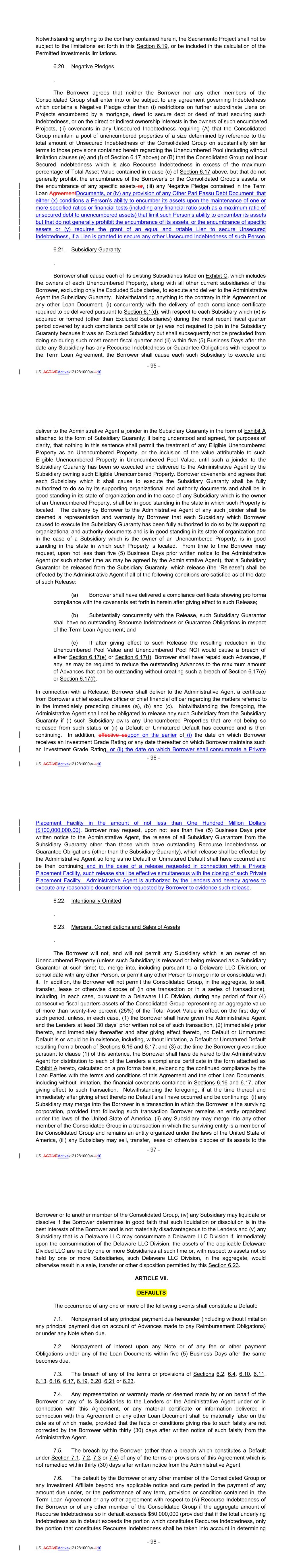Notwithstanding anything to the contrary contained herein, the Sacramento Project shall not be subject to the limitations set forth in this Section 6.19, or be included in the calculation of the Permitted Investments limitations. 6.20. Negative Pledges . The Borrower agrees that neither the Borrower nor any other members of the Consolidated Group shall enter into or be subject to any agreement governing Indebtedness which contains a Negative Pledge other than (i) restrictions on further subordinate Liens on Projects encumbered by a mortgage, deed to secure debt or deed of trust securing such Indebtedness, or on the direct or indirect ownership interests in the owners of such encumbered Projects, (ii) covenants in any Unsecured Indebtedness requiring (A) that the Consolidated Group maintain a pool of unencumbered properties of a size determined by reference to the total amount of Unsecured Indebtedness of the Consolidated Group on substantially similar terms to those provisions contained herein regarding the Unencumbered Pool (including without limitation clauses (e) and (f) of Section 6.17 above) or (B) that the Consolidated Group not incur Secured Indebtedness which is also Recourse Indebtedness in excess of the maximum percentage of Total Asset Value contained in clause (c) of Section 6.17 above, but that do not generally prohibit the encumbrance of the Borrower’s or the Consolidated Group’s assets, or the encumbrance of any specific assets or, (iii) any Negative Pledge contained in the Term Loan AgreementDocuments, or (iv) any provision of any Other Pari Passu Debt Document that either (x) conditions a Person’s ability to encumber its assets upon the maintenance of one or more specified ratios or financial tests (including any financial ratio such as a maximum ratio of unsecured debt to unencumbered assets) that limit such Person’s ability to encumber its assets but that do not generally prohibit the encumbrance of its assets, or the encumbrance of specific assets or (y) requires the grant of an equal and ratable Lien to secure Unsecured Indebtedness, if a Lien is granted to secure any other Unsecured Indebtedness of such Person. 6.21. Subsidiary Guaranty . Borrower shall cause each of its existing Subsidiaries listed on Exhibit C, which includes the owners of each Unencumbered Property, along with all other current subsidiaries of the Borrower, excluding only the Excluded Subsidiaries, to execute and deliver to the Administrative Agent the Subsidiary Guaranty. Notwithstanding anything to the contrary in this Agreement or any other Loan Document, (i) concurrently with the delivery of each compliance certificate required to be delivered pursuant to Section 6.1(d), with respect to each Subsidiary which (x) is acquired or formed (other than Excluded Subsidiaries) during the most recent fiscal quarter period covered by such compliance certificate or (y) was not required to join in the Subsidiary Guaranty because it was an Excluded Subsidiary but shall subsequently not be precluded from doing so during such most recent fiscal quarter and (ii) within five (5) Business Days after the date any Subsidiary has any Recourse Indebtedness or Guarantee Obligations with respect to the Term Loan Agreement, the Borrower shall cause each such Subsidiary to execute and - 95 - US_ACTIVEActive\121281000\V-110 deliver to the Administrative Agent a joinder in the Subsidiary Guaranty in the form of Exhibit A attached to the form of Subsidiary Guaranty; it being understood and agreed, for purposes of clarity, that nothing in this sentence shall permit the treatment of any Eligible Unencumbered Property as an Unencumbered Property, or the inclusion of the value attributable to such Eligible Unencumbered Property in Unencumbered Pool Value, until such a joinder to the Subsidiary Guaranty has been so executed and delivered to the Administrative Agent by the Subsidiary owning such Eligible Unencumbered Property. Borrower covenants and agrees that each Subsidiary which it shall cause to execute the Subsidiary Guaranty shall be fully authorized to do so by its supporting organizational and authority documents and shall be in good standing in its state of organization and in the case of any Subsidiary which is the owner of an Unencumbered Property, shall be in good standing in the state in which such Property is located. The delivery by Borrower to the Administrative Agent of any such joinder shall be deemed a representation and warranty by Borrower that each Subsidiary which Borrower caused to execute the Subsidiary Guaranty has been fully authorized to do so by its supporting organizational and authority documents and is in good standing in its state of organization and in the case of a Subsidiary which is the owner of an Unencumbered Property, is in good standing in the state in which such Property is located. From time to time Borrower may request, upon not less than five (5) Business Days prior written notice to the Administrative Agent (or such shorter time as may be agreed by the Administrative Agent), that a Subsidiary Guarantor be released from the Subsidiary Guaranty, which release (the “Release”) shall be effected by the Administrative Agent if all of the following conditions are satisfied as of the date of such Release: (a) Borrower shall have delivered a compliance certificate showing pro forma compliance with the covenants set forth in herein after giving effect to such Release; (b) Substantially concurrently with the Release, such Subsidiary Guarantor shall have no outstanding Recourse Indebtedness or Guarantee Obligations in respect of the Term Loan Agreement; and (c) If after giving effect to such Release the resulting reduction in the Unencumbered Pool Value and Unencumbered Pool NOI would cause a breach of either Section 6.17(e) or Section 6.17(f), Borrower shall have repaid such Advances, if any, as may be required to reduce the outstanding Advances to the maximum amount of Advances t