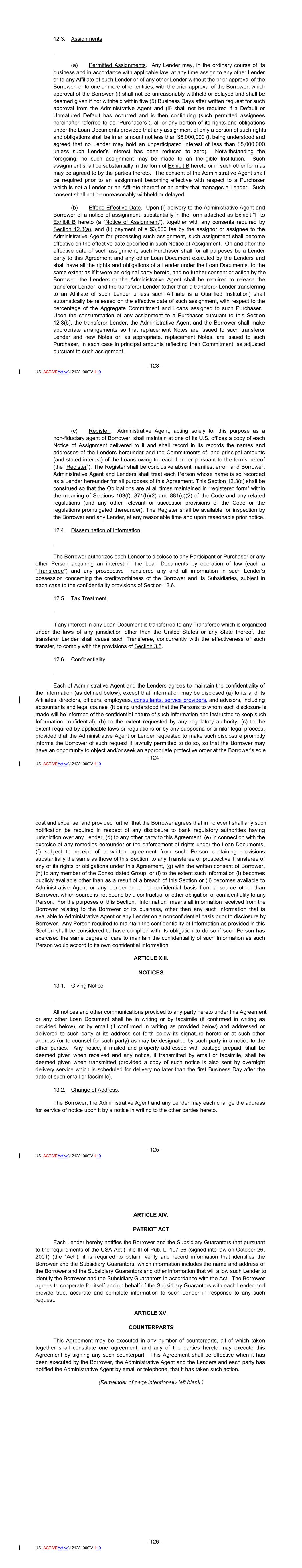12.3. Assignments . (a) Permitted Assignments. Any Lender may, in the ordinary course of its business and in accordance with applicable law, at any time assign to any other Lender or to any Affiliate of such Lender or of any other Lender without the prior approval of the Borrower, or to one or more other entities, with the prior approval of the Borrower, which approval of the Borrower (i) shall not be unreasonably withheld or delayed and shall be deemed given if not withheld within five (5) Business Days after written request for such approval from the Administrative Agent and (ii) shall not be required if a Default or Unmatured Default has occurred and is then continuing (such permitted assignees hereinafter referred to as “Purchasers”), all or any portion of its rights and obligations under the Loan Documents provided that any assignment of only a portion of such rights and obligations shall be in an amount not less than $5,000,000 (it being understood and agreed that no Lender may hold an unparticipated interest of less than $5,000,000 unless such Lender’s interest has been reduced to zero). Notwithstanding the foregoing, no such assignment may be made to an Ineligible Institution. Such assignment shall be substantially in the form of Exhibit B hereto or in such other form as may be agreed to by the parties thereto. The consent of the Administrative Agent shall be required prior to an assignment becoming effective with respect to a Purchaser which is not a Lender or an Affiliate thereof or an entity that manages a Lender. Such consent shall not be unreasonably withheld or delayed. (b) Effect; Effective Date. Upon (i) delivery to the Administrative Agent and Borrower of a notice of assignment, substantially in the form attached as Exhibit “I” to Exhibit B hereto (a “Notice of Assignment”), together with any consents required by Section 12.3(a), and (ii) payment of a $3,500 fee by the assignor or assignee to the Administrative Agent for processing such assignment, such assignment shall become effective on the effective date specified in such Notice of Assignment. On and after the effective date of such assignment, such Purchaser shall for all purposes be a Lender party to this Agreement and any other Loan Document executed by the Lenders and shall have all the rights and obligations of a Lender under the Loan Documents, to the same extent as if it were an original party hereto, and no further consent or action by the Borrower, the Lenders or the Administrative Agent shall be required to release the transferor Lender, and the transferor Lender (other than a transferor Lender transferring to an Affiliate of such Lender unless such Affiliate is a Qualified Institution) shall automatically be released on the effective date of such assignment, with respect to the percentage of the Aggregate Commitment and Loans assigned to such Purchaser. Upon the consummation of any assignment to a Purchaser pursuant to this Section 12.3(b), the transferor Lender, the Administrative Agent and the Borrower shall make appropriate arrangements so that replacement Notes are issued to such transferor Lender and new Notes or, as appropriate, replacement Notes, are issued to such Purchaser, in each case in principal amounts reflecting their Commitment, as adjusted pursuant to such assignment. - 123 - US_ACTIVEActive\121281000\V-110 (c) Register. Administrative Agent, acting solely for this purpose as a non-fiduciary agent of Borrower, shall maintain at one of its U.S. offices a copy of each Notice of Assignment delivered to it and shall record in its records the names and addresses of the Lenders hereunder and the Commitments of, and principal amounts (and stated interest) of the Loans owing to, each Lender pursuant to the terms hereof (the “Register”). The Register shall be conclusive absent manifest error, and Borrower, Administrative Agent and Lenders shall treat each Person whose name is so recorded as a Lender hereunder for all purposes of this Agreement. This Section 12.3(c) shall be construed so that the Obligations are at all times maintained in “registered form” within the meaning of Sections 163(f), 871(h)(2) and 881(c)(2) of the Code and any related regulations (and any other relevant or successor provisions of the Code or the regulations promulgated thereunder). The Register shall be available for inspection by the Borrower and any Lender, at any reasonable time and upon reasonable prior notice. 12.4. Dissemination of Information . The Borrower authorizes each Lender to disclose to any Participant or Purchaser or any other Person acquiring an interest in the Loan Documents by operation of law (each a “Transferee”) and any prospective Transferee any and all information in such Lender’s possession concerning the creditworthiness of the Borrower and its Subsidiaries, subject in each case to the confidentiality provisions of Section 12.6. 12.5. Tax Treatment . If any interest in any Loan Document is transferred to any Transferee which is organized under the laws of any jurisdiction other than the United States or any State thereof, the transferor Lender shall cause such Transferee, concurrently with the effectiveness of such transfer, to comply with the provisions of Section 3.5. 12.6. Confidentiality . Each of Administrative Agent and the Lenders agrees to maintain the confidentiality of the Information (as defined below), except that Information may be disclosed (a) to its and its Affiliates’ directors, officers, employees, consultants, service providers, and advisors, including accountants and legal counsel (it being understood that the Persons to whom such disclosure is made will be informed of the confidential nature of such Information and instructed to keep such Information confidential), (b) to the extent requested by any regulatory authority, (c) to the extent required by applicable laws or regulations or by any subpoena or similar legal process, provided that the Adm