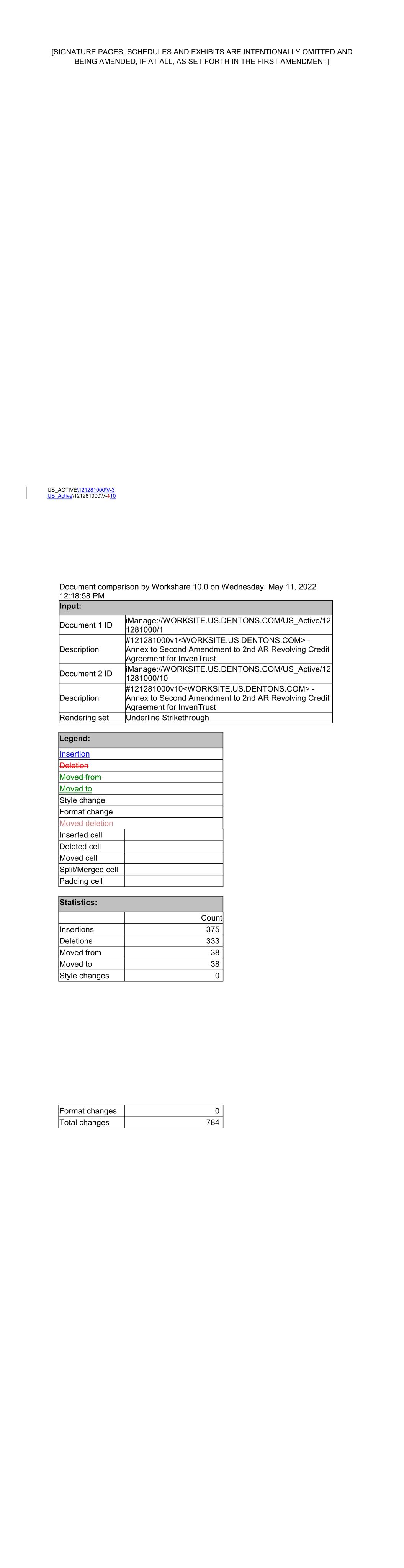 [SIGNATURE PAGES, SCHEDULES AND EXHIBITS ARE INTENTIONALLY OMITTED AND BEING AMENDED, IF AT ALL, AS SET FORTH IN THE FIRST AMENDMENT] US_ACTIVE\121281000\V-3 US_Active\121281000\V-110 Input: Rendering set Inserted cell Description Underline Strikethrough Deleted cell #121281000v1<WORKSITE.US.DENTONS.COM> - Annex to Second Amendment to 2nd AR Revolving Credit Agreement for InvenTrust Moved cell Legend: Split/Merged cell Insertion Document comparison by Workshare 10.0 on Wednesday, May 11, 2022 12:18:58 PM Padding cell Document 2 ID Deletion Statistics: Document 1 ID iManage://WORKSITE.US.DENTONS.COM/US_Active/12 1281000/10 Count Moved from Insertions 375 Moved to Deletions iManage://WORKSITE.US.DENTONS.COM/US_Active/12 1281000/1 333 Description Moved from Style change 38 Moved to #121281000v10<WORKSITE.US.DENTONS.COM> - Annex to Second Amendment to 2nd AR Revolving Credit Agreement for InvenTrust 38 Format change Style changes 0 Moved deletion Total changes Format changes 784 0