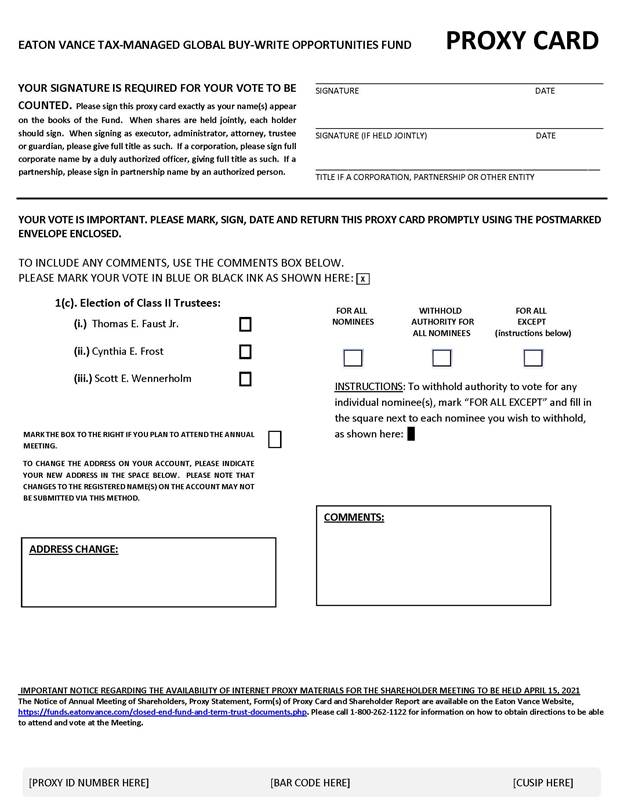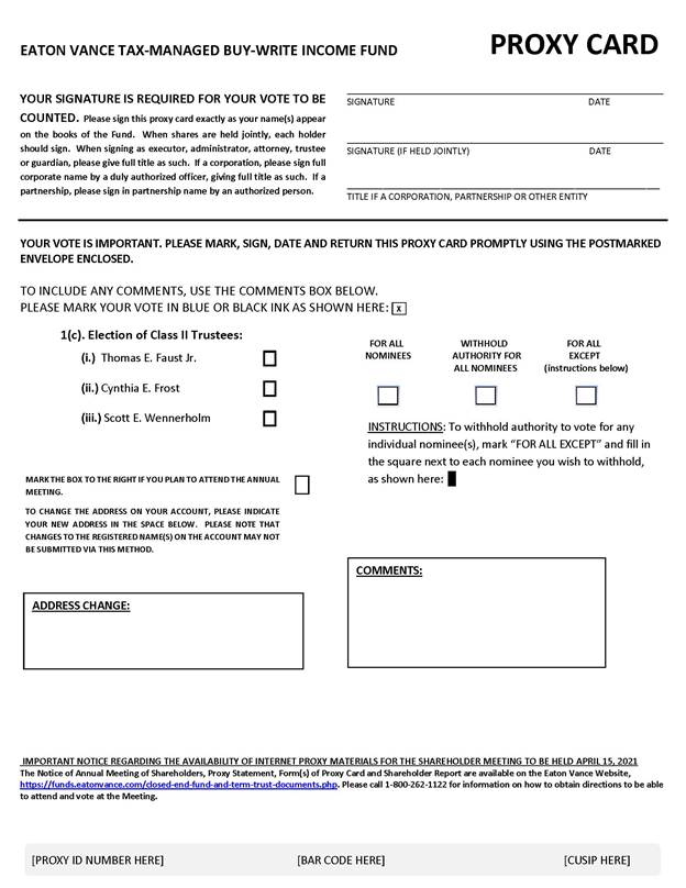 | b. | For Eaton Vance Tax-Managed Buy-Write Income Fund, Eaton Vance Tax-Managed Buy-Write Opportunities Fund and Eaton Vance Tax-Managed Global Buy-Write Opportunities Fund, three Class I Trustees, Thomas E. Faust Jr., Cynthia E. Frost and Scott E. Wennerholm, to be elected by shareholders of each Fund; and | ||