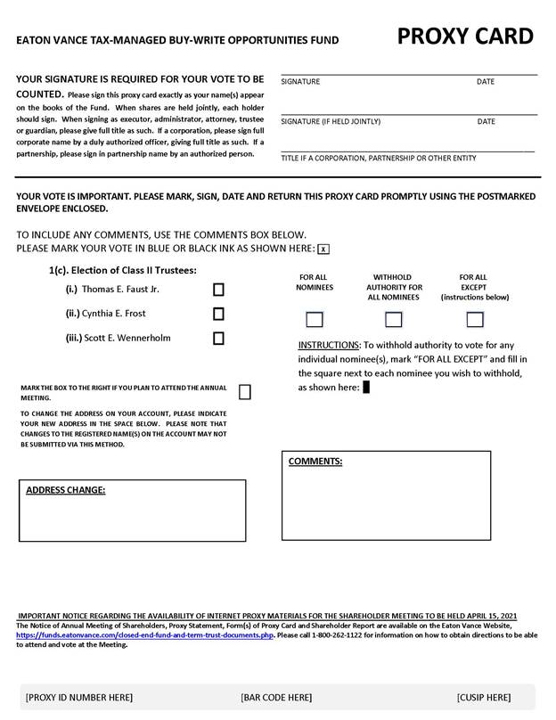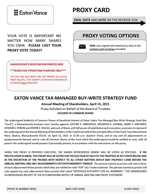 | c. | For Eaton Vance Tax-Managed Buy-Write Strategy Fund, four Class II Trustees, George J. Gorman, William H. Park, Keith Quinton and Susan J. Sutherland, to be elected by shareholders of the Fund. | ||