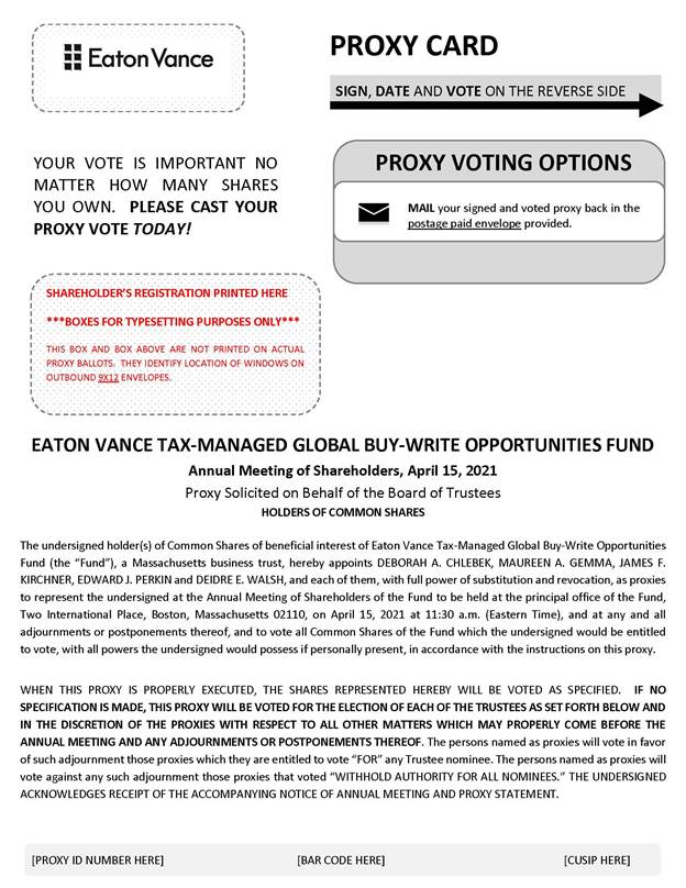 This proxy statement is furnished in connection with the solicitation of proxies by the Board of Trustees of Eaton Vance Enhanced Equity Income Fund II (the “Enhanced Equity Fund”), Eaton Vance Risk-Managed Diversified Equity Income Fund (the “Risk-Managed Fund”), Eaton Vance Tax-Managed Buy-Write Income Fund (the “Buy-Write Income Fund”), Eaton Vance Tax-Managed Buy-Write Opportunities Fund (the “Buy-Write Opportunities Fund”), Eaton Vance Tax-Managed Buy-Write Strategy Fund (the “Buy-Write Strategy Fund”) and Eaton Vance Tax-Managed Global Buy-Write Opportunities Fund (the “Global Buy-Write Opportunities Fund”) (collectively, the “Funds”). The proxies will be voted at the Annual Meeting of Shareholders of each Fund and at any adjournments or postponements thereof. The meeting will be held on Thursday, April 15, 2021 at 11:30 a.m. (Eastern Time) at the principal office of each Fund, Two International Place, Boston, Massachusetts 02110. The meeting will be held for the purposes set forth in the accompanying notice. This proxy material is being mailed to shareholders on or about February 23, 2021.